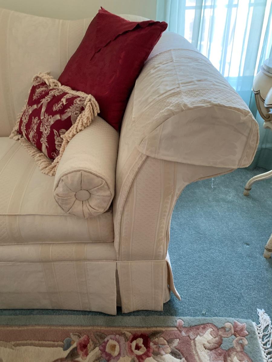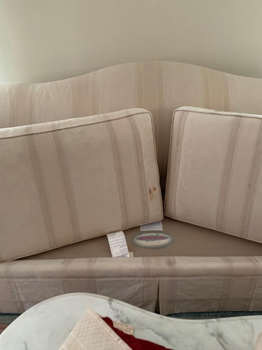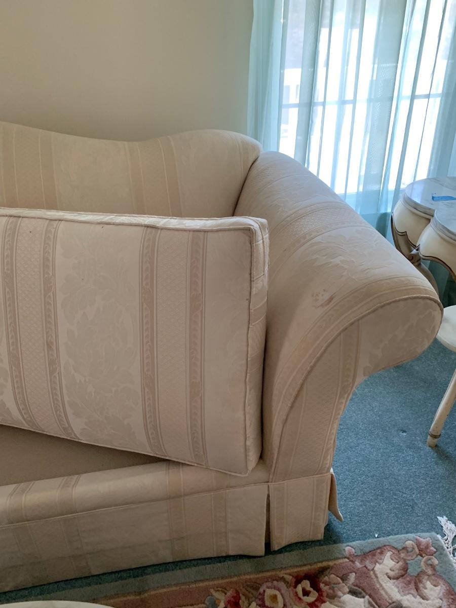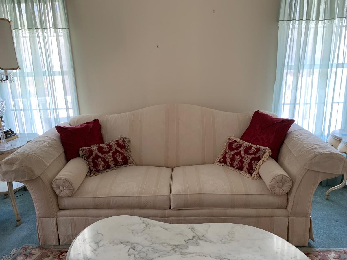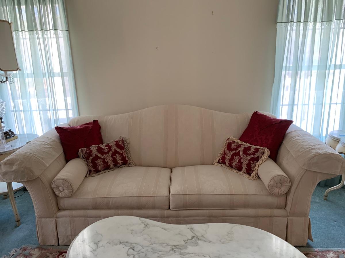 Comfy cream colored sofa in good condition. Any noted stains or conditon issues have been pictures. This is for the sofa only and does NOT included the coffee table. Measures 52 x 35 x 15.