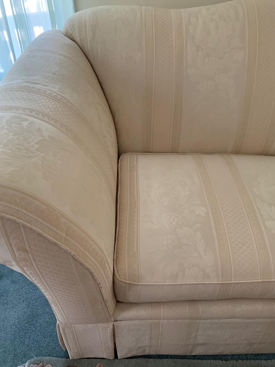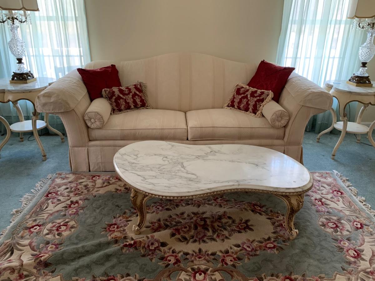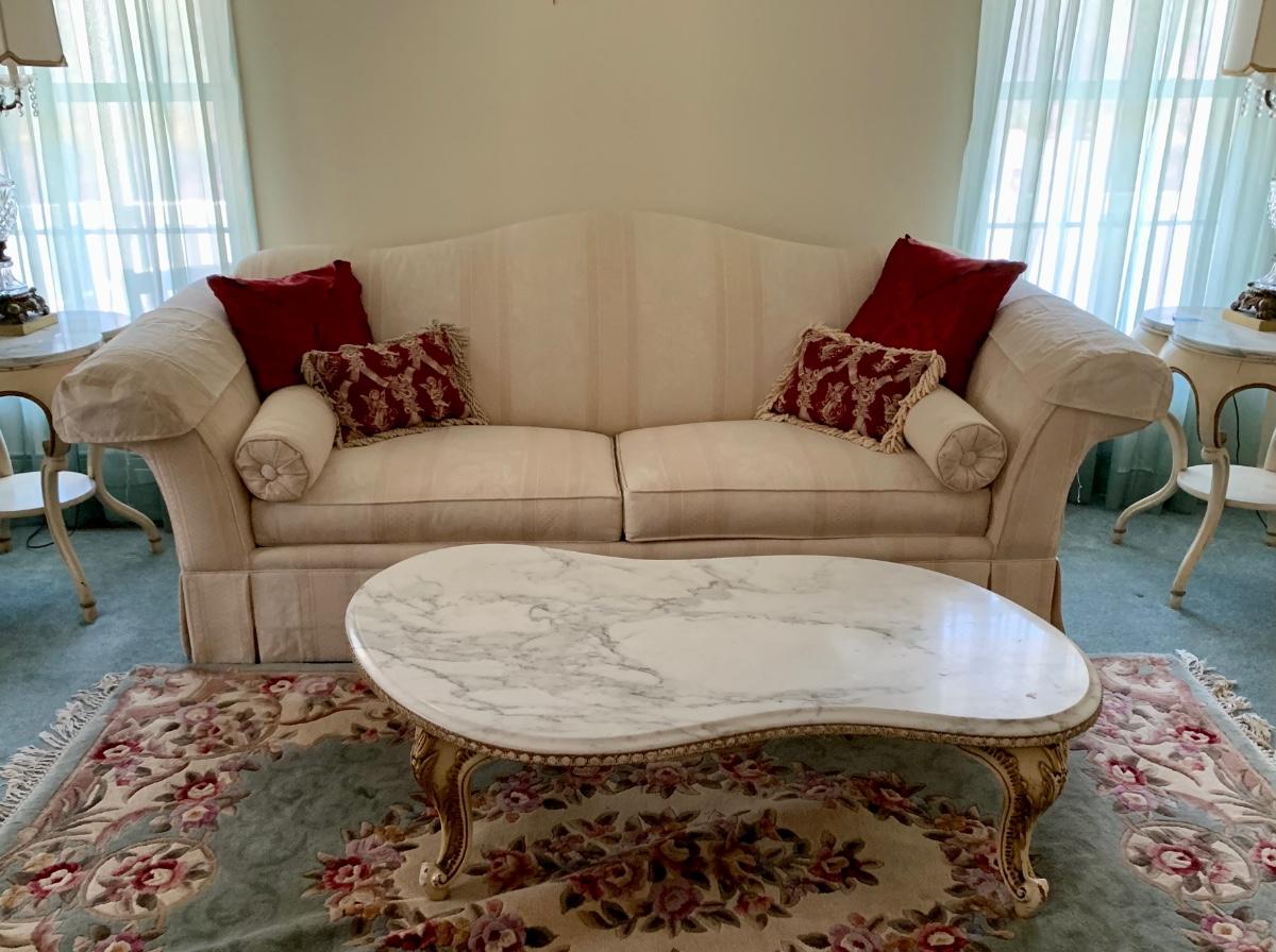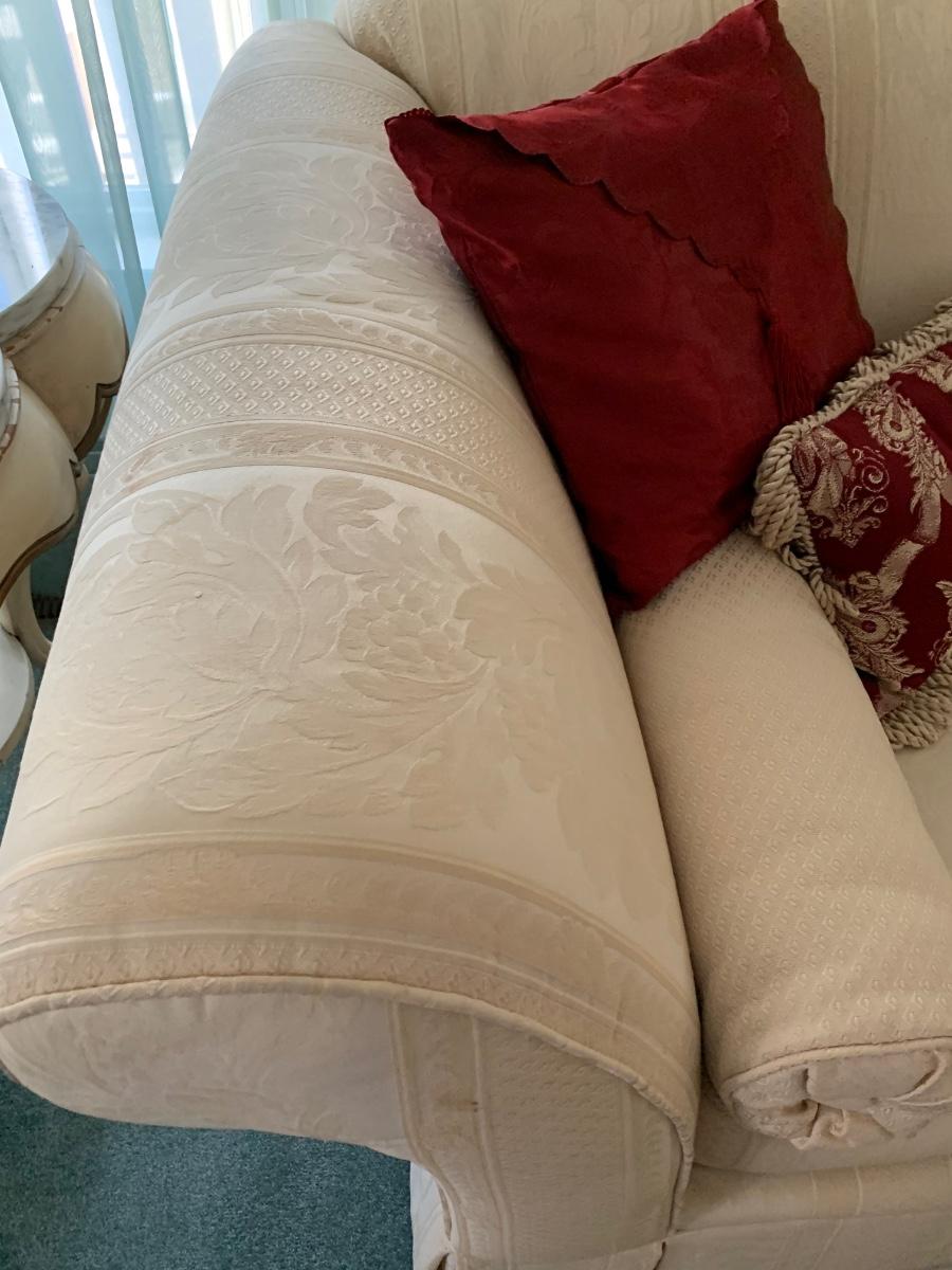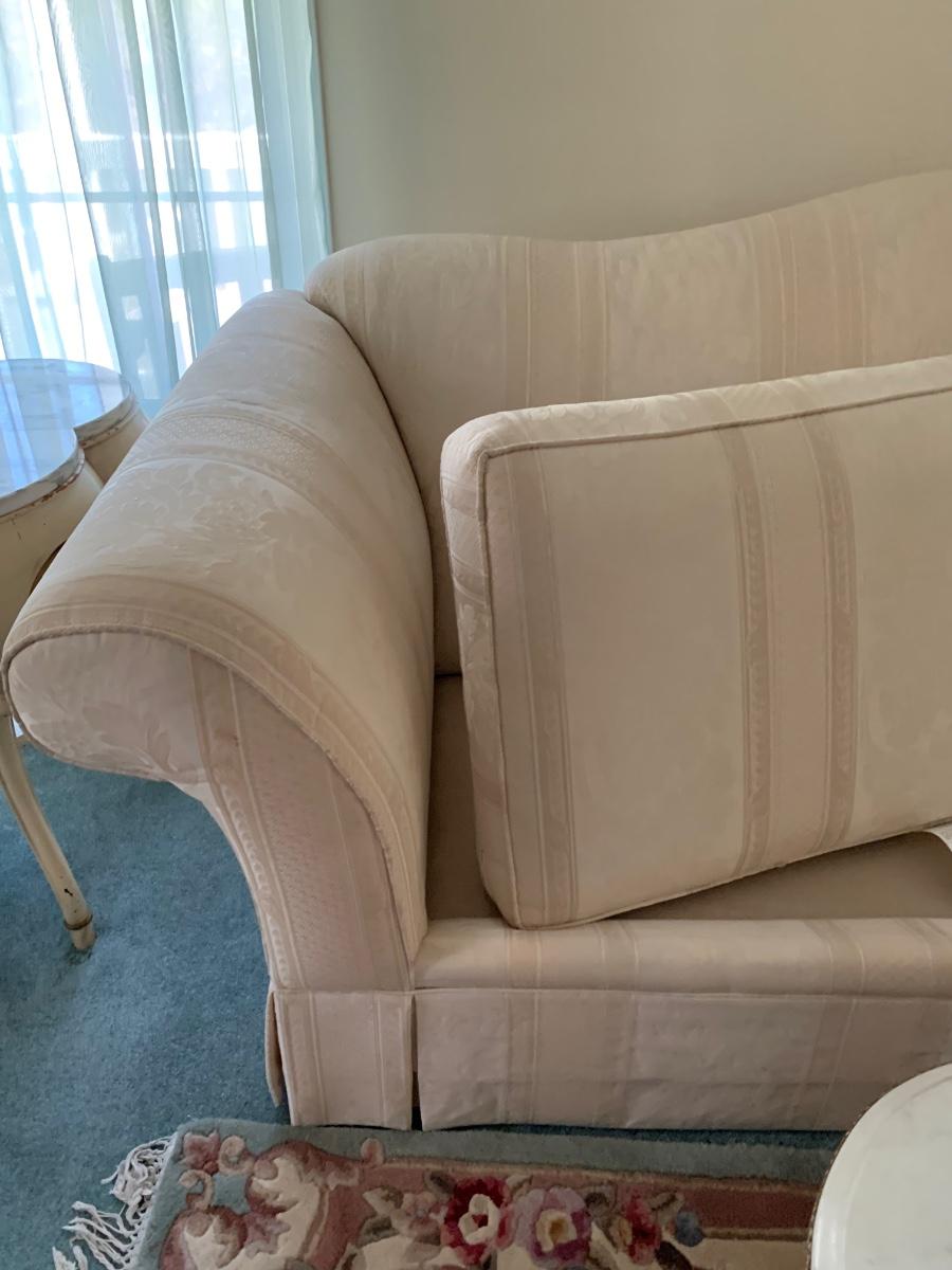 Comfy cream colored sofa in good condition. Any noted stains or conditon issues have been pictures. This is for the sofa only and does NOT included the coffee table. Measures 52 x 35 x 15.