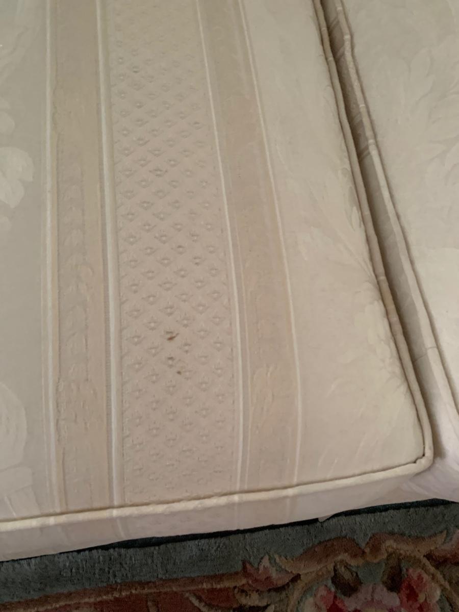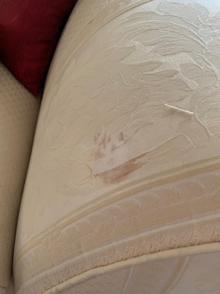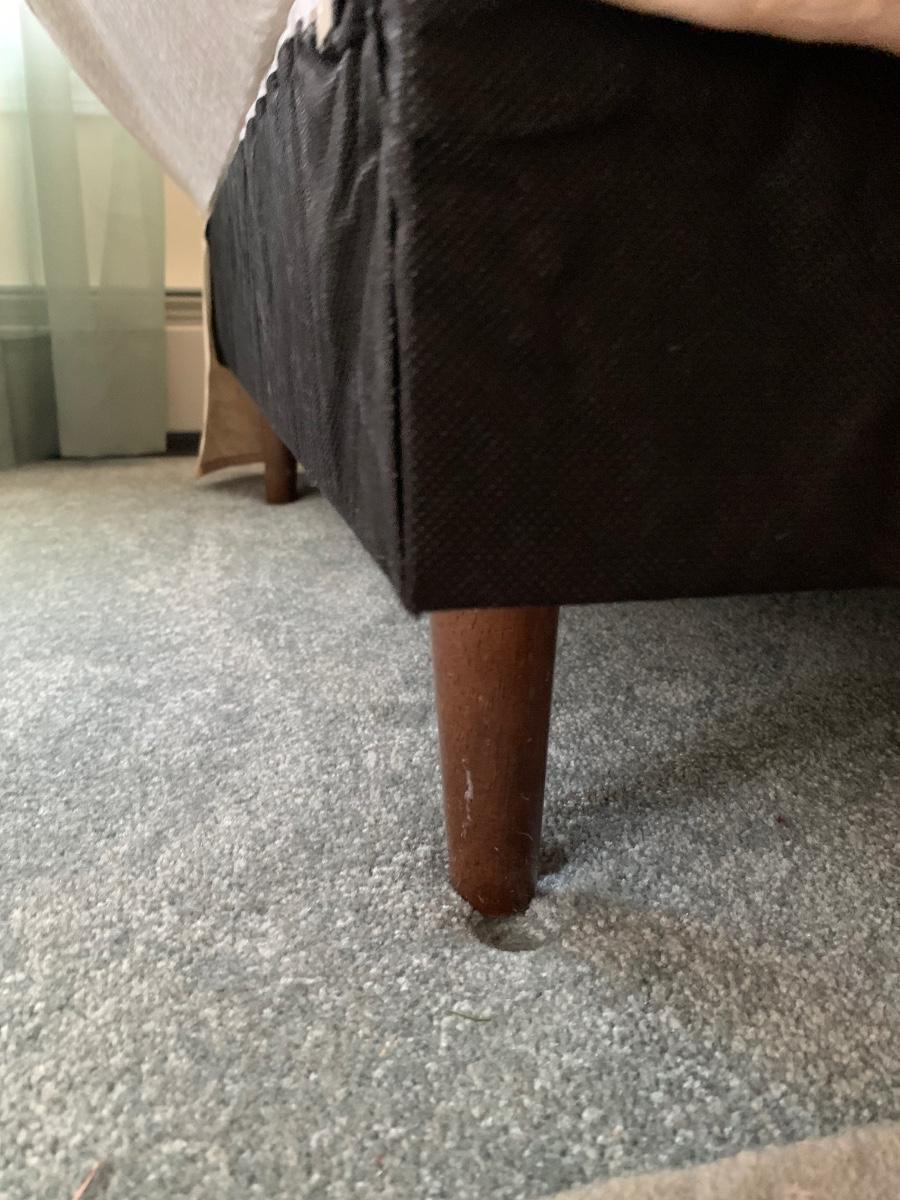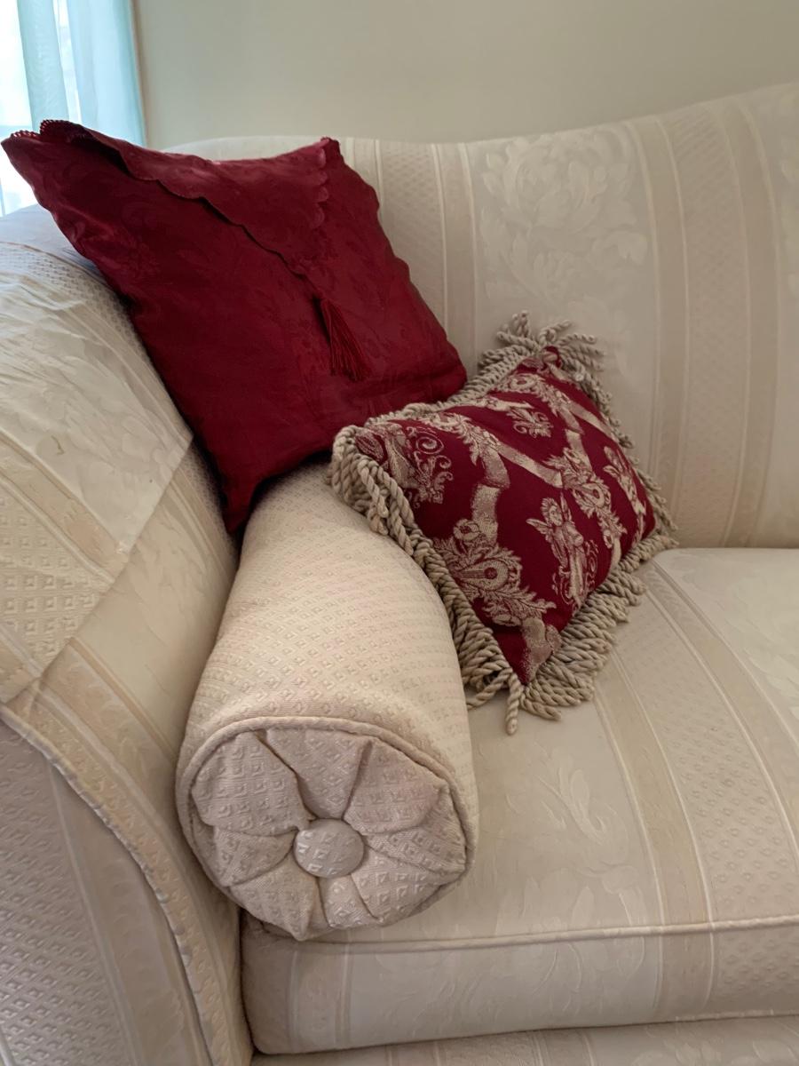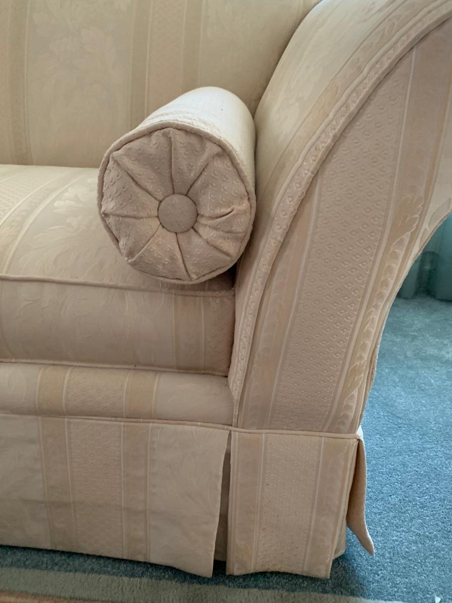 Comfy cream colored sofa in good condition. Any noted stains or conditon issues have been pictures. This is for the sofa only and does NOT included the coffee table. Measures 52 x 35 x 15.