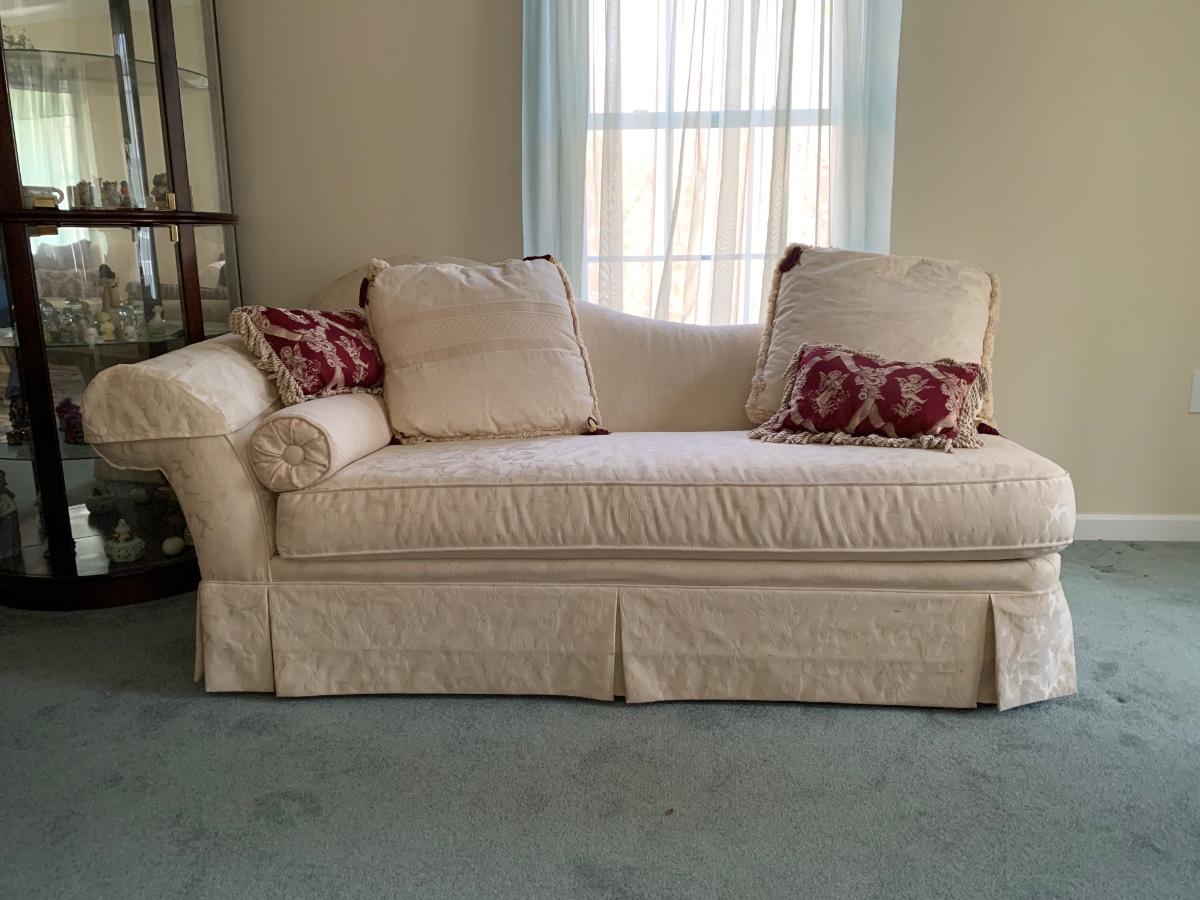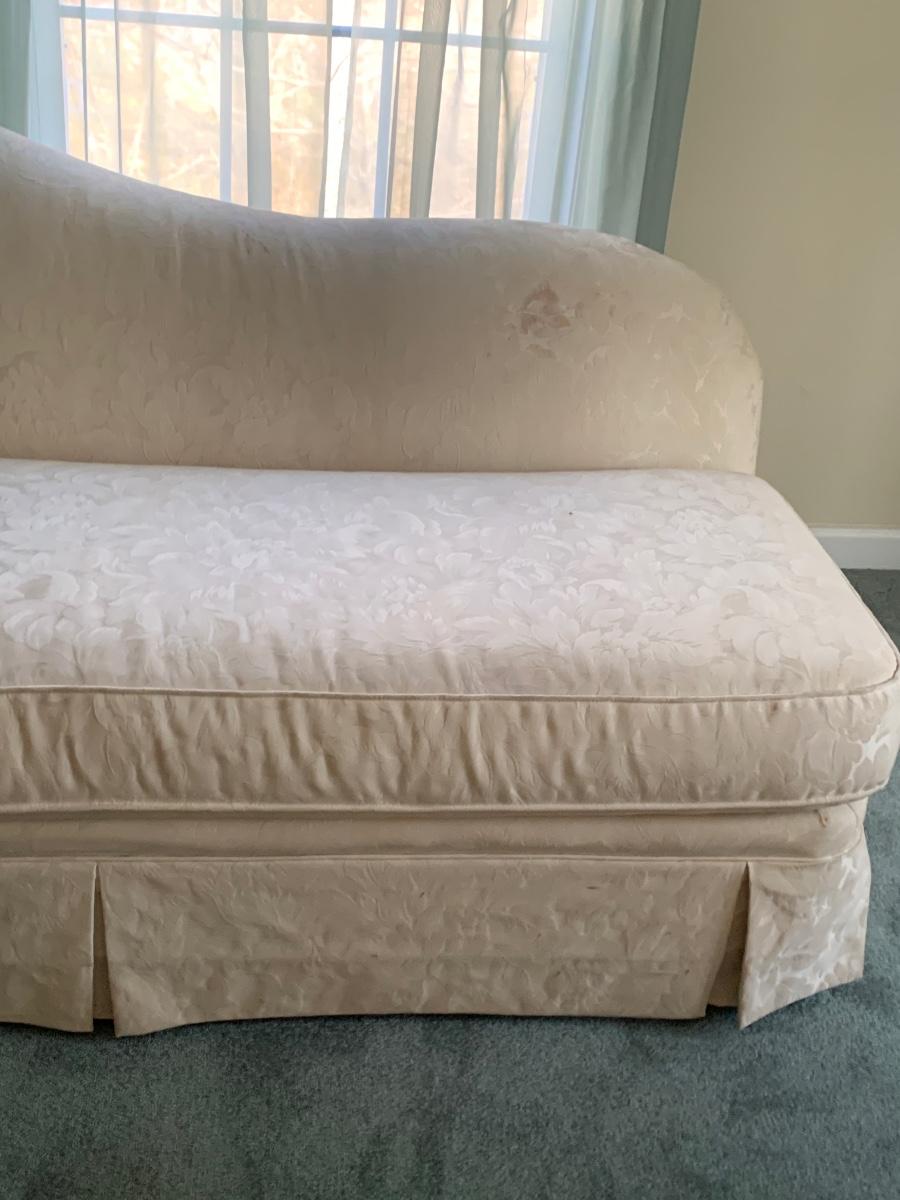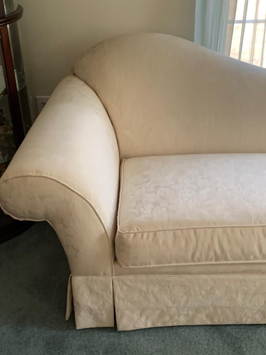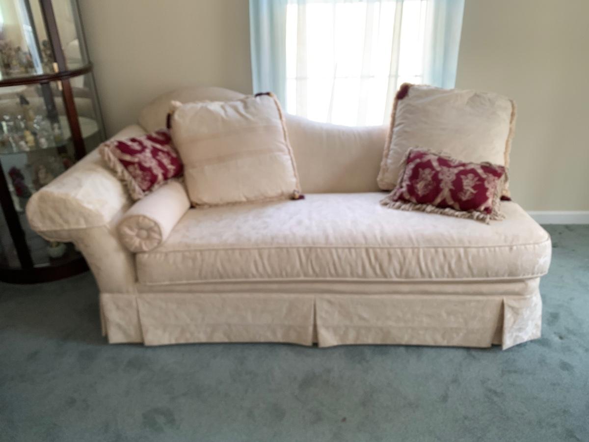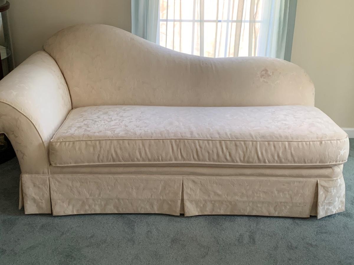 Comfy cream colored chaise lounge in good condition. Any noted stains or conditon issues have been pictures
