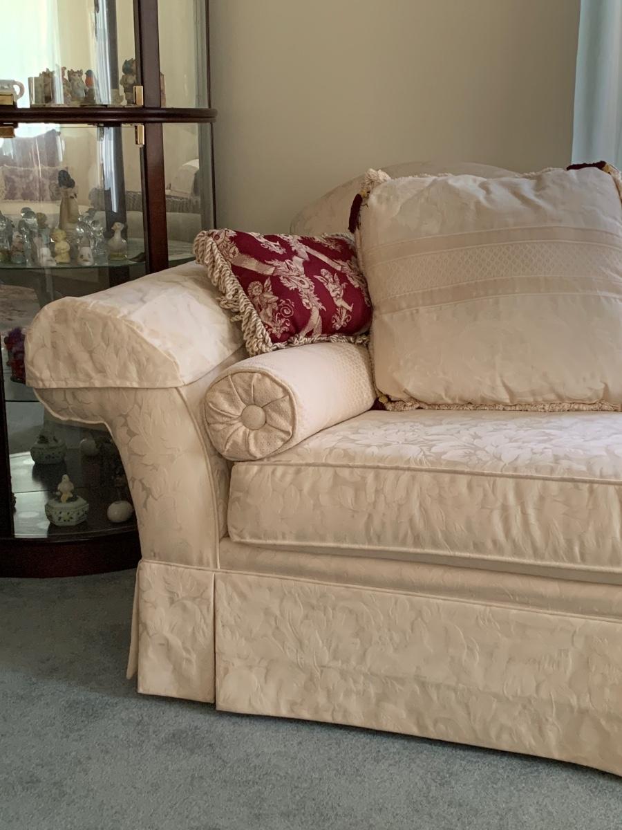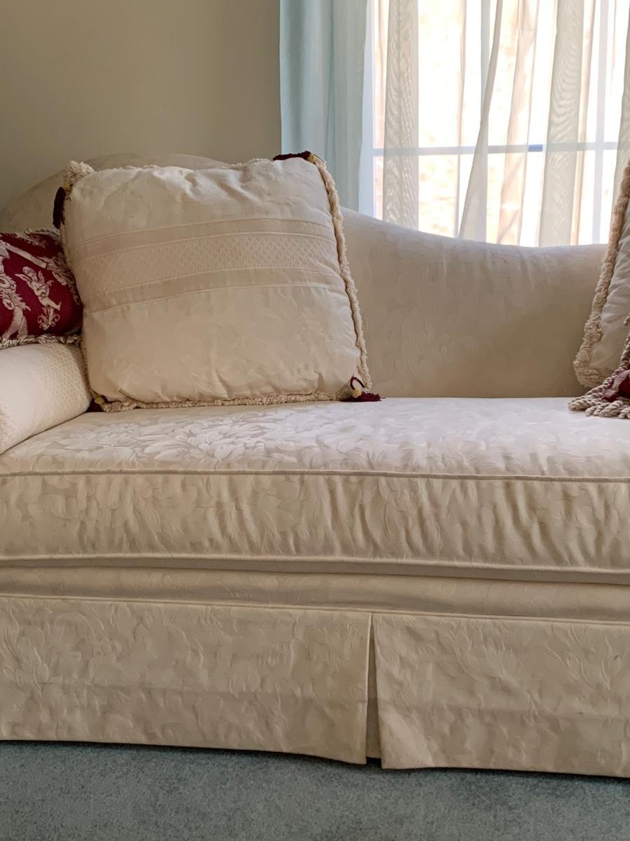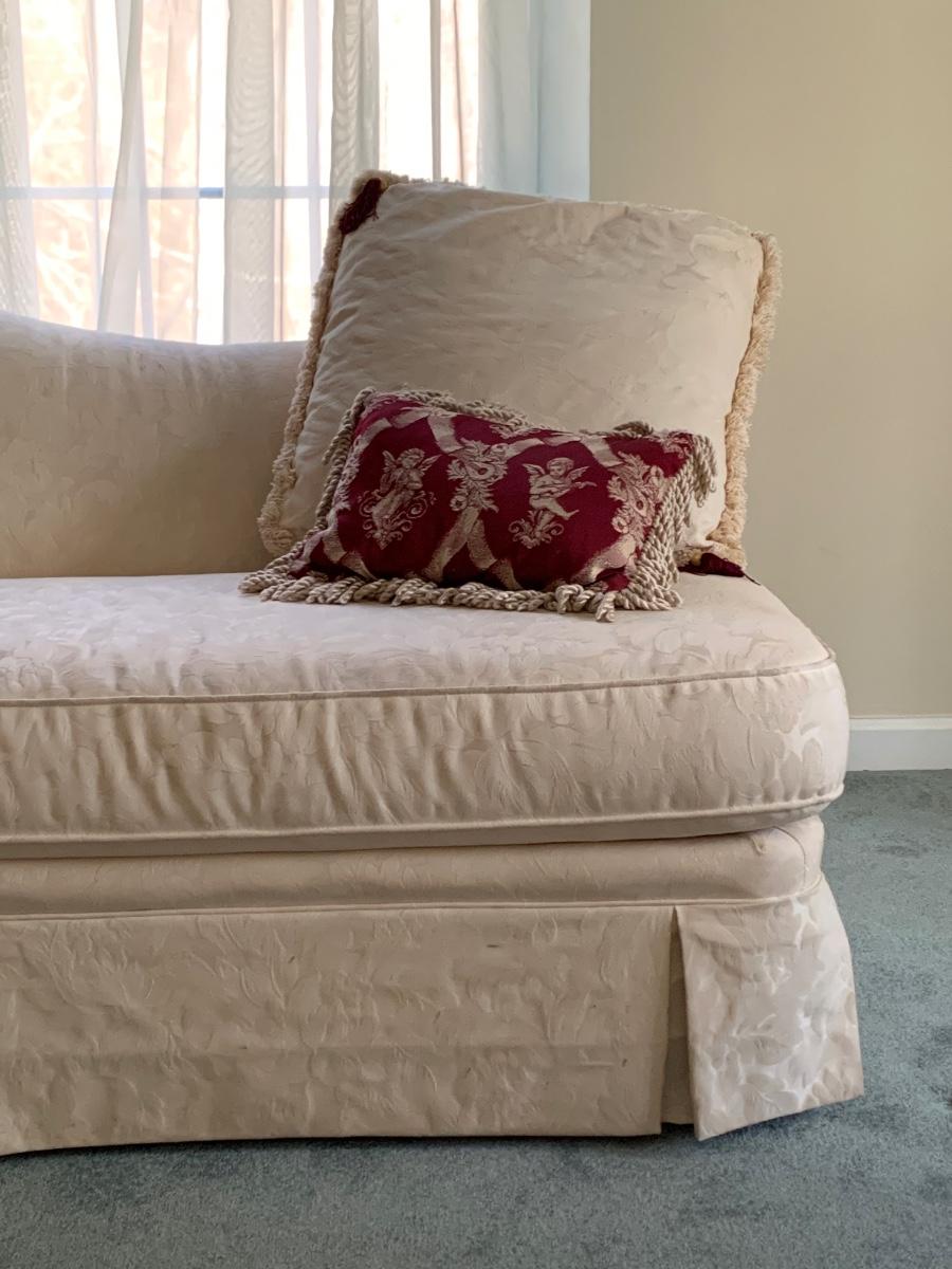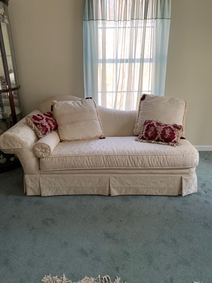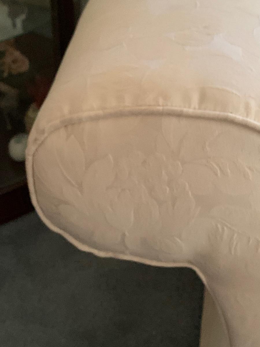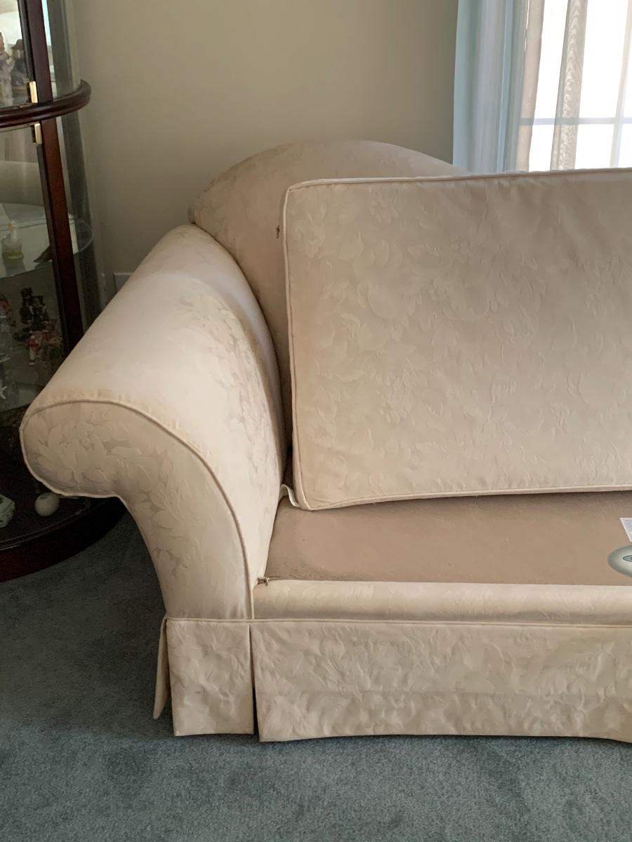Comfy cream colored chaise lounge in good condition. Any noted stains or conditon issues have been pictures