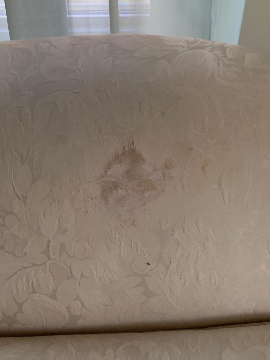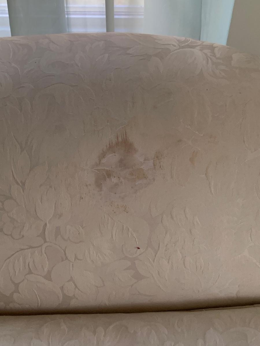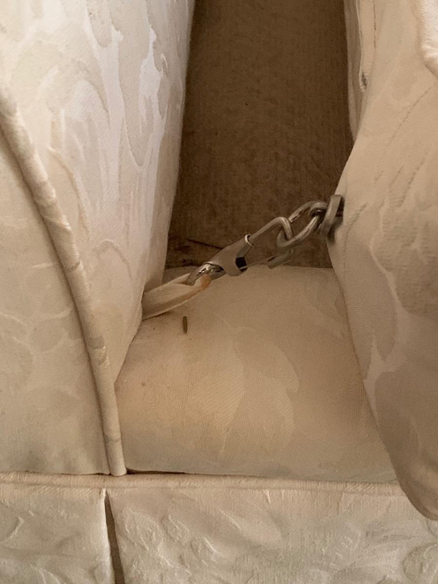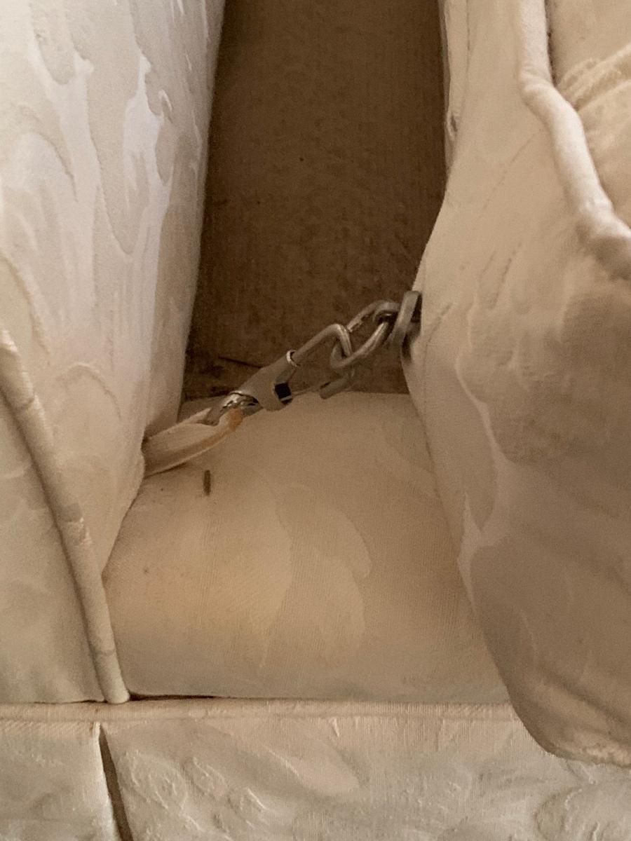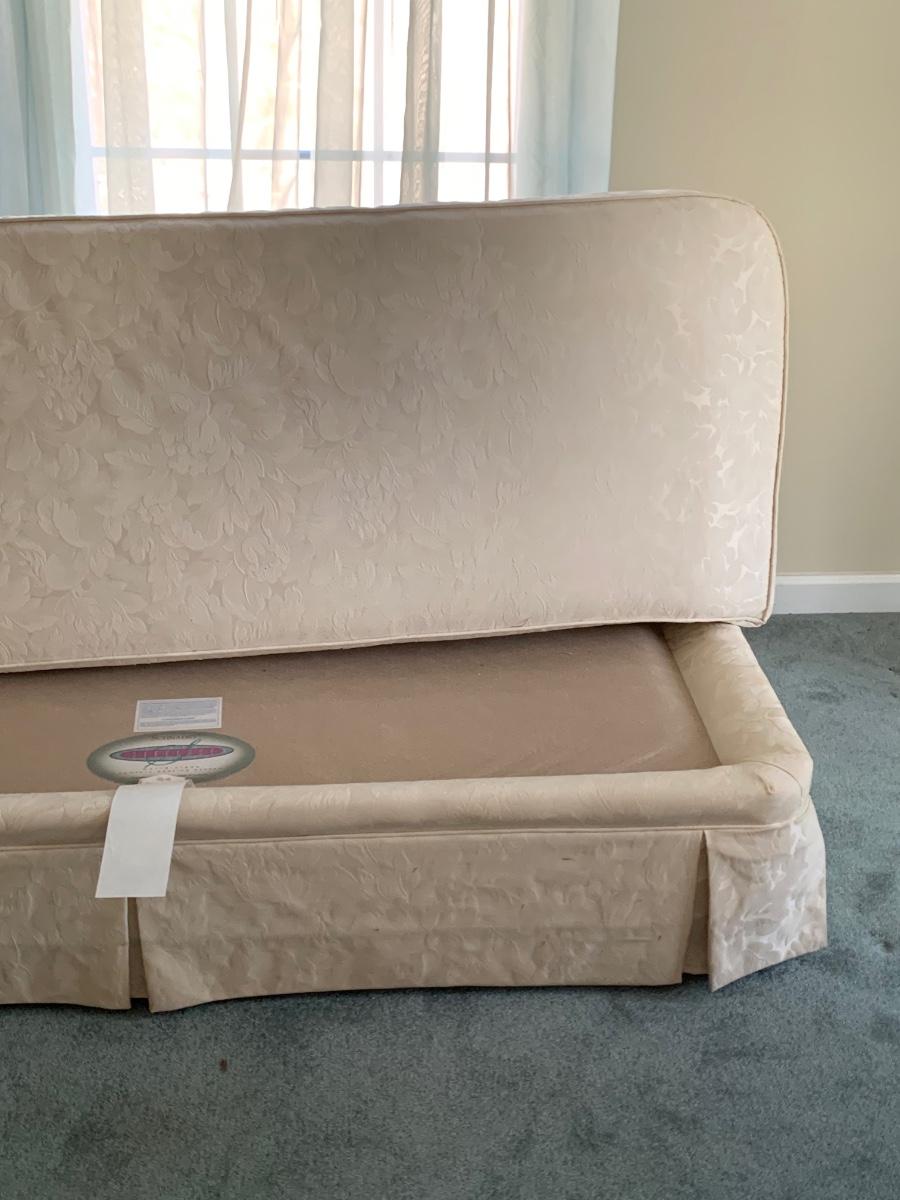 Comfy cream colored chaise lounge in good condition. Any noted stains or conditon issues have been pictures