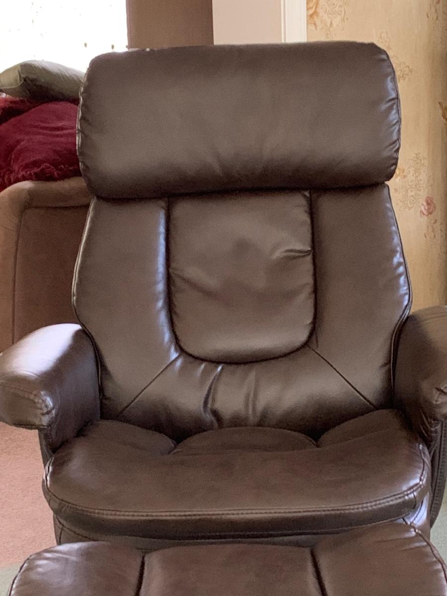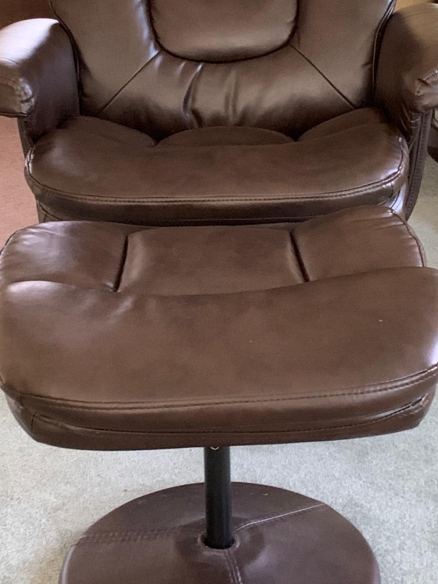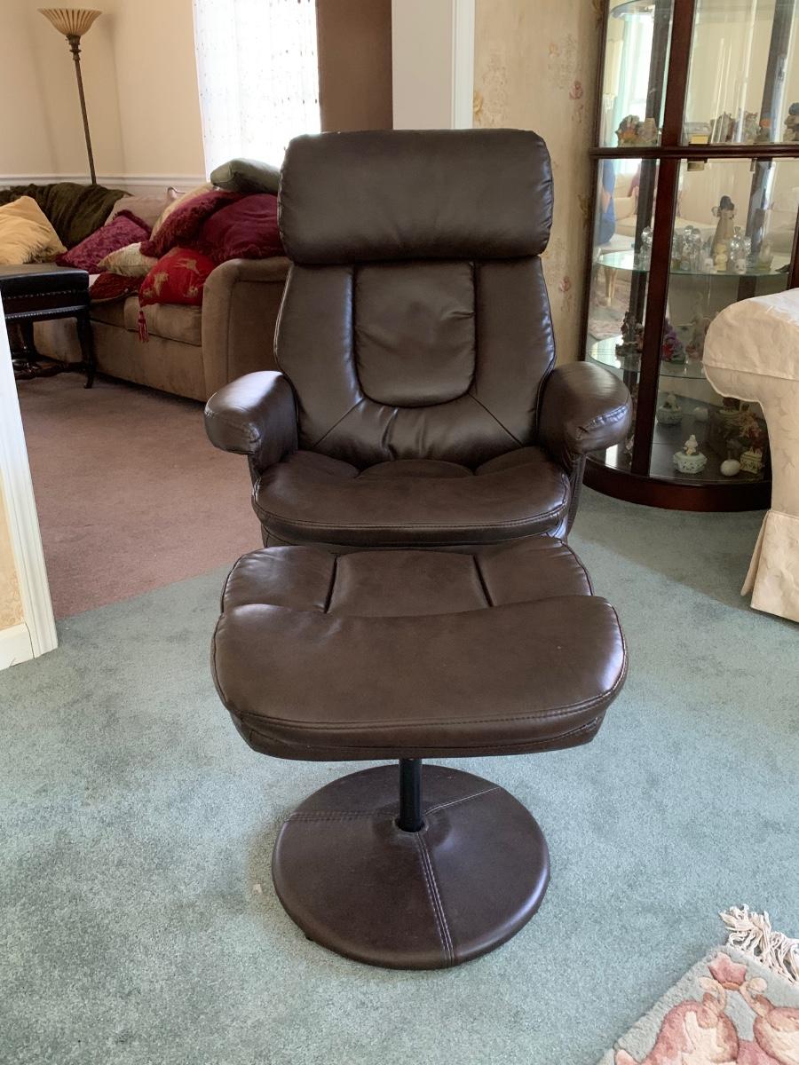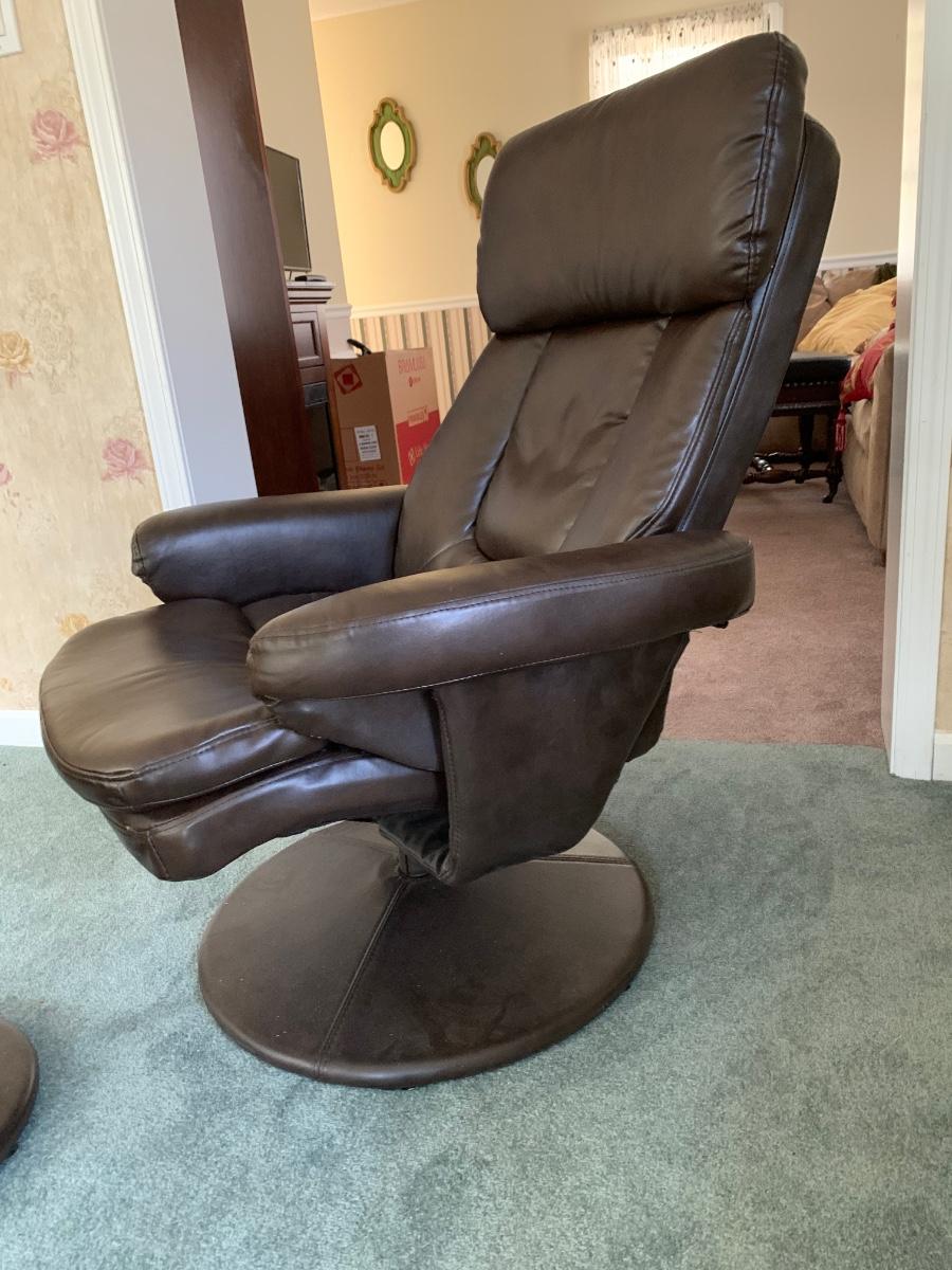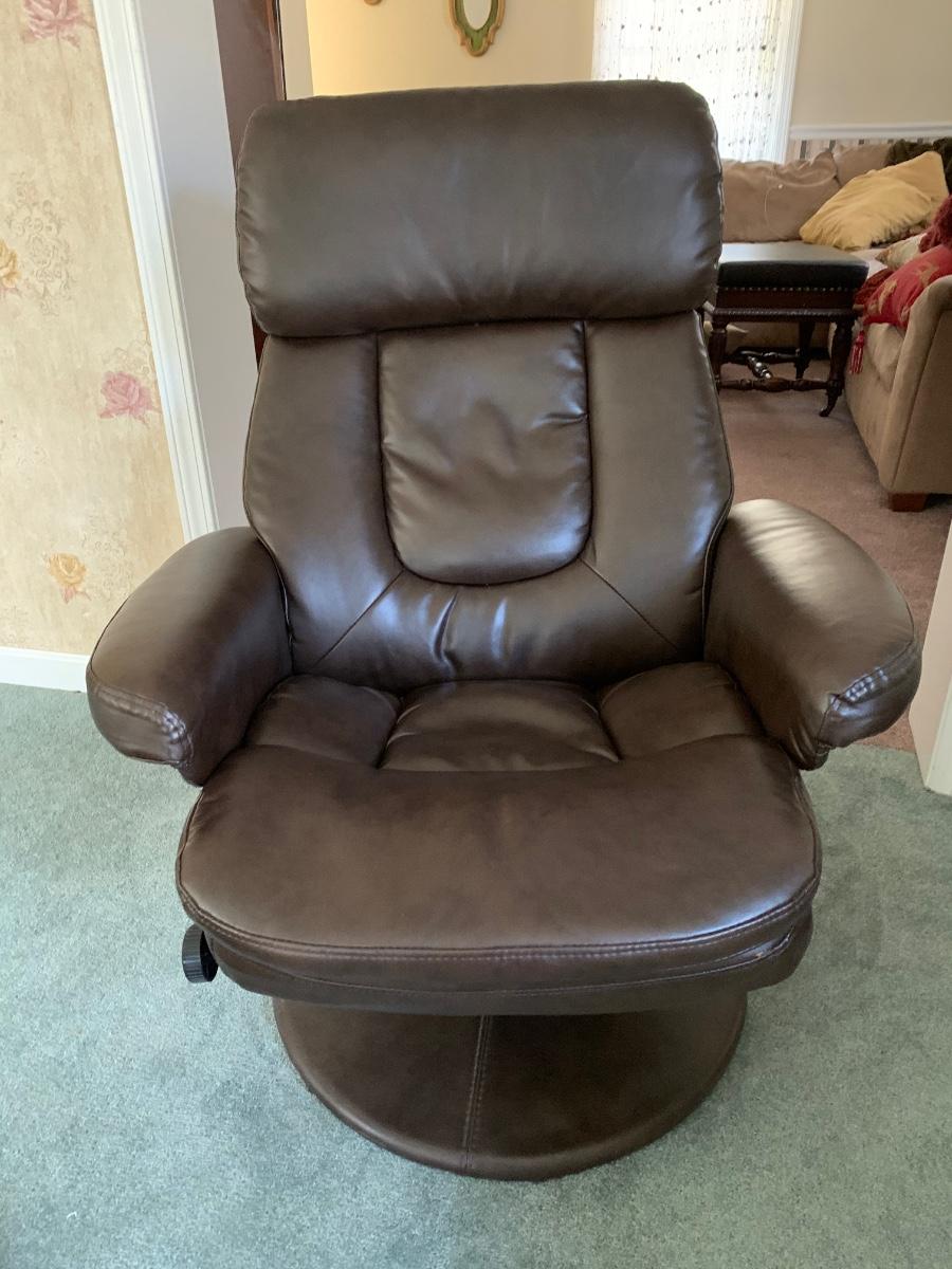 Very comfortable and adjustable brown leather like adjustable chair and recliner. Unfortunately no dimensions were taken.
