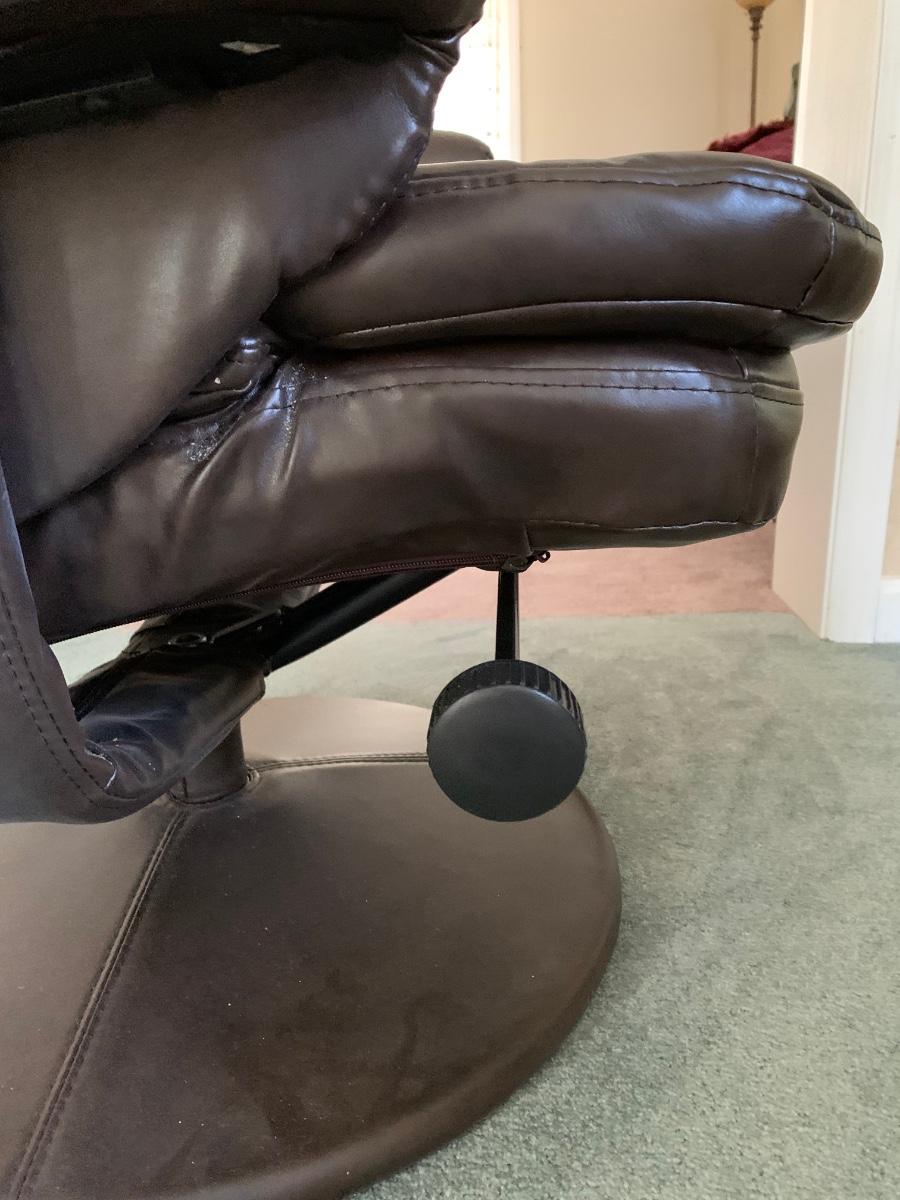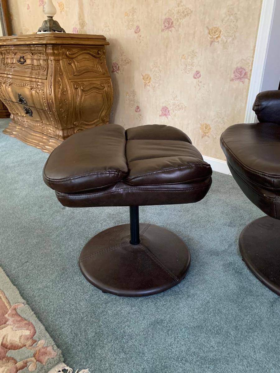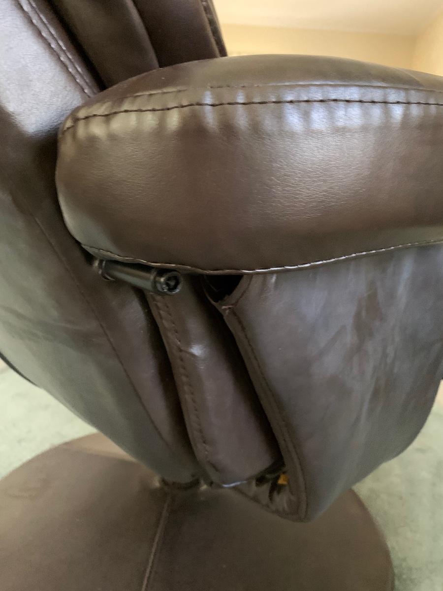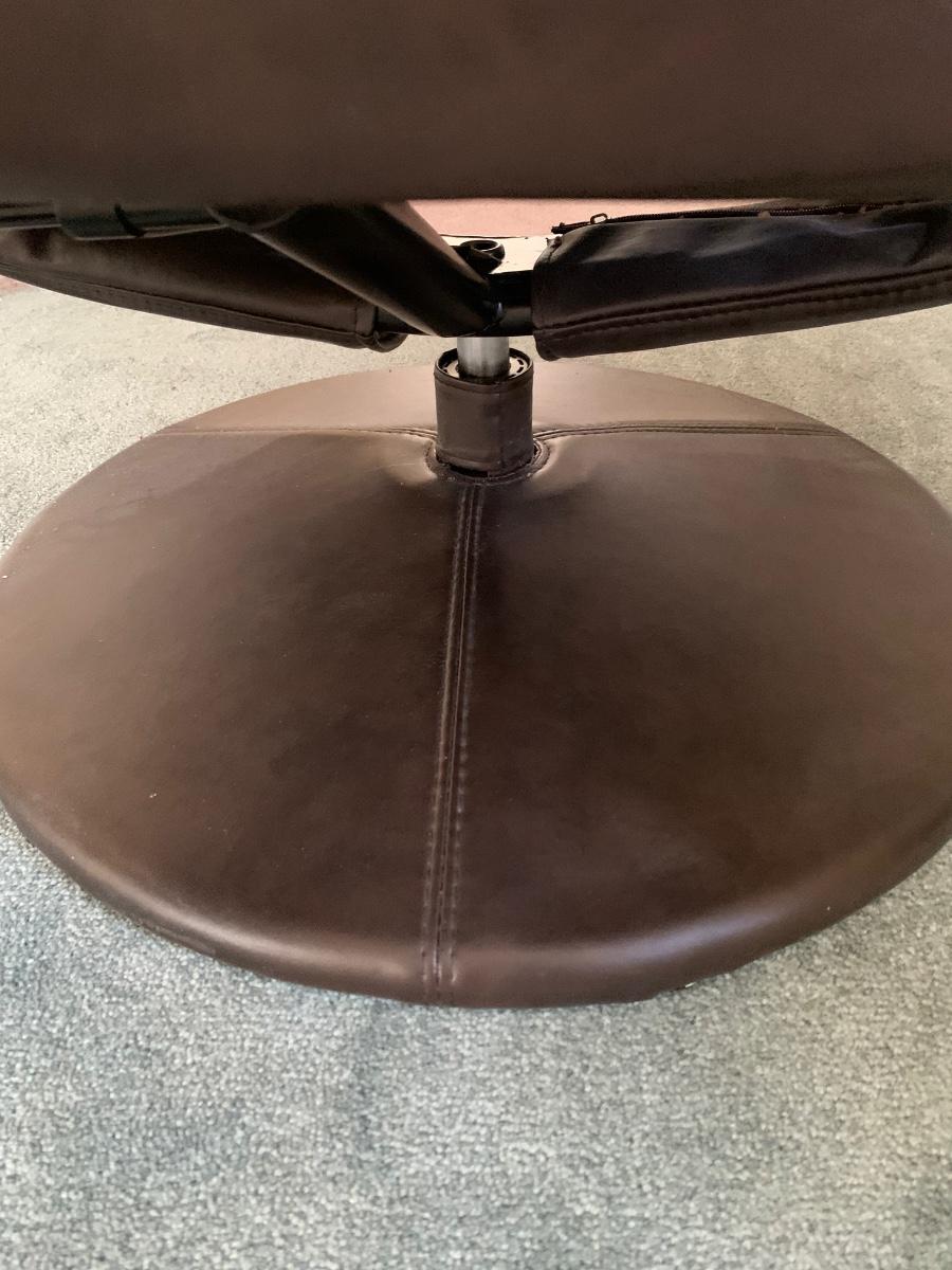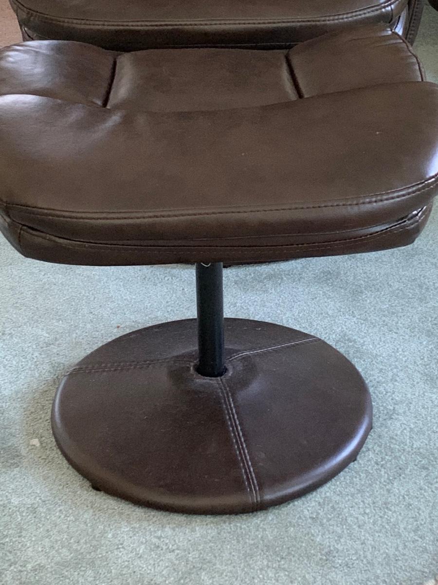 Very comfortable and adjustable brown leather like adjustable chair and recliner. Unfortunately no dimensions were taken.