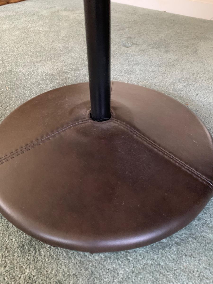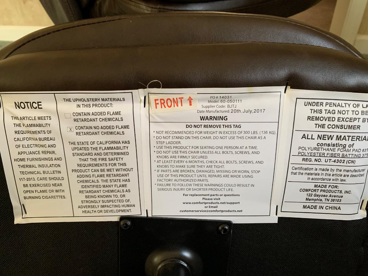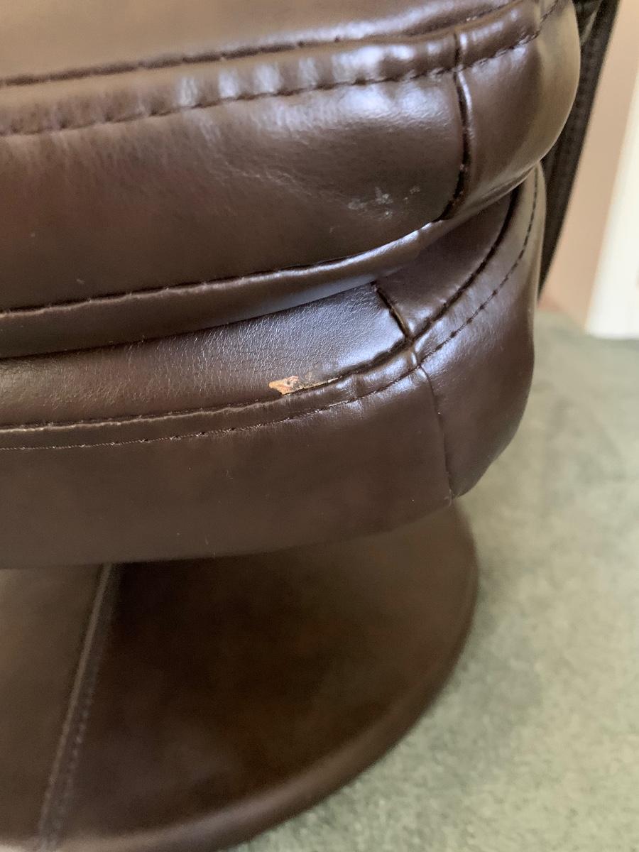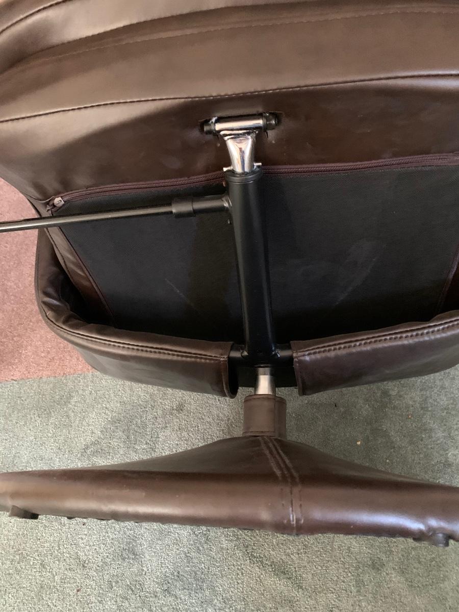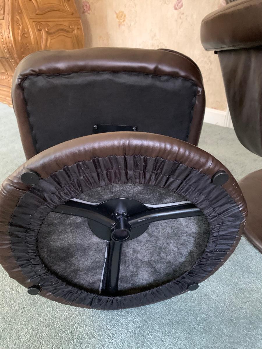 Very comfortable and adjustable brown leather like adjustable chair and recliner. Unfortunately no dimensions were taken.