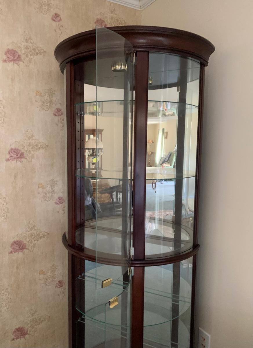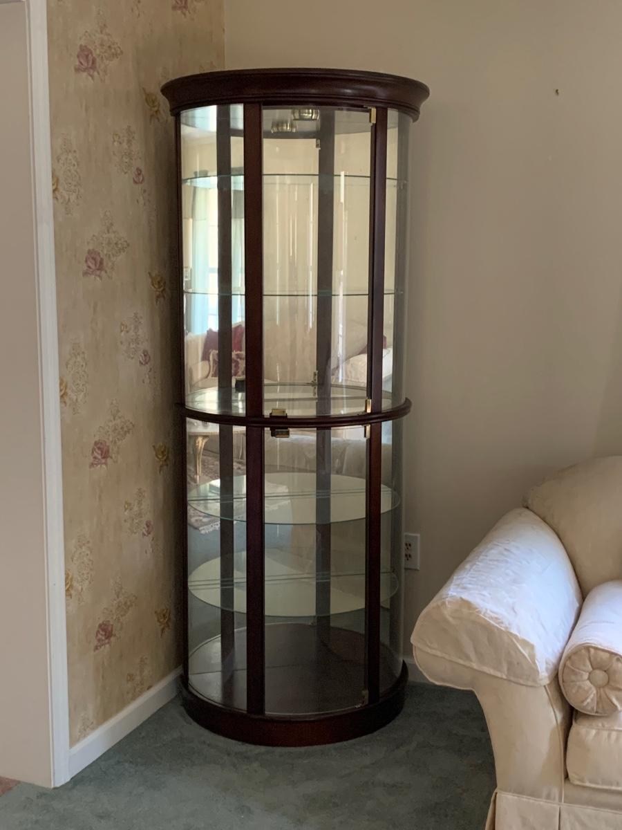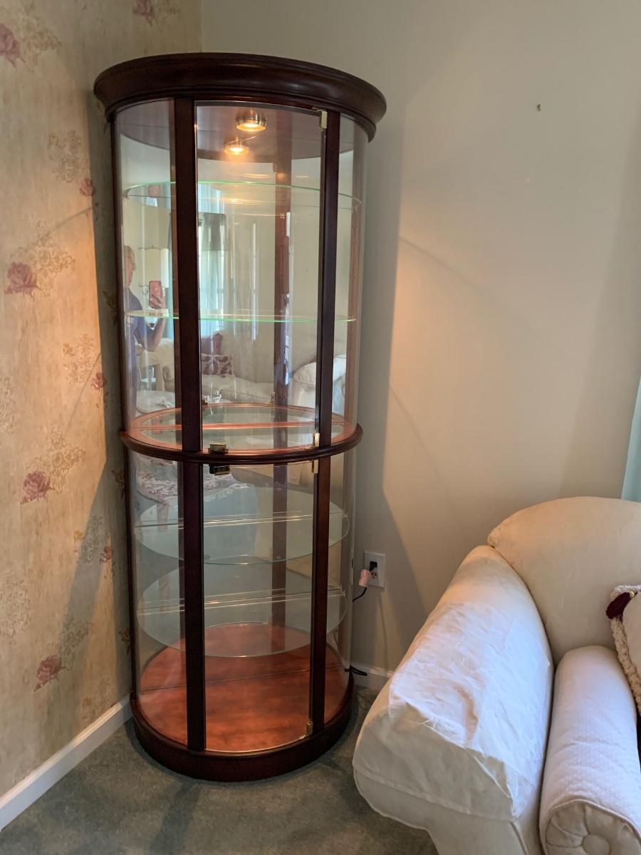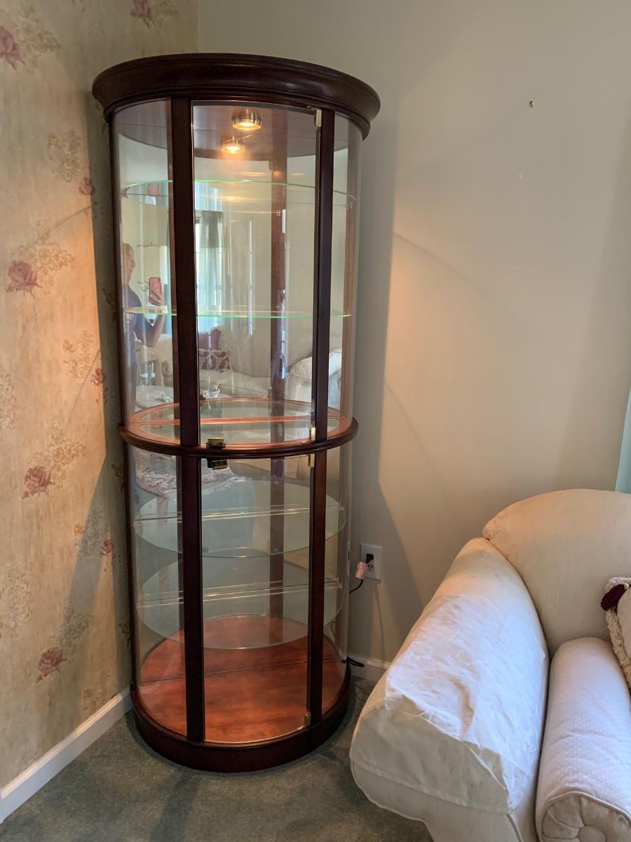 Rounded front cabinet with adjustable shelves and is lighted.This is not a corner cabinet. Overall dimensions 31 x 23 x 76.