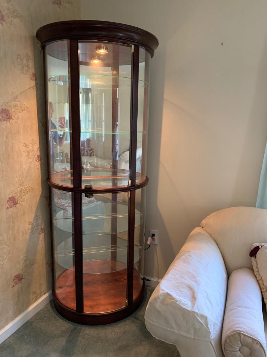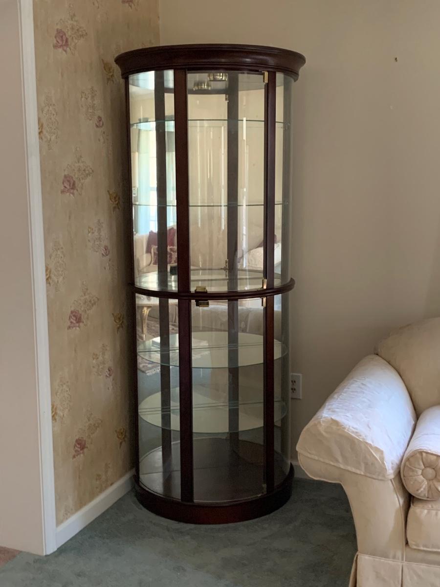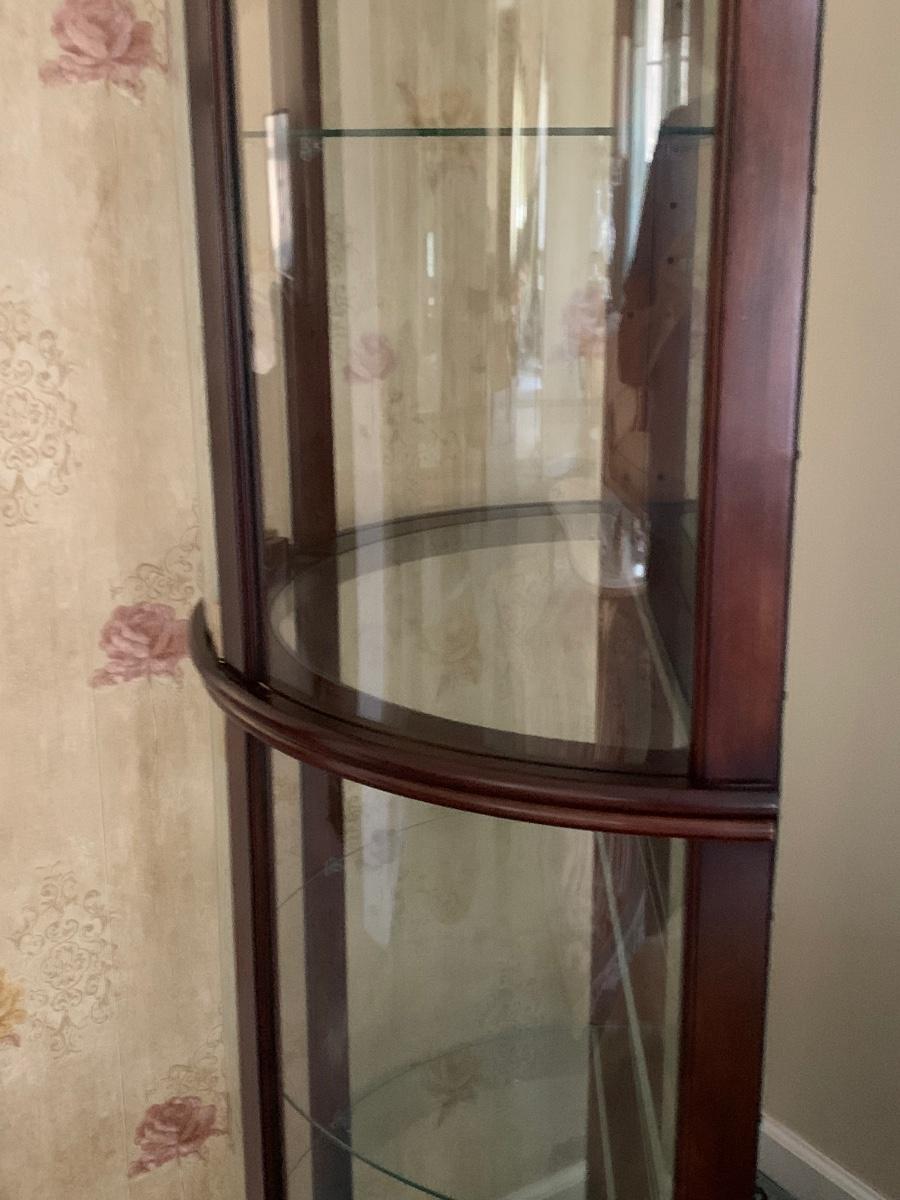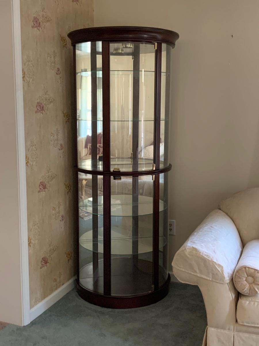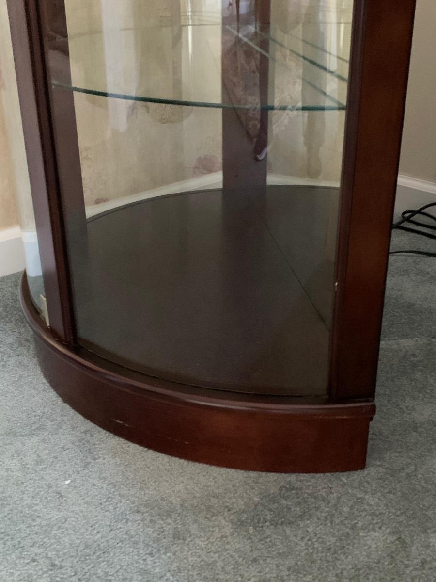 Rounded front cabinet with adjustable shelves and is lighted.This is not a corner cabinet. Overall dimensions 31 x 23 x 76.