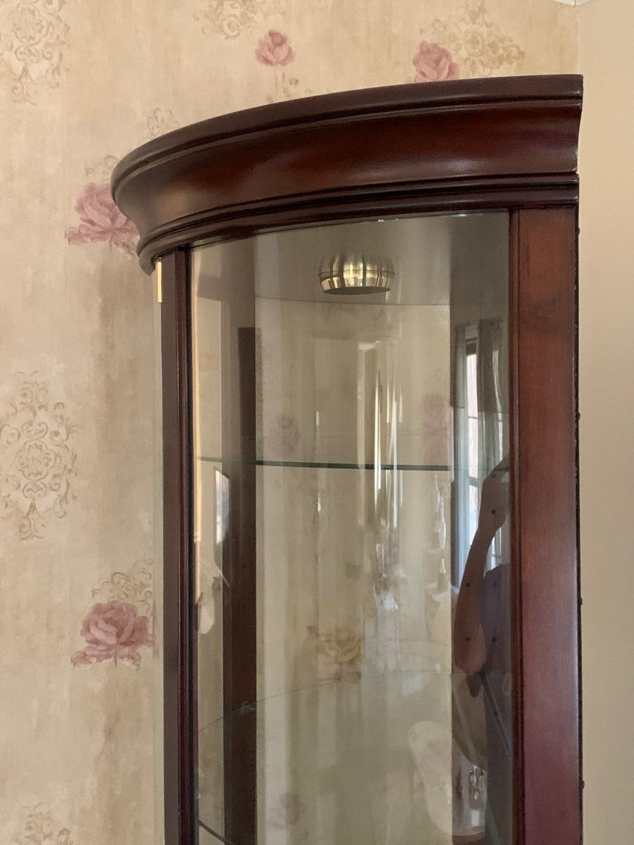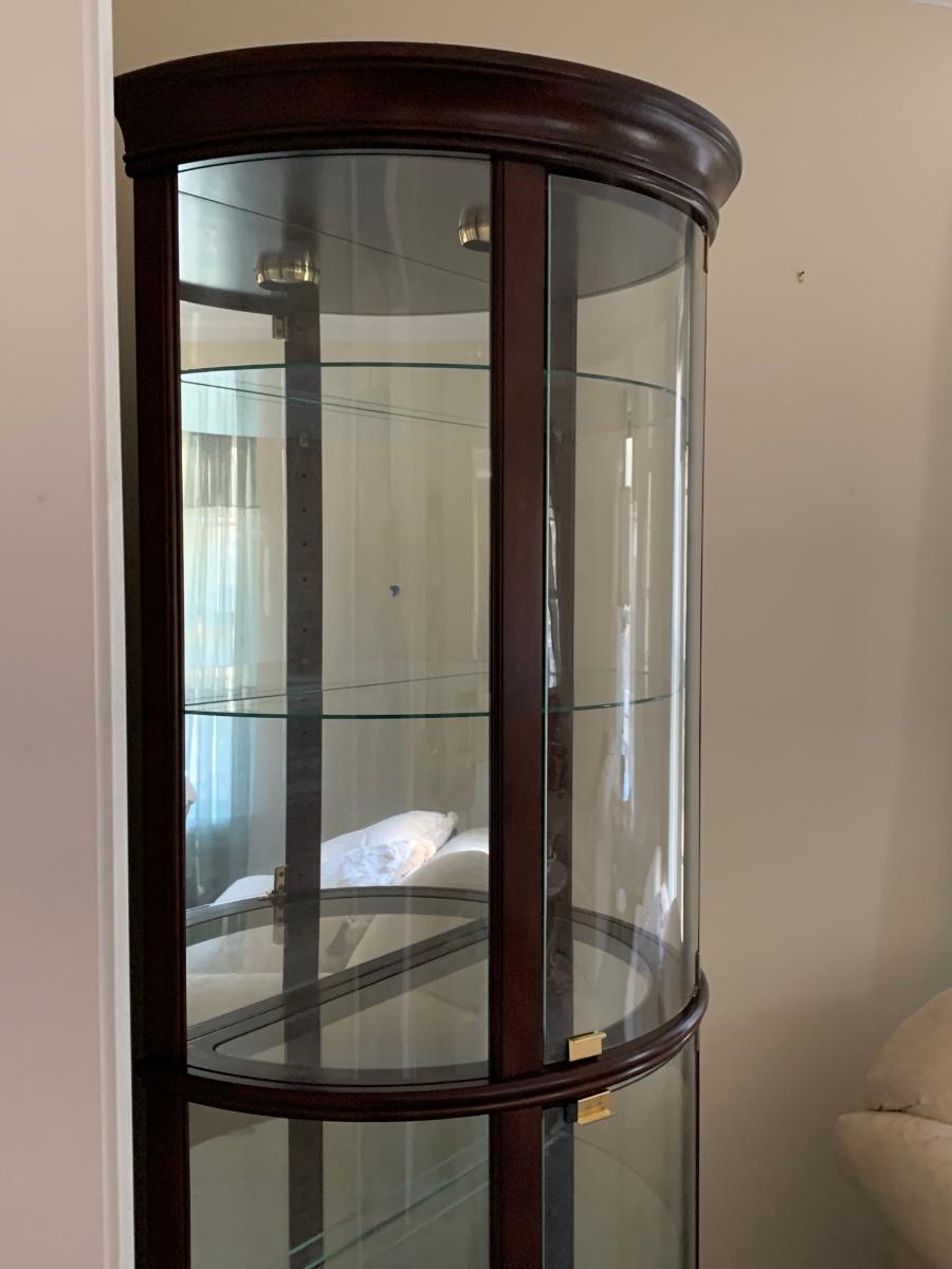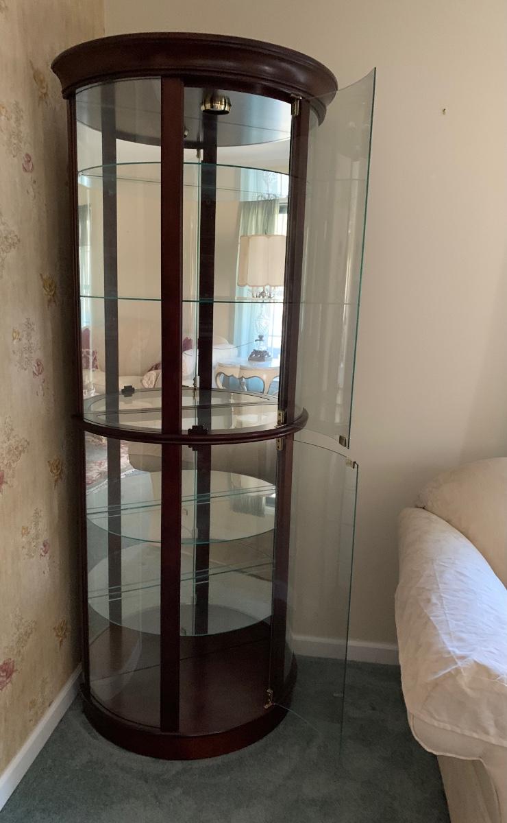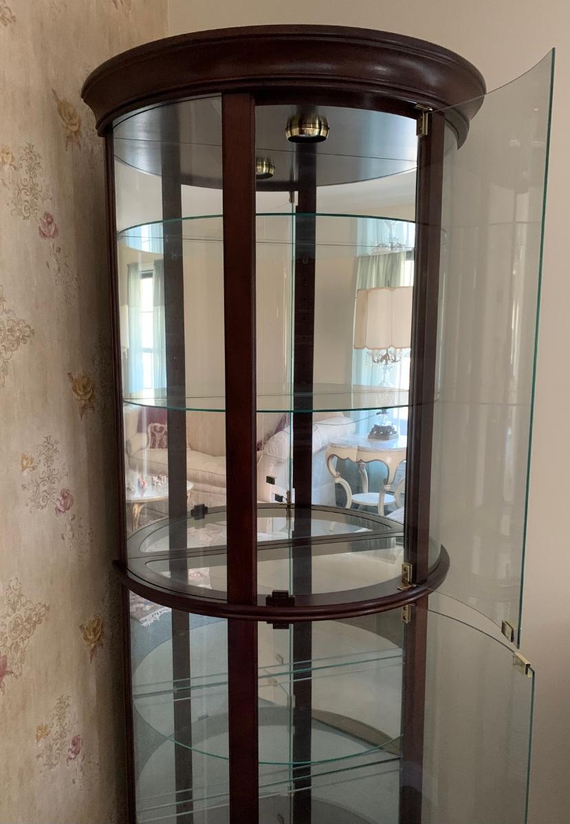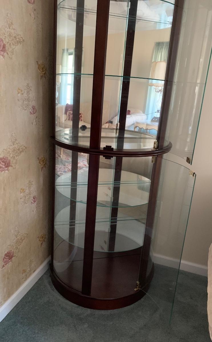 Rounded front cabinet with adjustable shelves and is lighted.This is not a corner cabinet. Overall dimensions 31 x 23 x 76.
