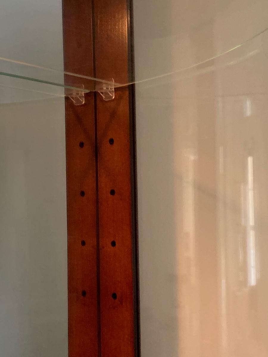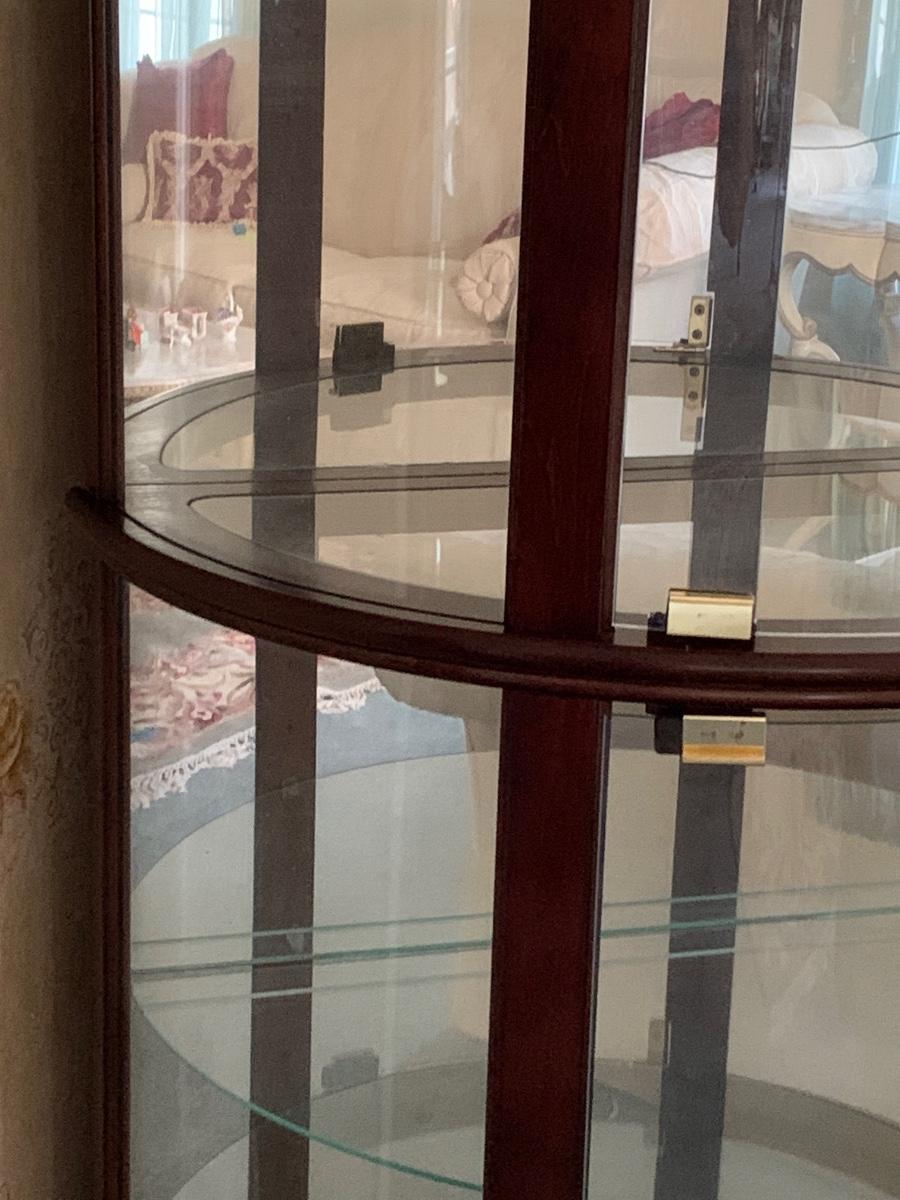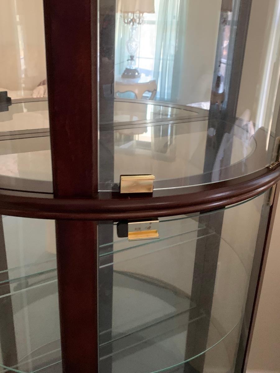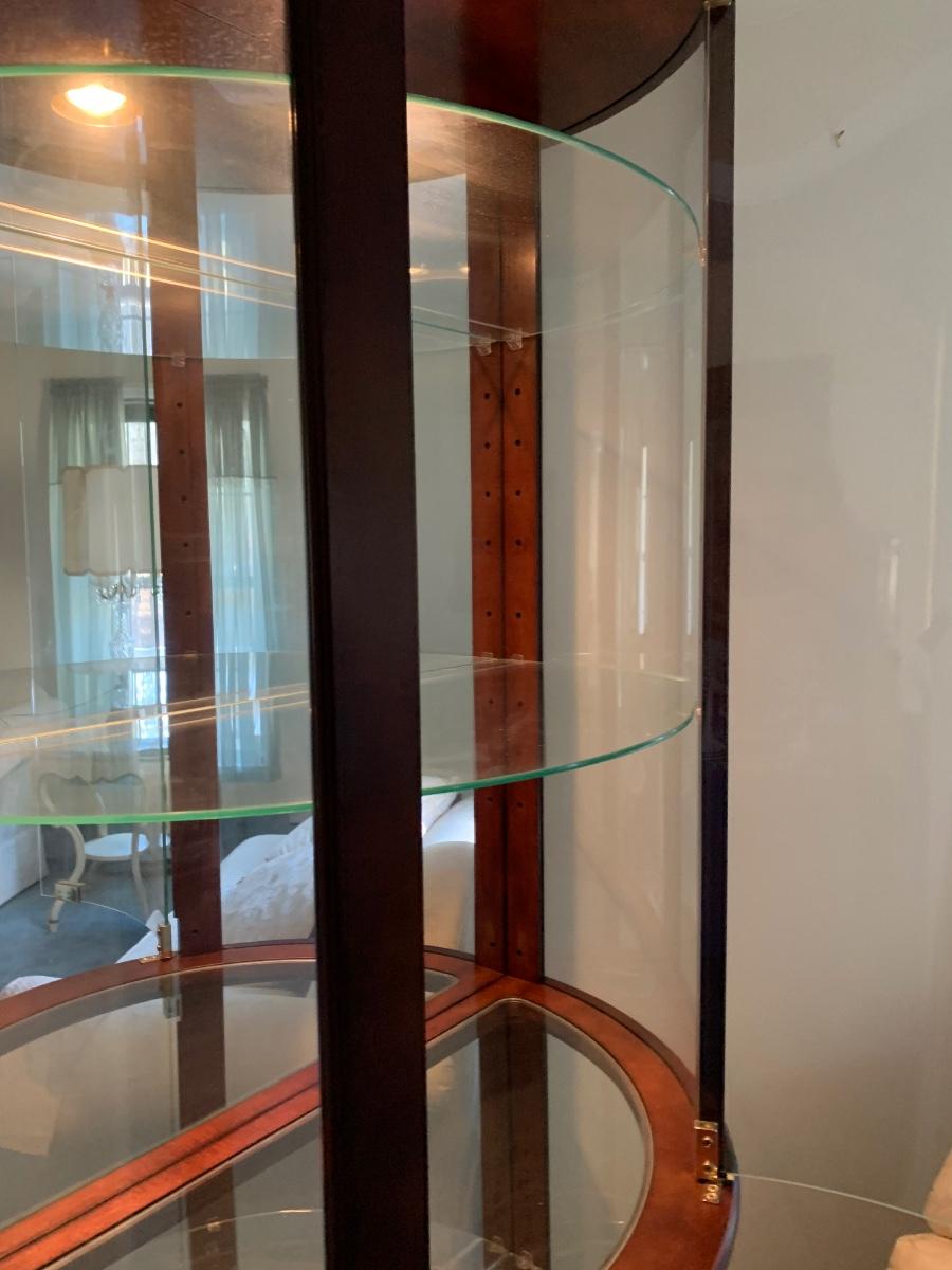 Rounded front cabinet with adjustable shelves and is lighted.This is not a corner cabinet. Overall dimensions 31 x 23 x 76.