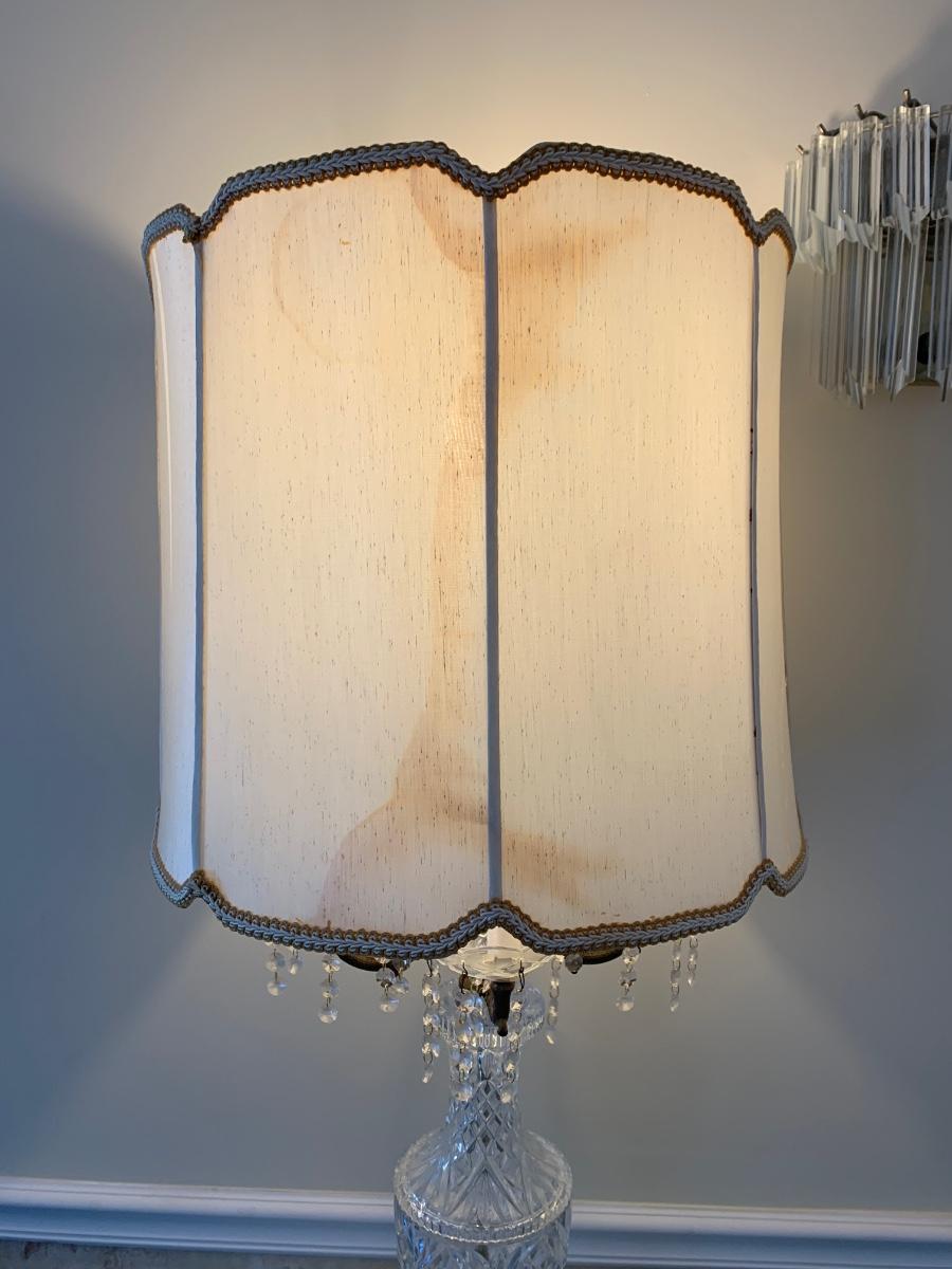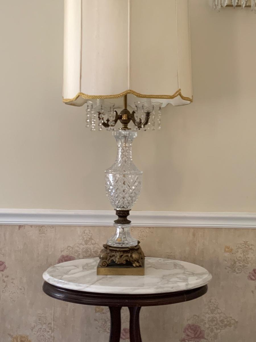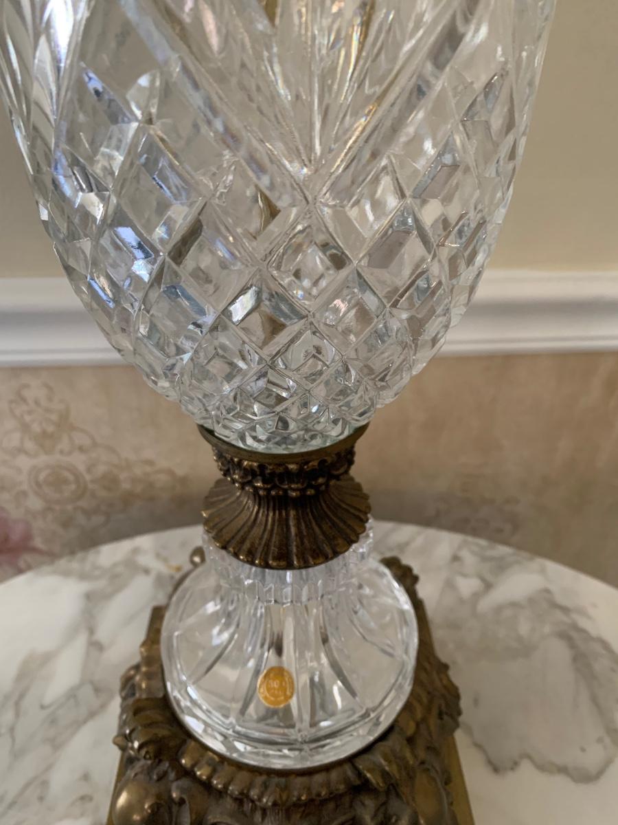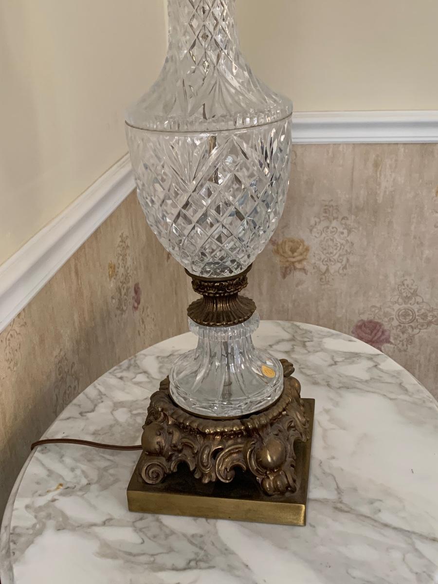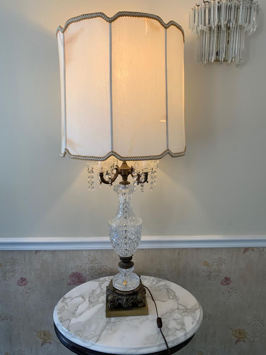 Beautiful tall lead crystal Cristallo Superior 30% Pb0 lamp. Could be the center piece of any room. Tested & works. the shade of this lamp has conditon issues as pictured. Table is NOT include.