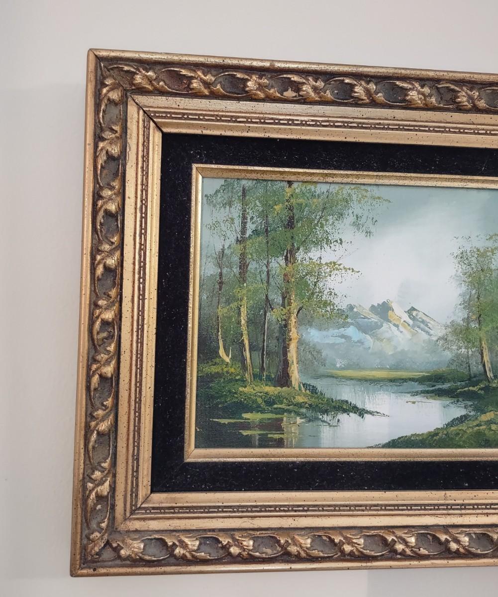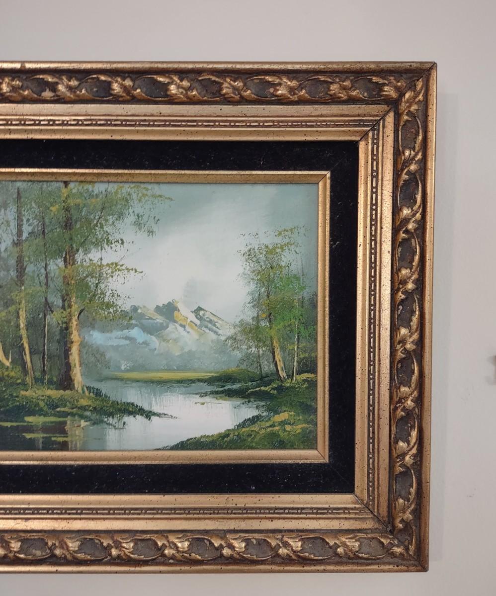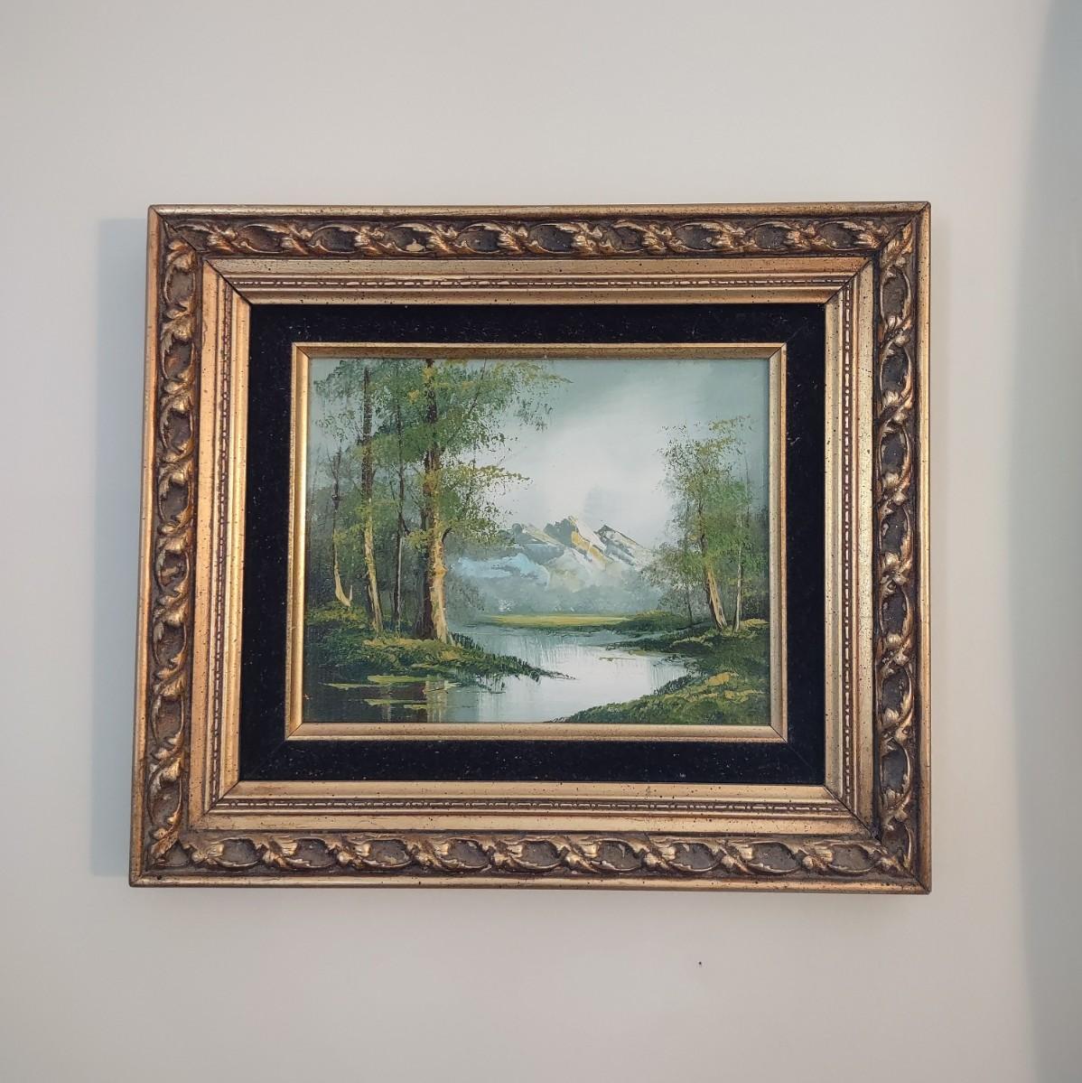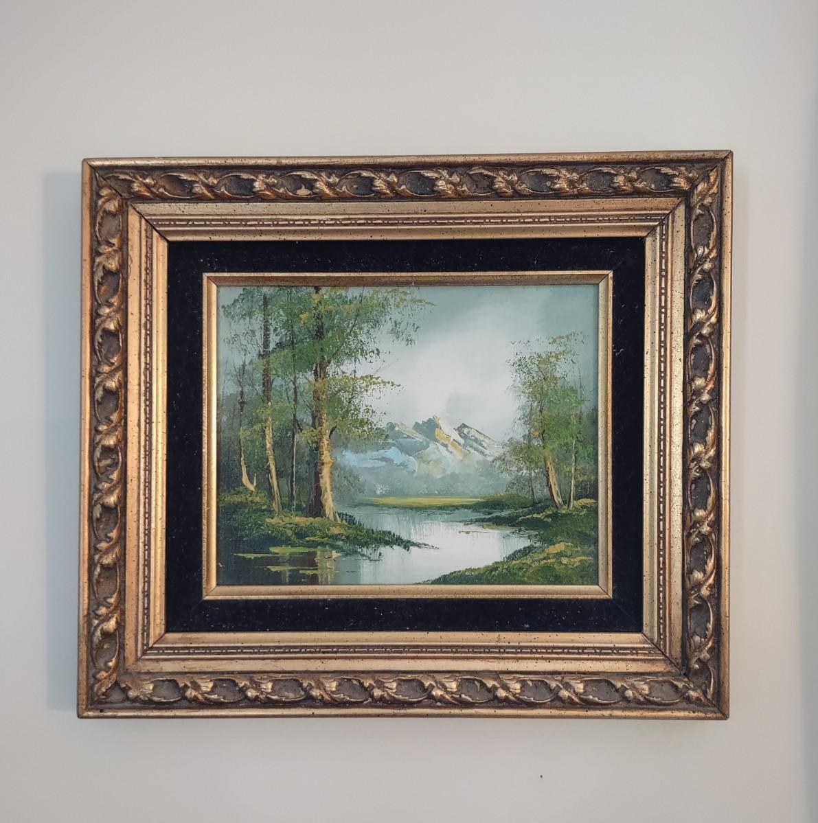 Peaceful Landscape with wooden gold tone & black frame measuring 15×13.
