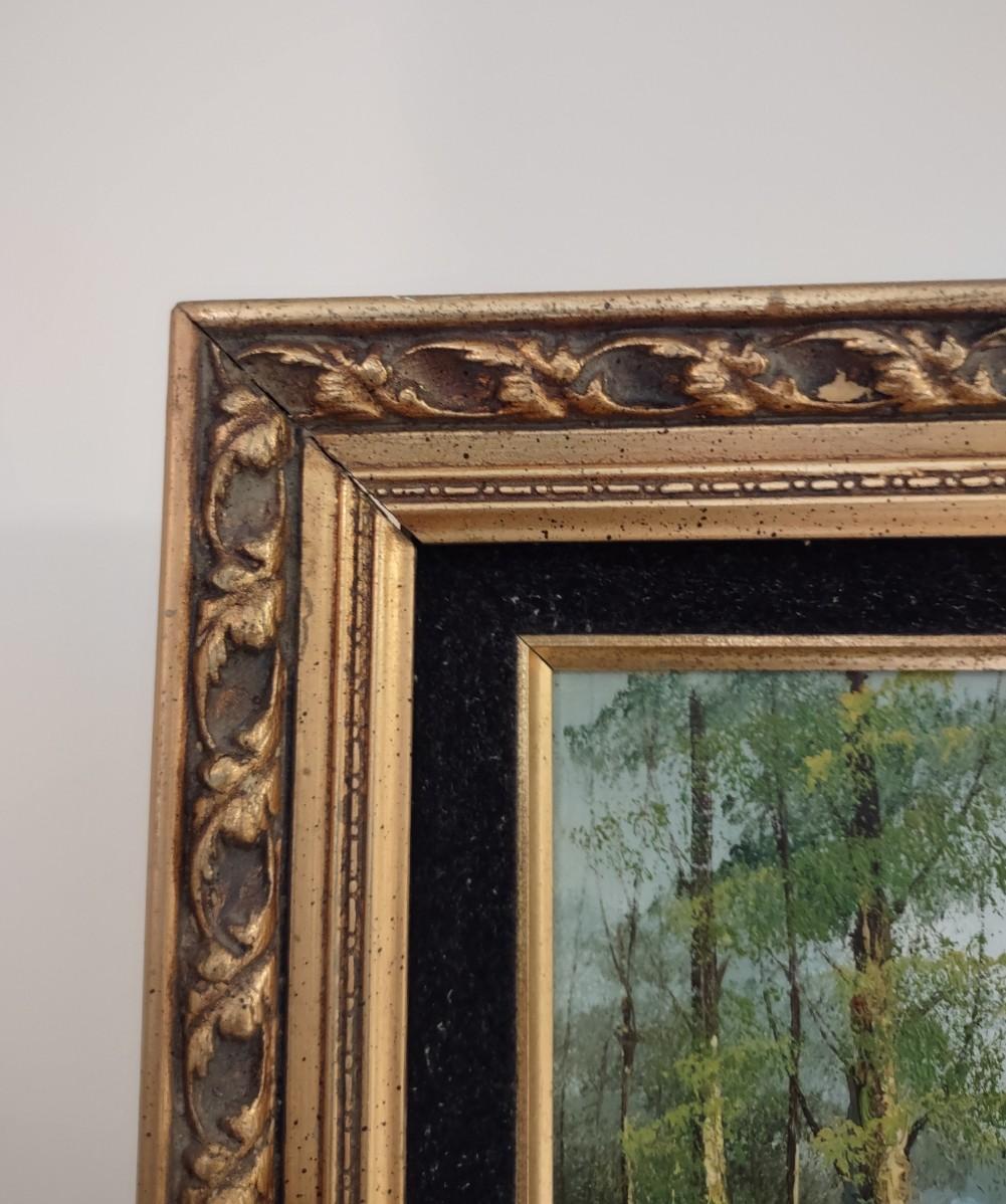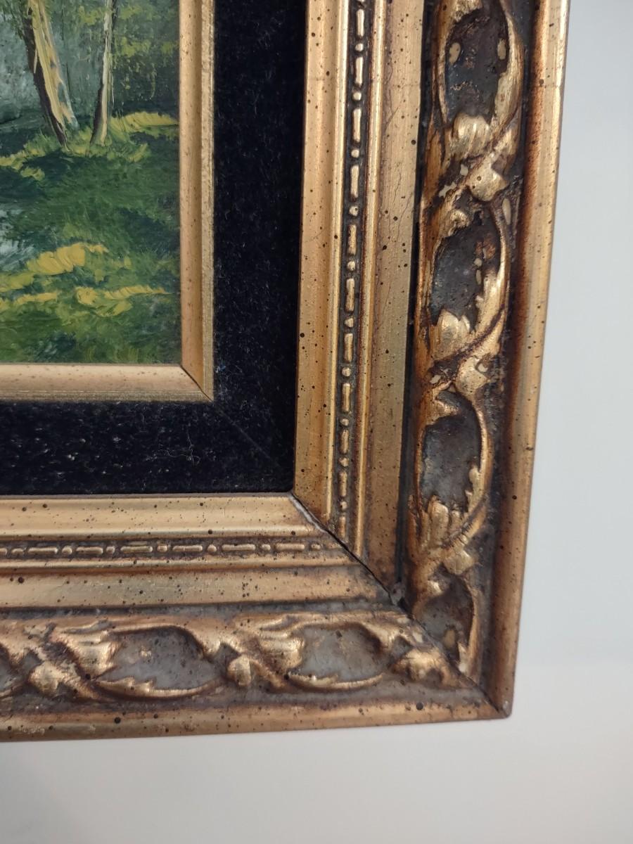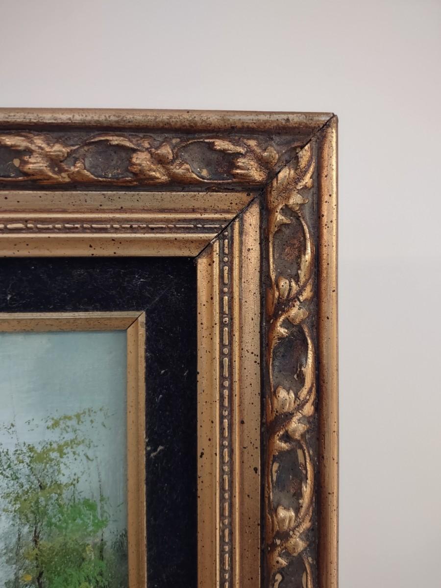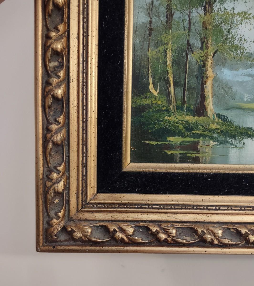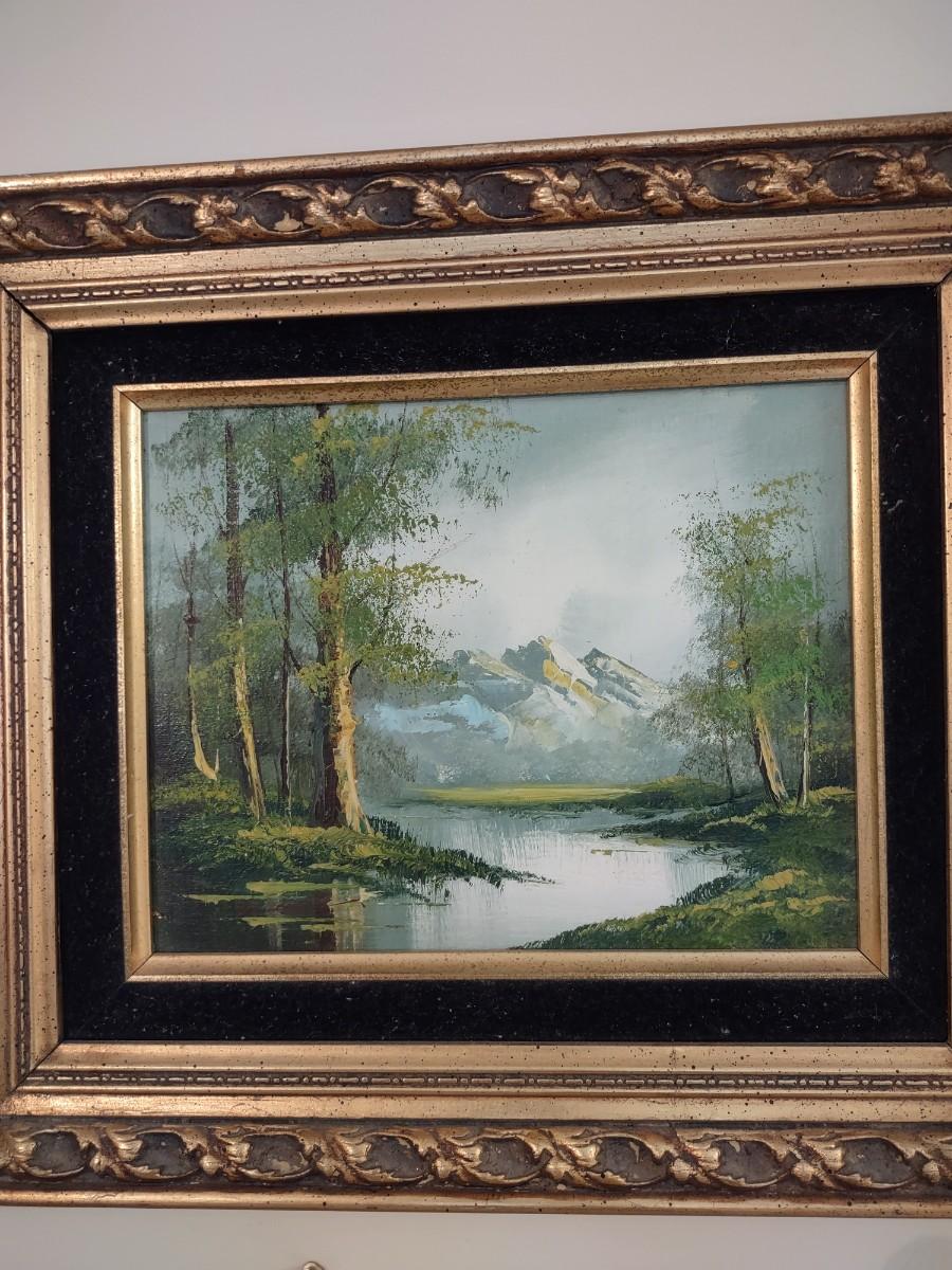 Peaceful Landscape with wooden gold tone & black frame measuring 15×13.