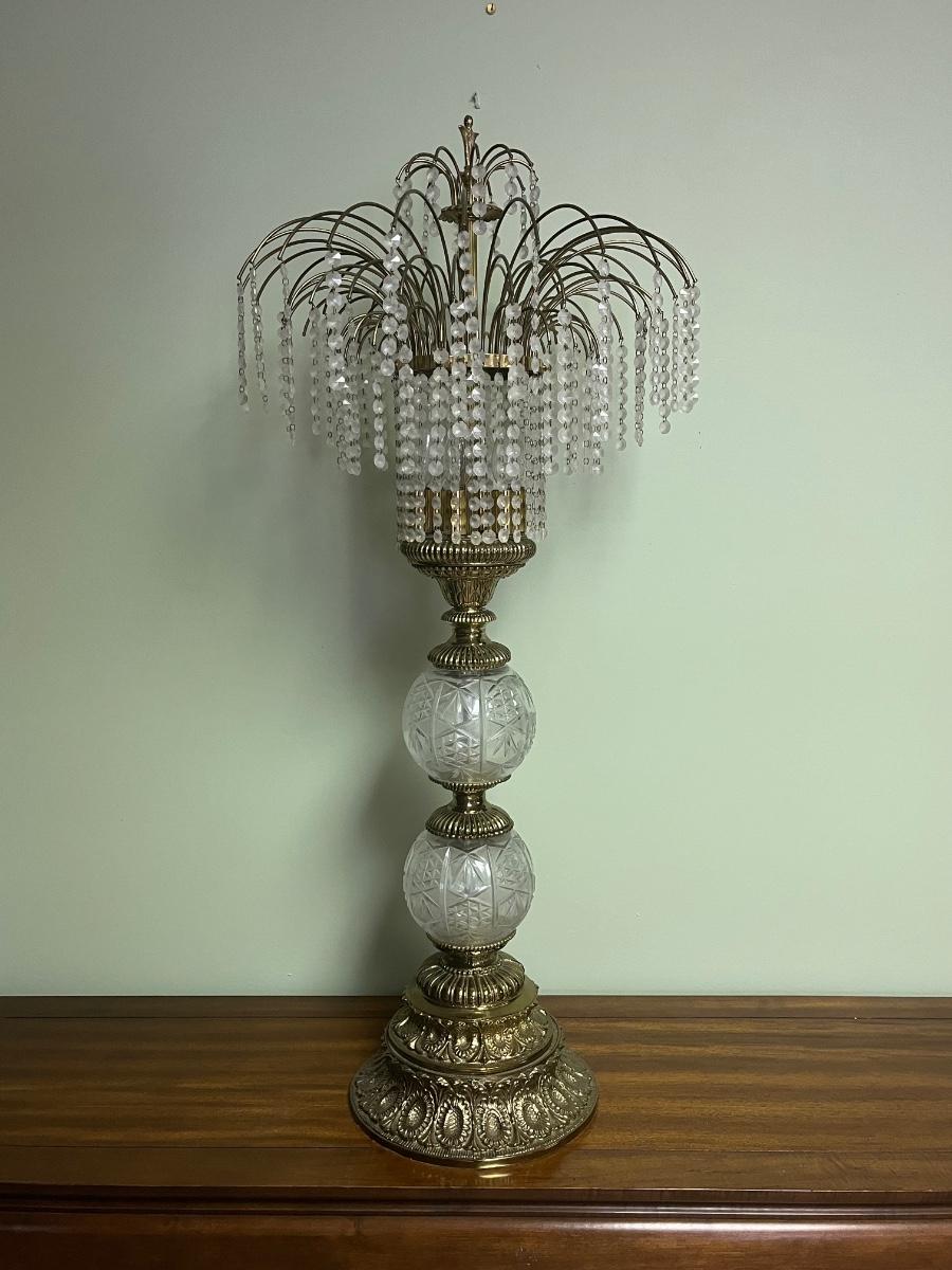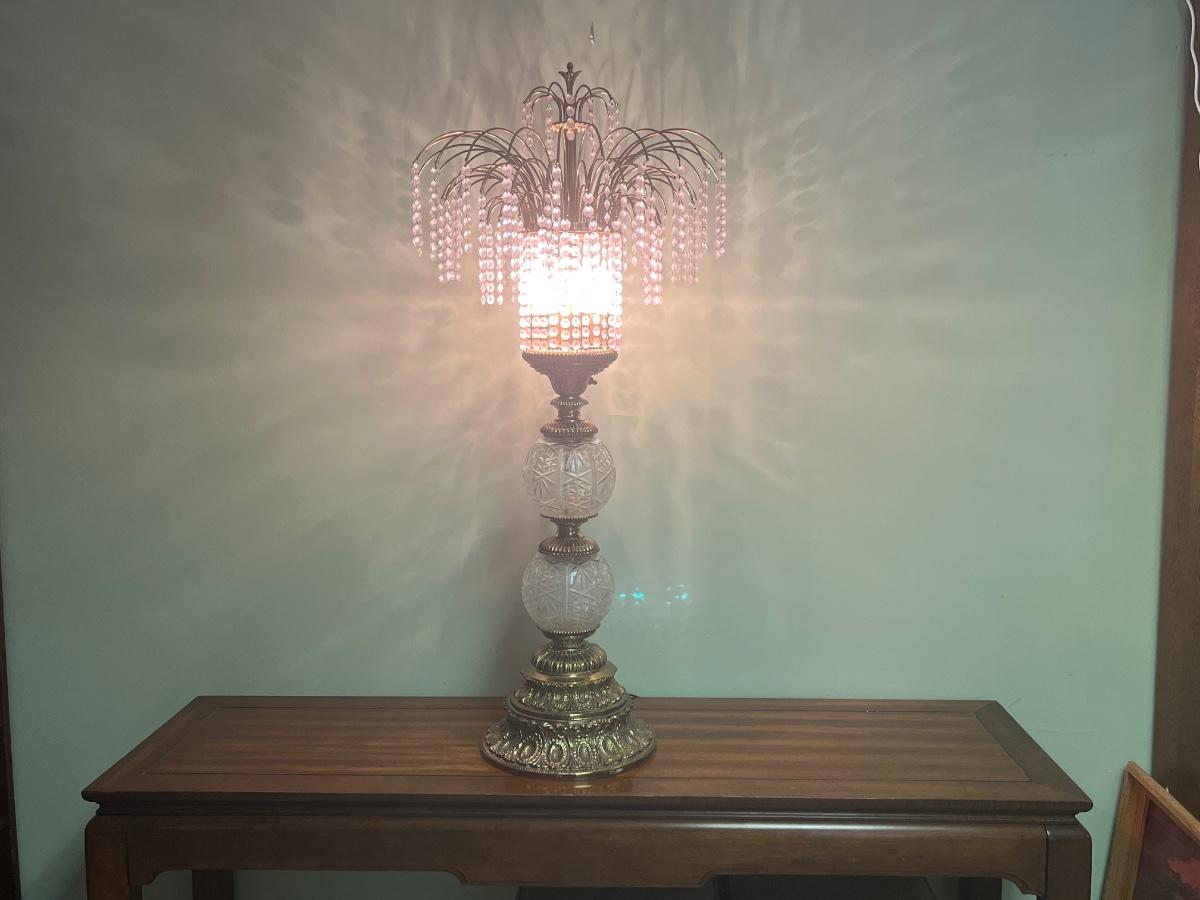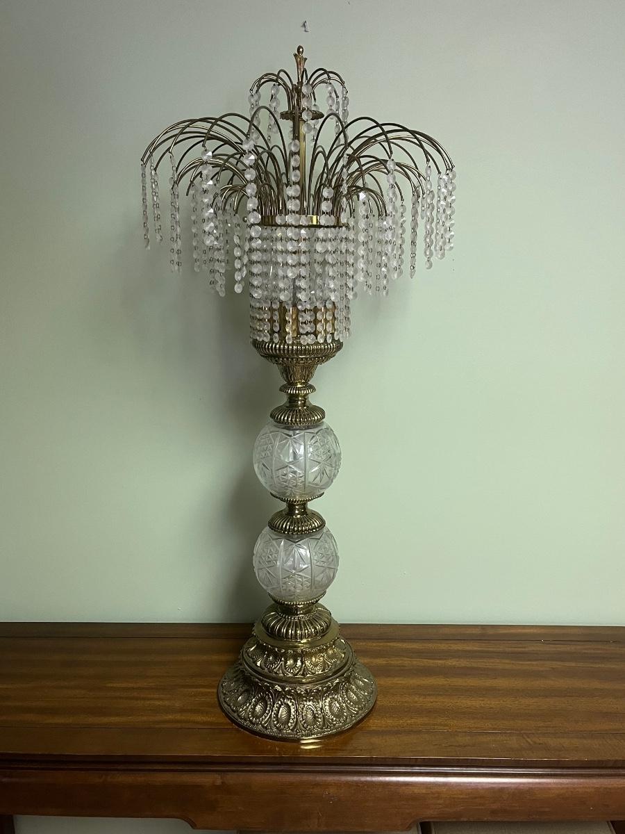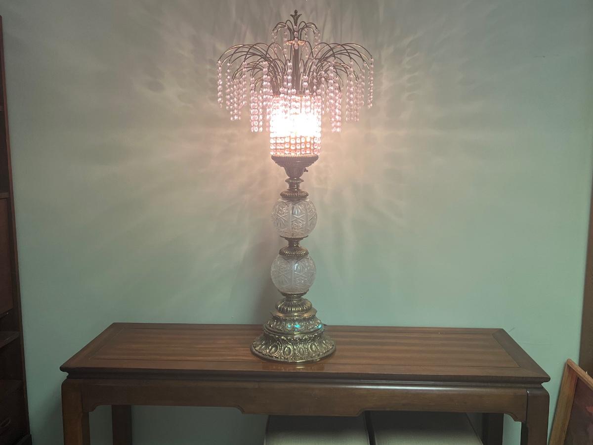 Absolutely stunning glass/crystal working lamp. It stands over 40 inches with hanging bead to cast the light throughout the room. Please see all pictures as they are the best representation of the items. The pictures show condition, measurements if taken, and what is included in the lot. Due to the large amount that we photograph and the time frame, we are not always able to take measurements. All items unless noted, are pre-owned and have been used. If you purchased furniture, you must bring help. We do not allow one person to carry large furniture out on their own. Bring help, tools and a truck for the safety of our client’s homes, and your personal safety. Any damages that result to the property including walls, and floors due to moving of the furniture will be charged to the buyer. Company policy. Thank you.