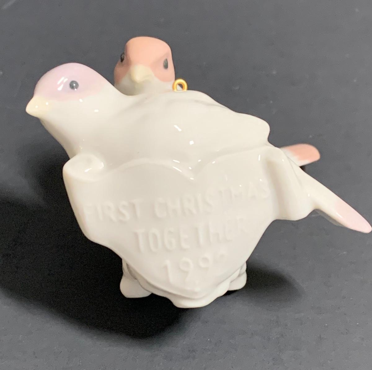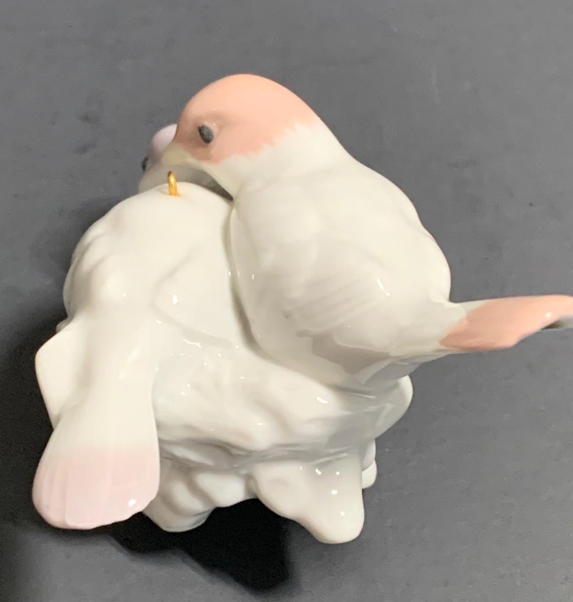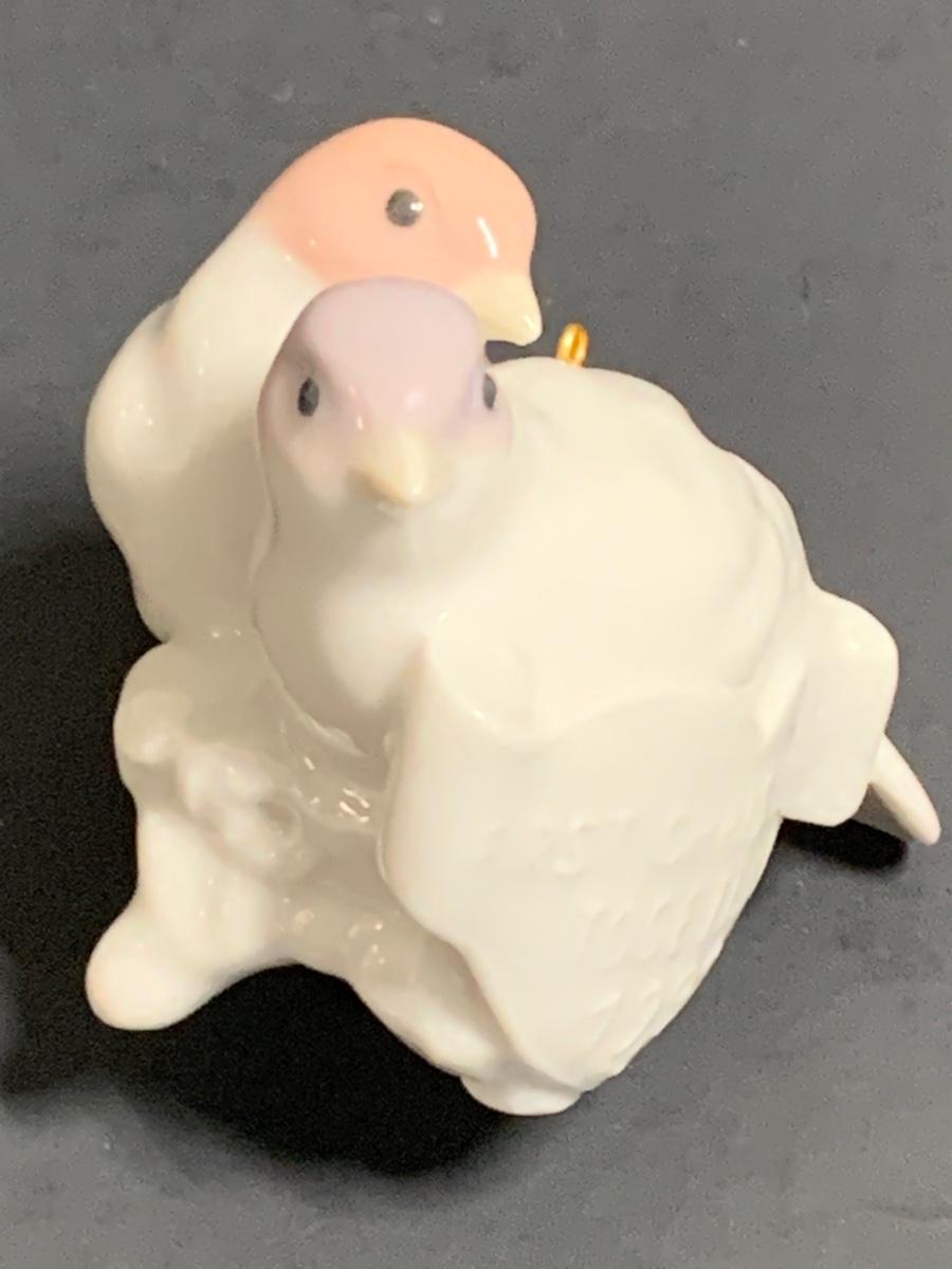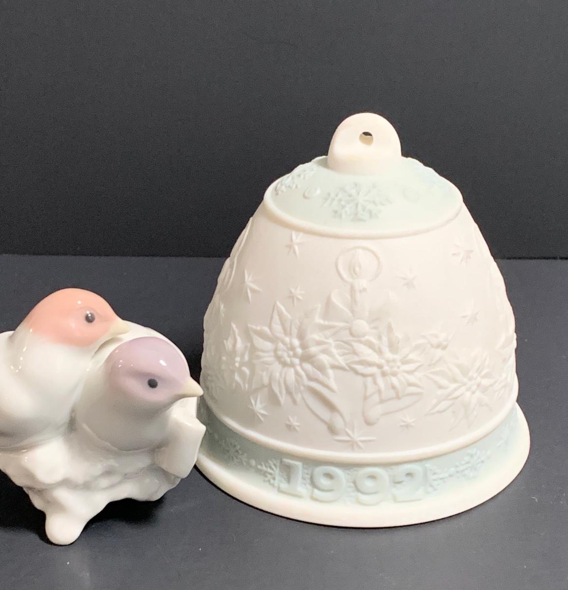 Collection of 2 Lladro ornaments: 1992 Christmas bell and love bird ornament