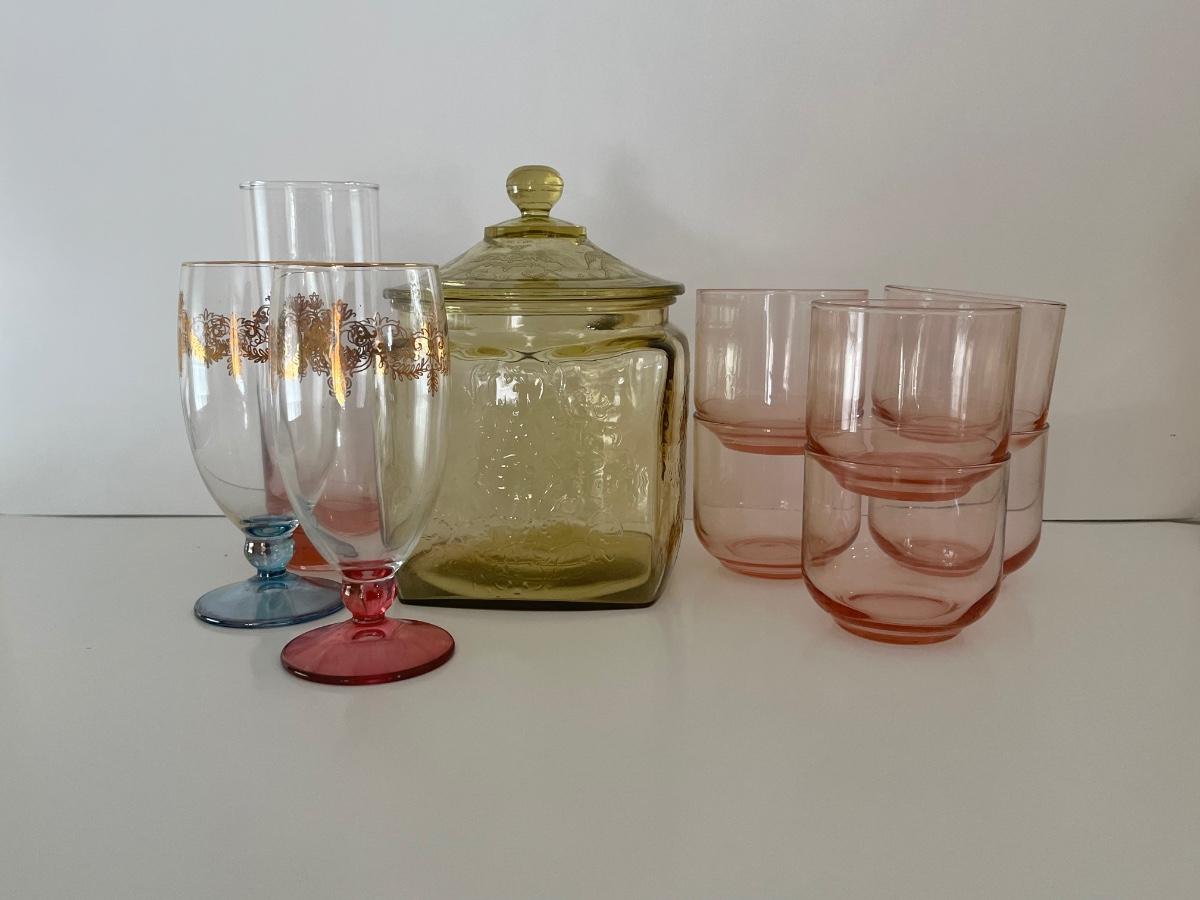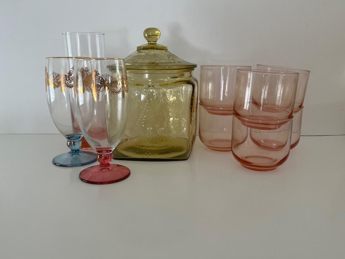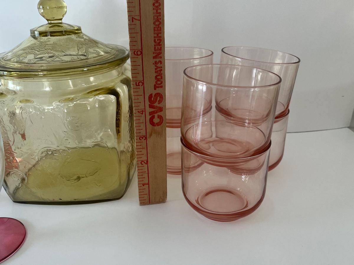 Green/Yellow depression glass jar w/ lid, 6 pink juice glasses, 1 pink tall glass and 2 vintage wine glasses. Please see all pictures as they are the best representation of the items. The pictures show condition, measurements if taken, and what is included in the lot. Due to the large amount that we photograph and the time frame, we are not always able to take measurements. All items unless noted, are pre-owned and have been used. If you purchased furniture, you must bring help. We do not allow one person to carry large furniture out on their own. Bring help, tools and a truck for the safety of our client’s homes, and your personal safety. Any damages that result to the property including walls, and floors due to moving of the furniture will be charged to the buyer. Company policy. Thank you.