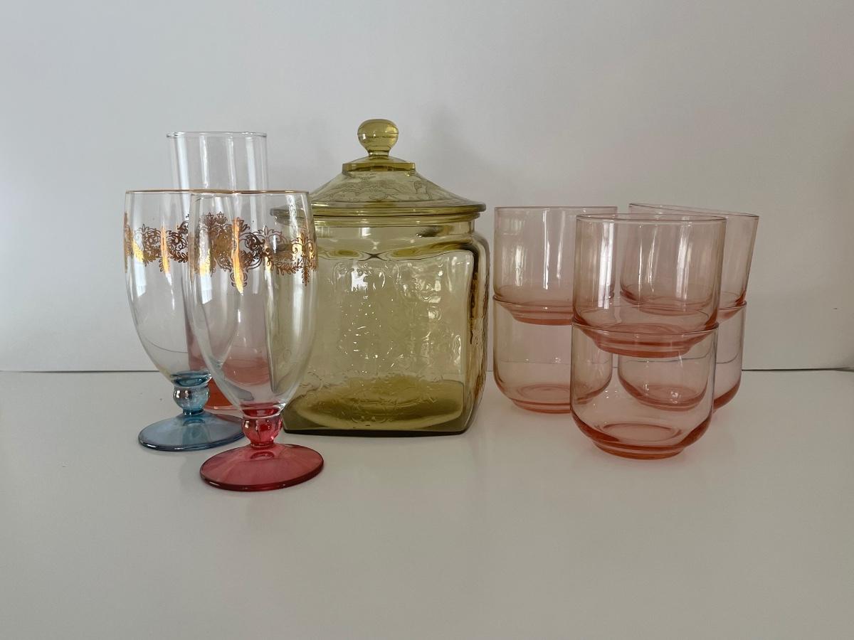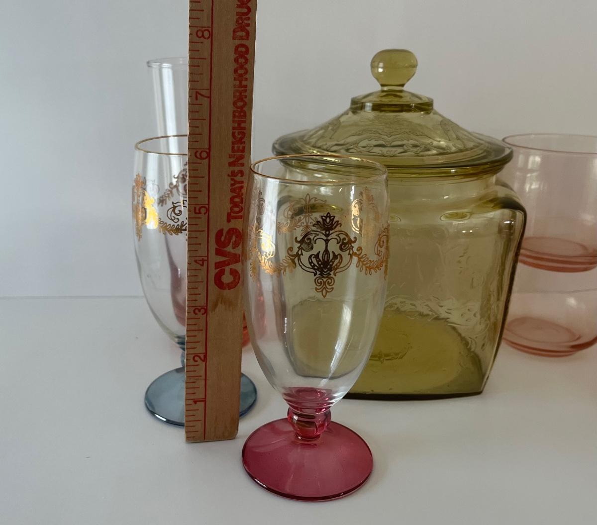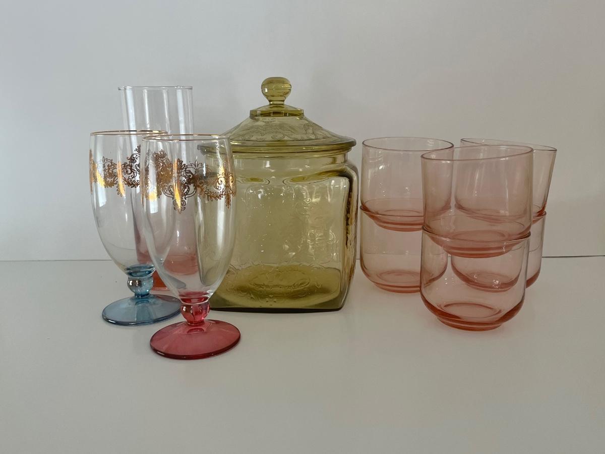 Green/Yellow depression glass jar w/ lid, 6 pink juice glasses, 1 pink tall glass and 2 vintage wine glasses. Please see all pictures as they are the best representation of the items. The pictures show condition, measurements if taken, and what is included in the lot. Due to the large amount that we photograph and the time frame, we are not always able to take measurements. All items unless noted, are pre-owned and have been used. If you purchased furniture, you must bring help. We do not allow one person to carry large furniture out on their own. Bring help, tools and a truck for the safety of our client’s homes, and your personal safety. Any damages that result to the property including walls, and floors due to moving of the furniture will be charged to the buyer. Company policy. Thank you.