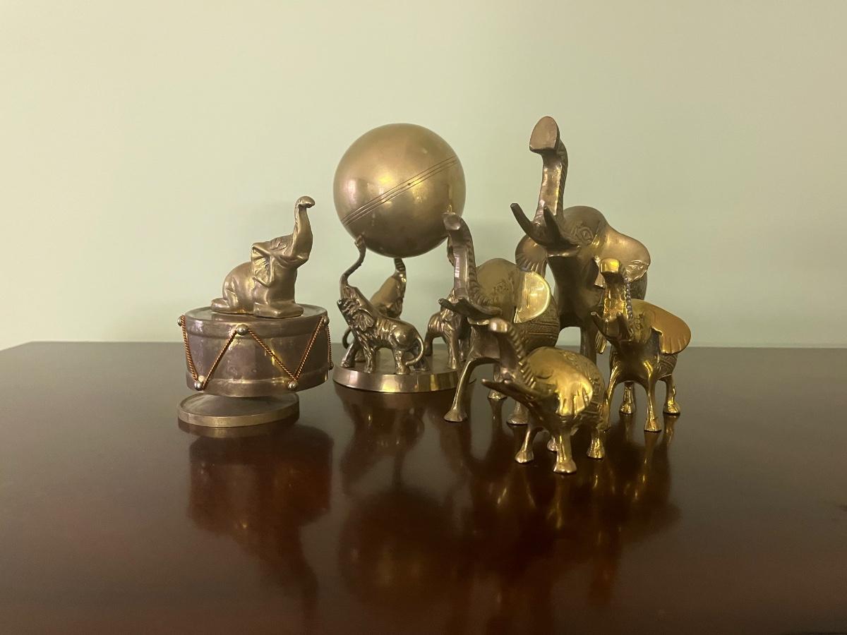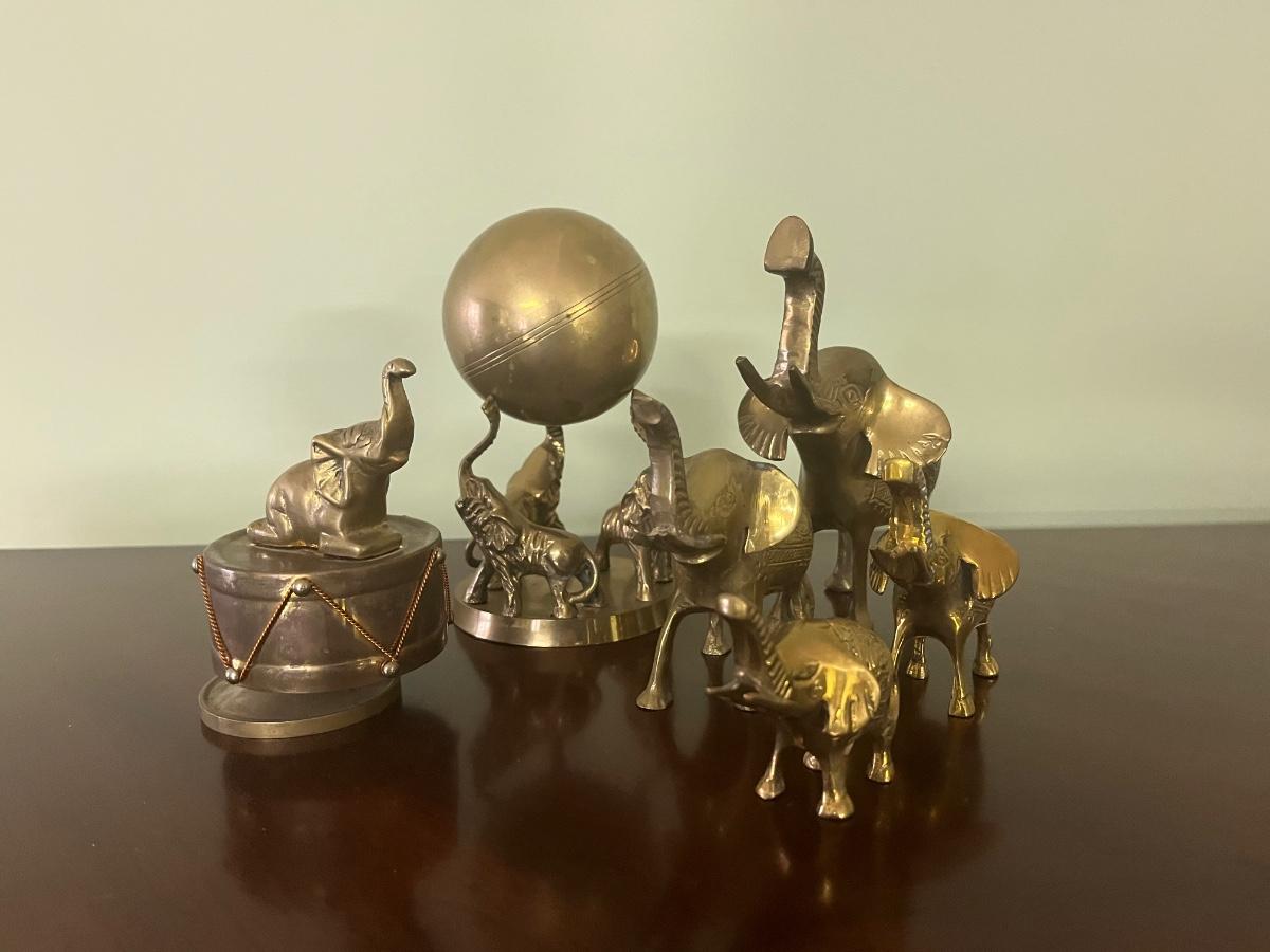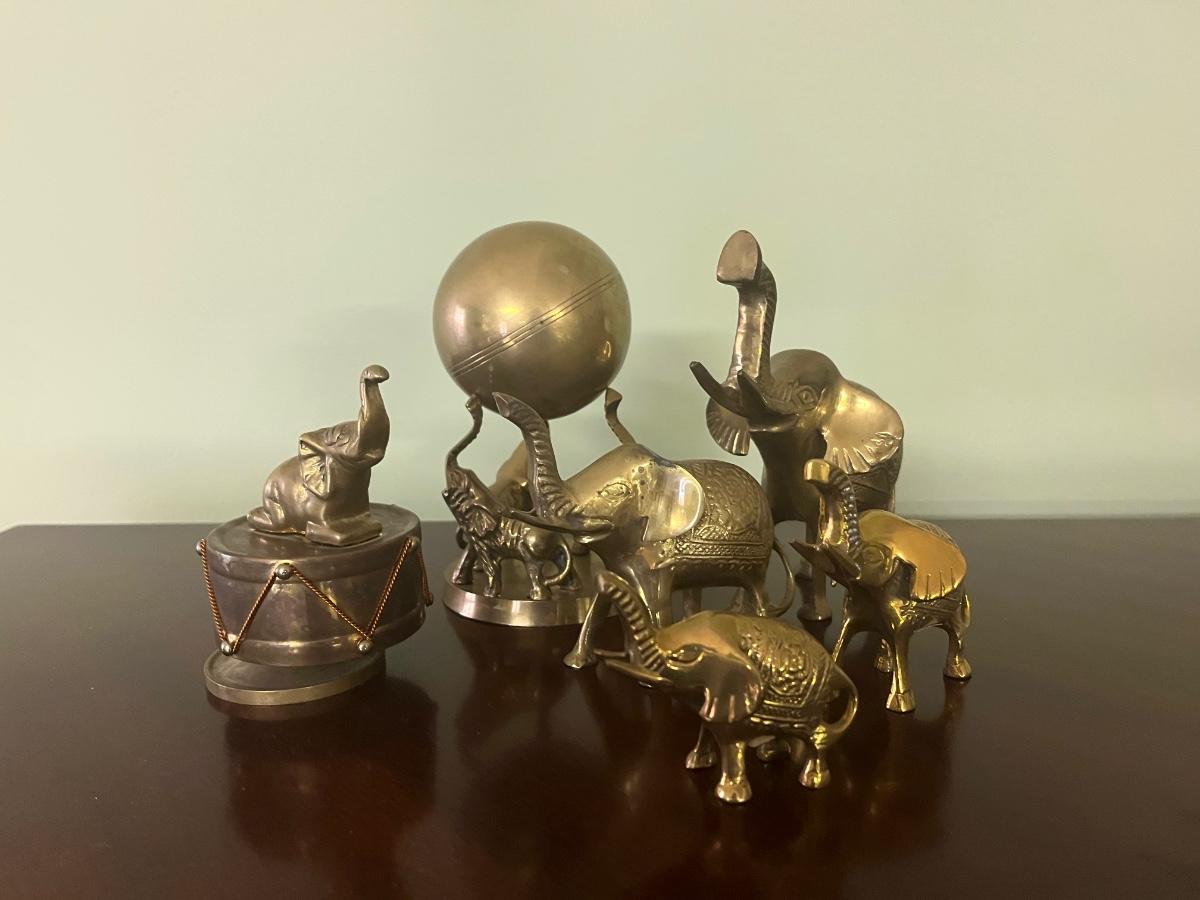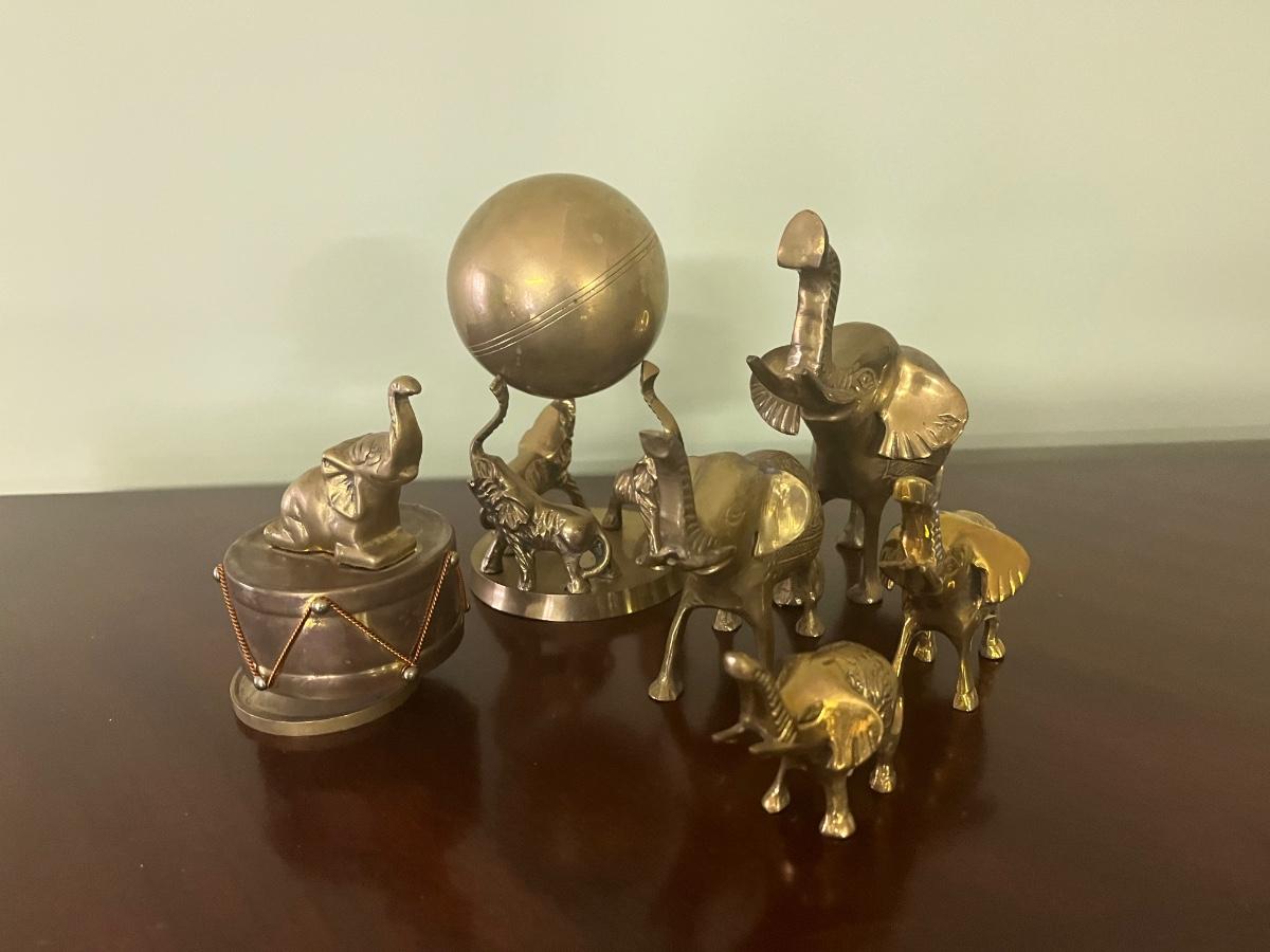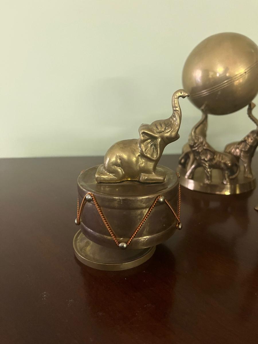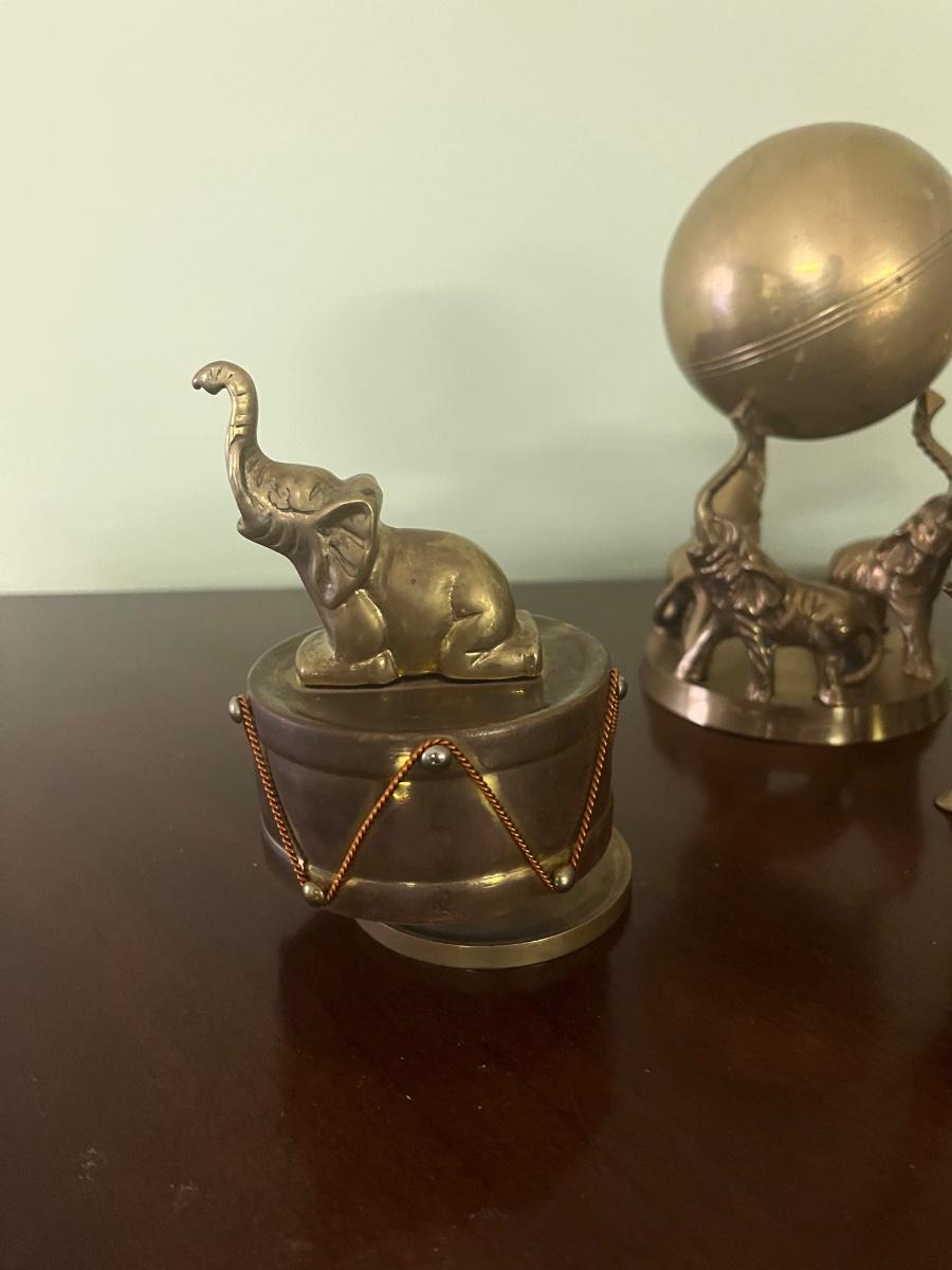Unique brass circus themed elephant working music box, brass elephants holding ball/balloon and 4 more brass elephants
