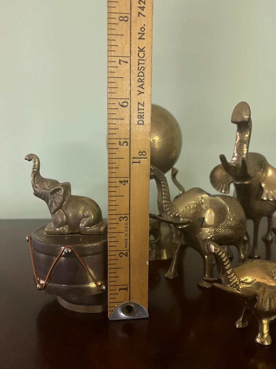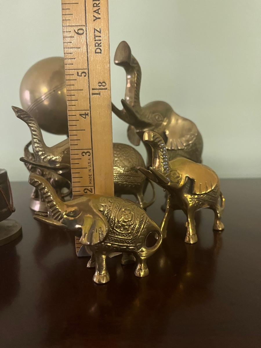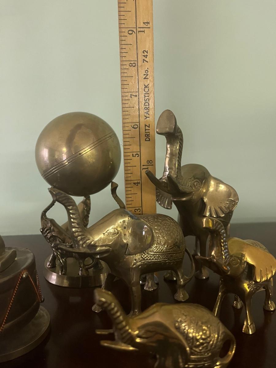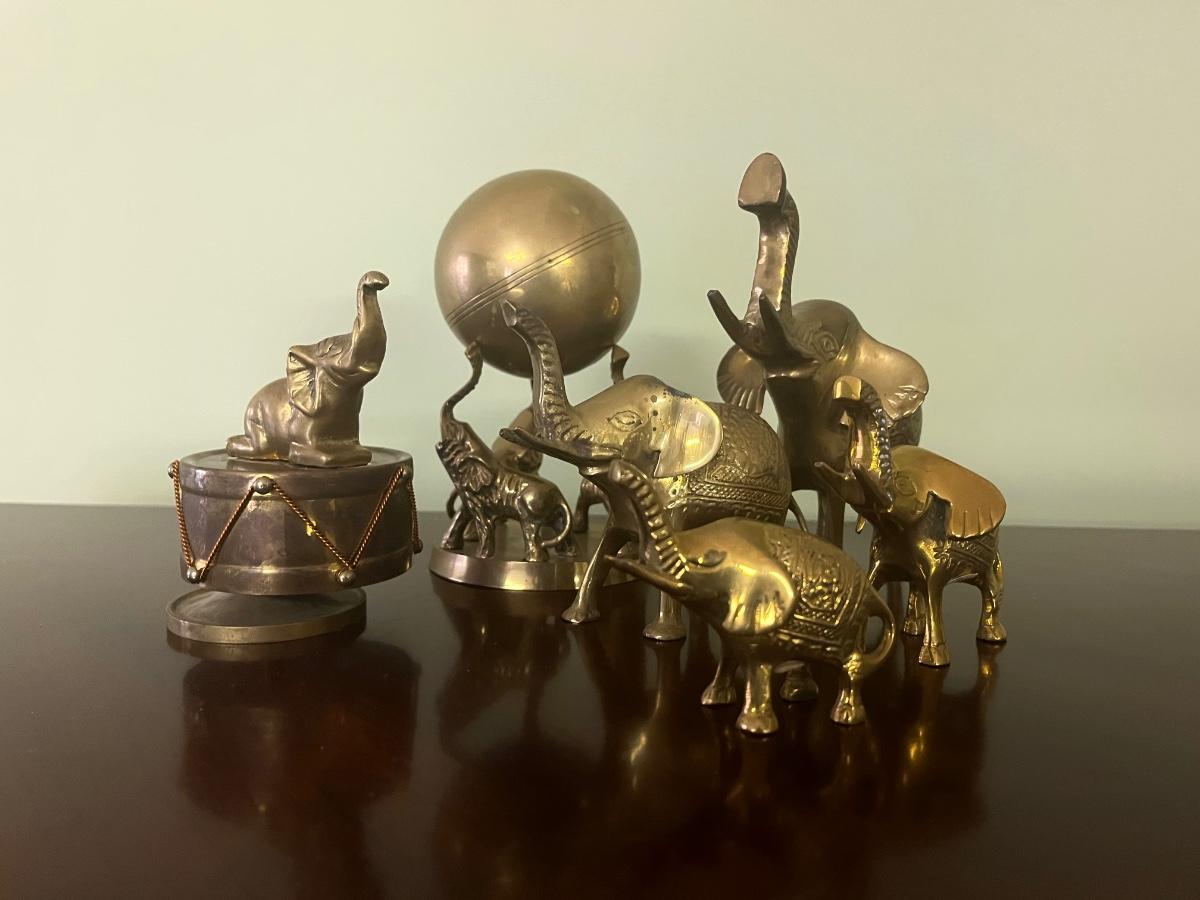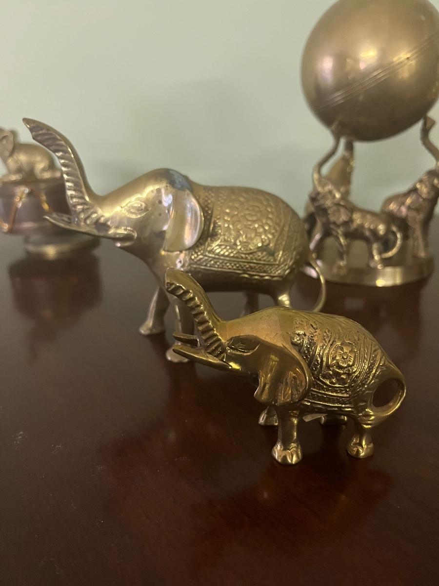 Unique brass circus themed elephant working music box, brass elephants holding ball/balloon and 4 more brass elephants