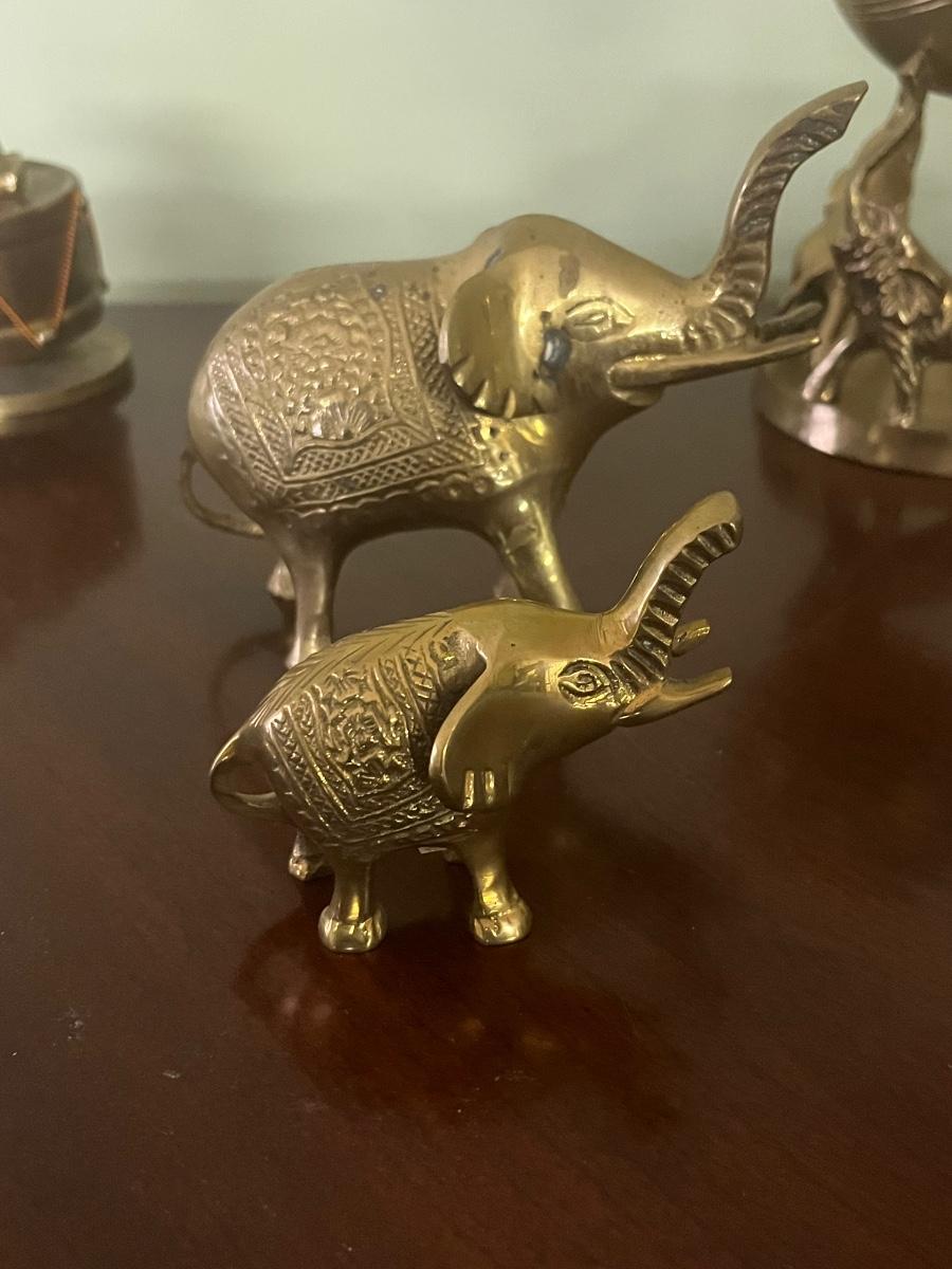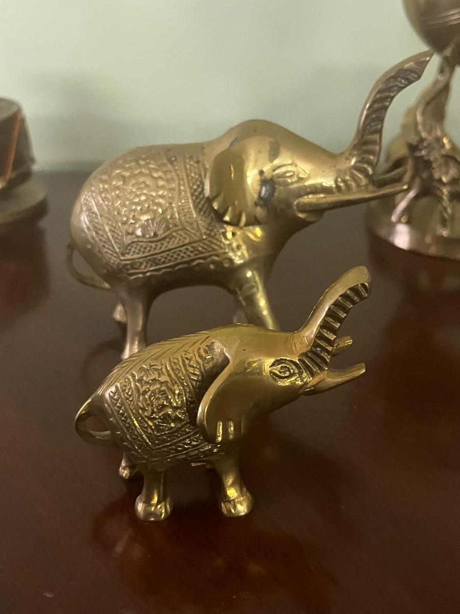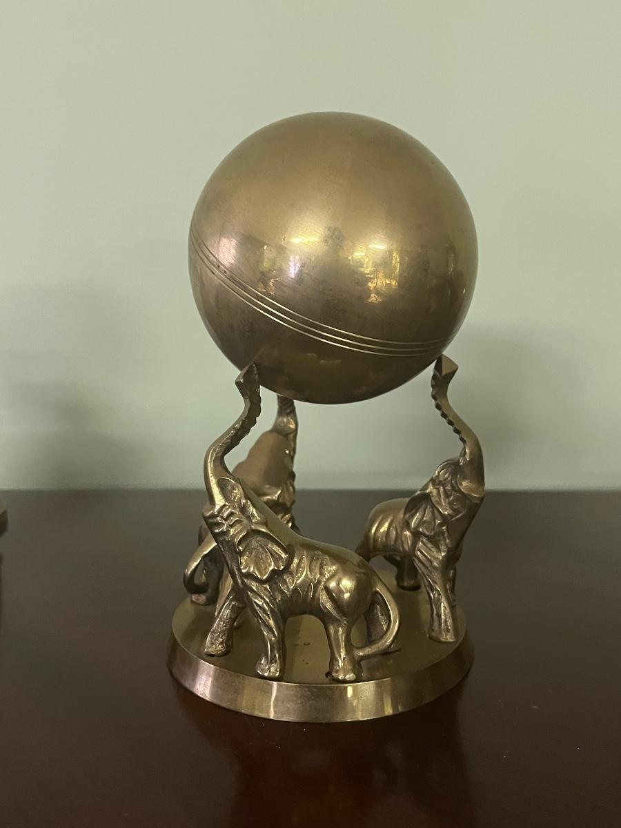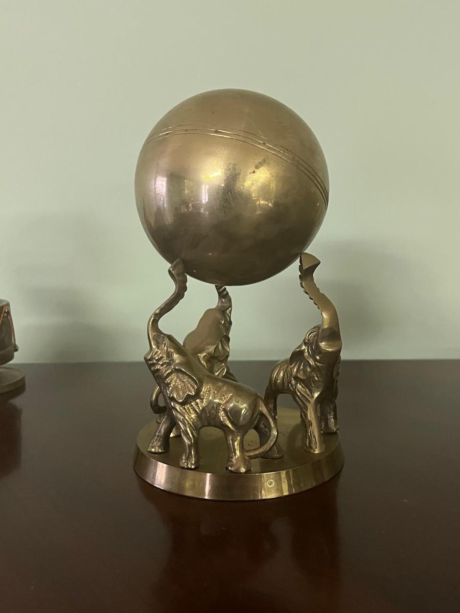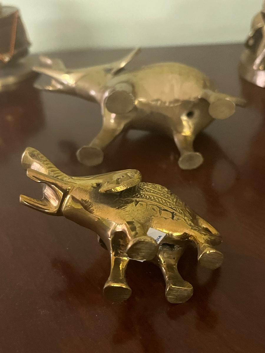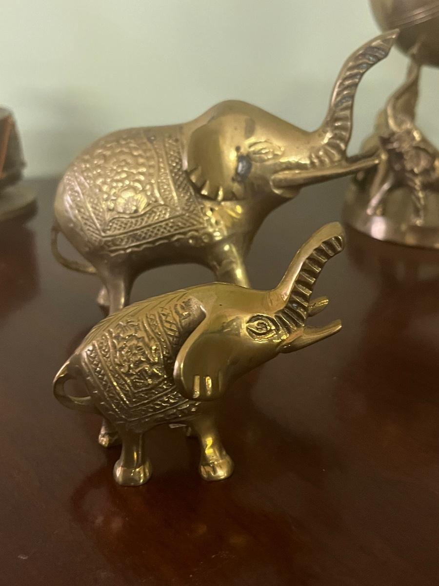 Unique brass circus themed elephant working music box, brass elephants holding ball/balloon and 4 more brass elephants