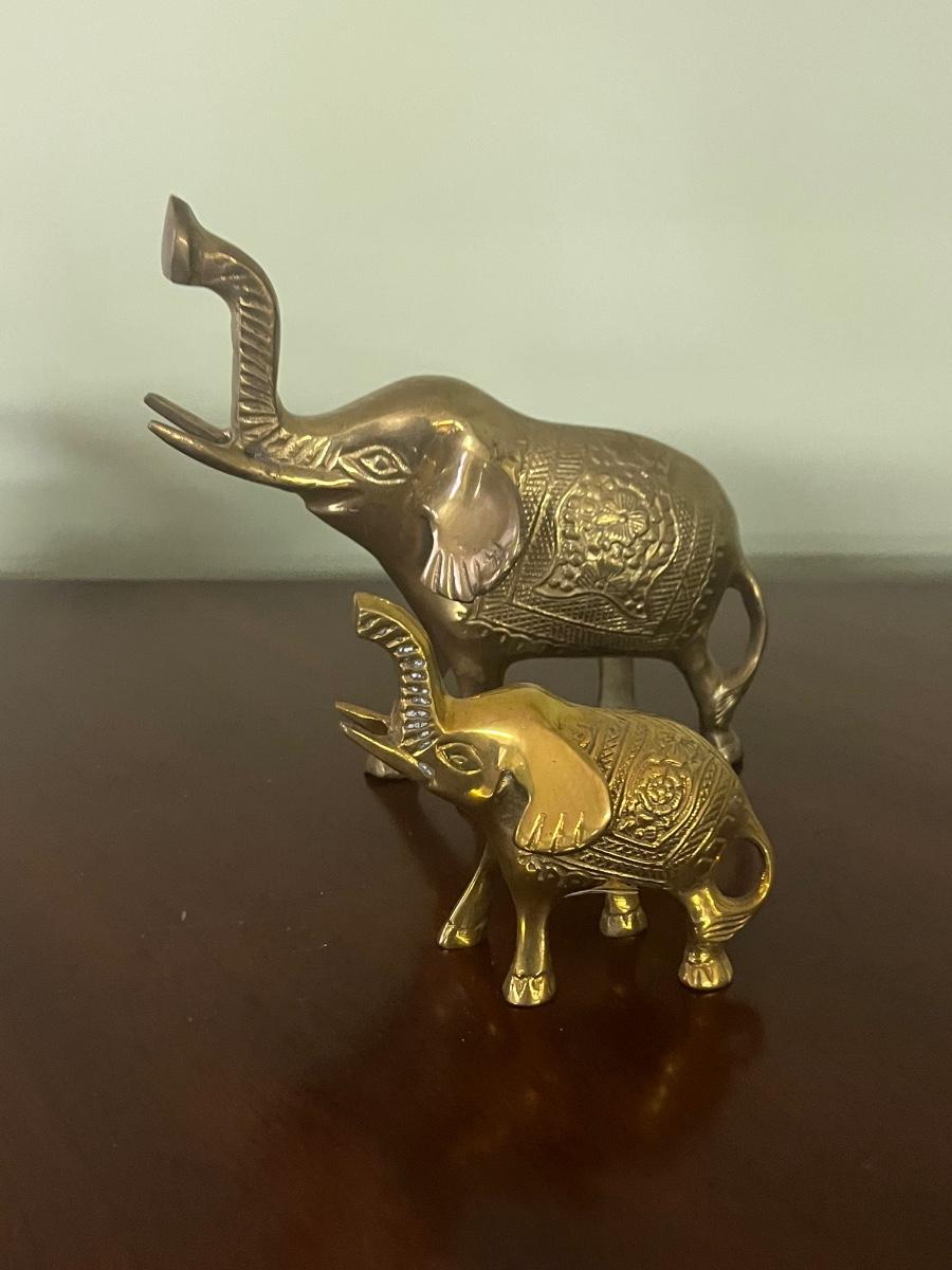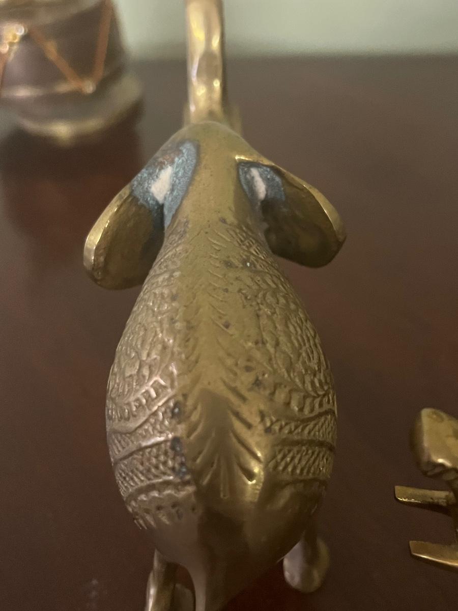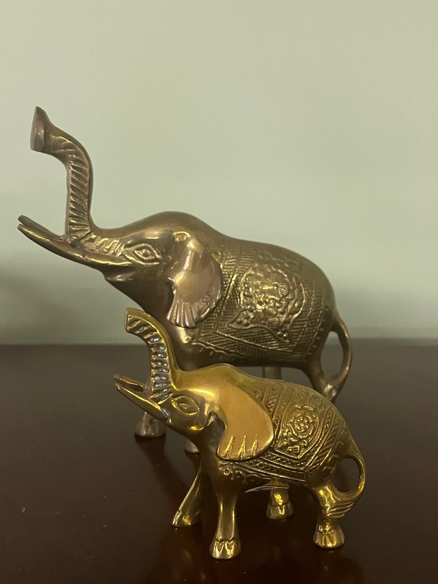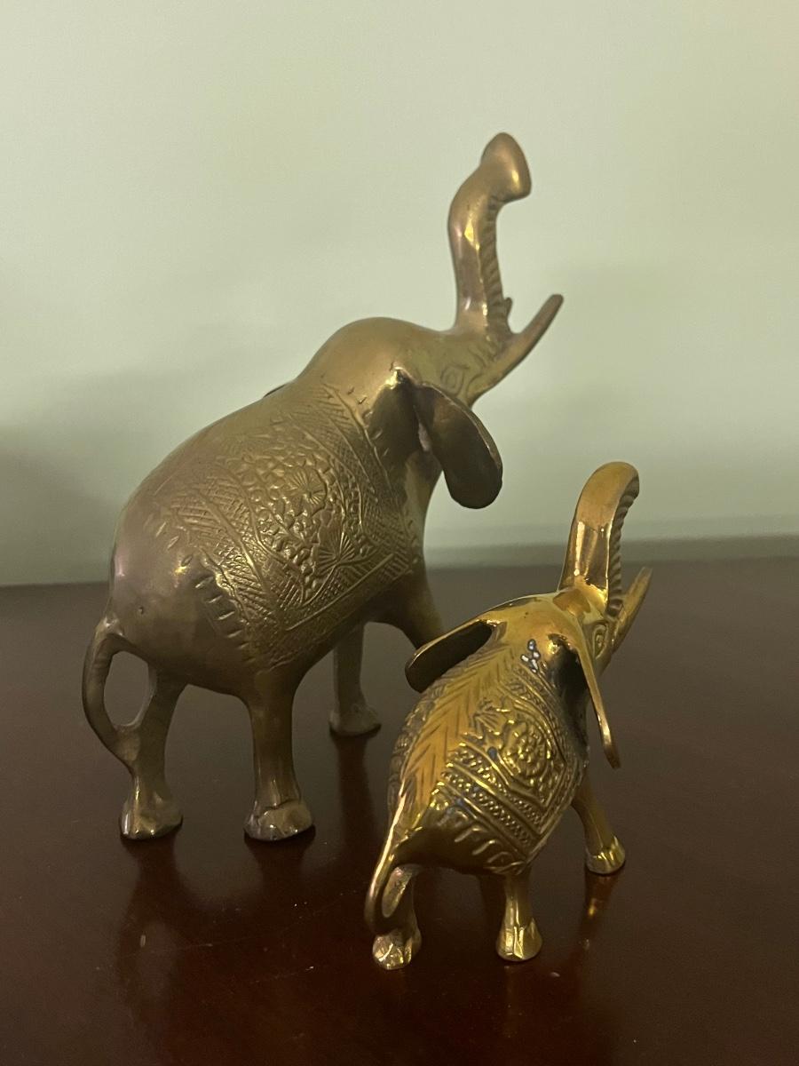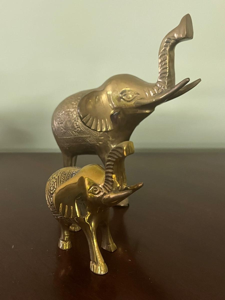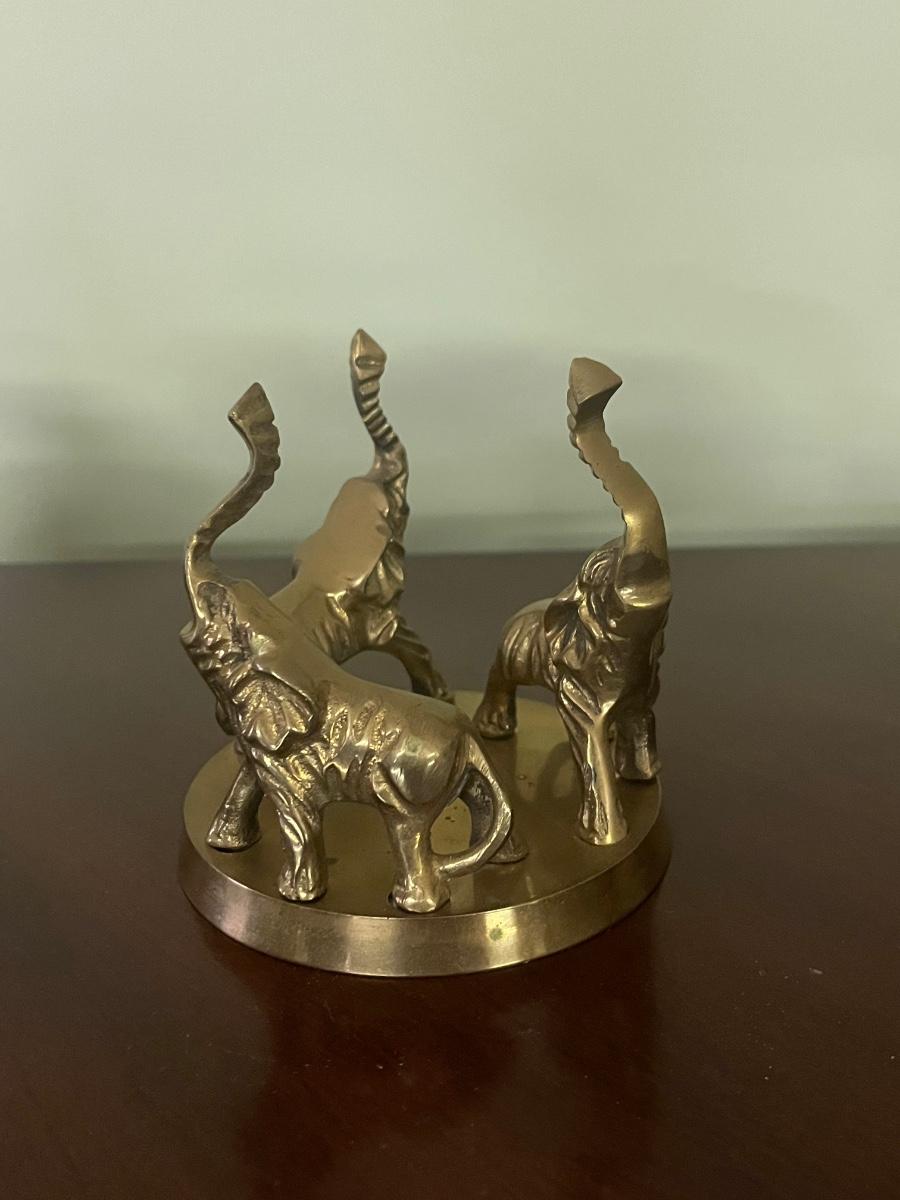 Unique brass circus themed elephant working music box, brass elephants holding ball/balloon and 4 more brass elephants