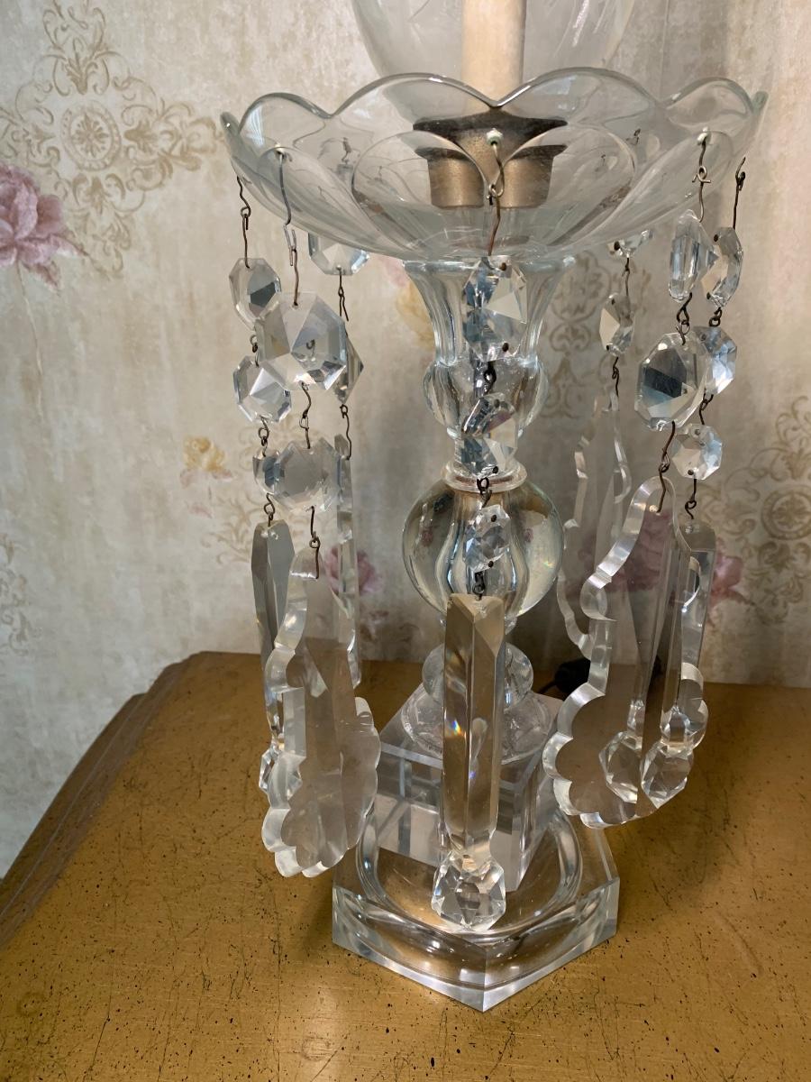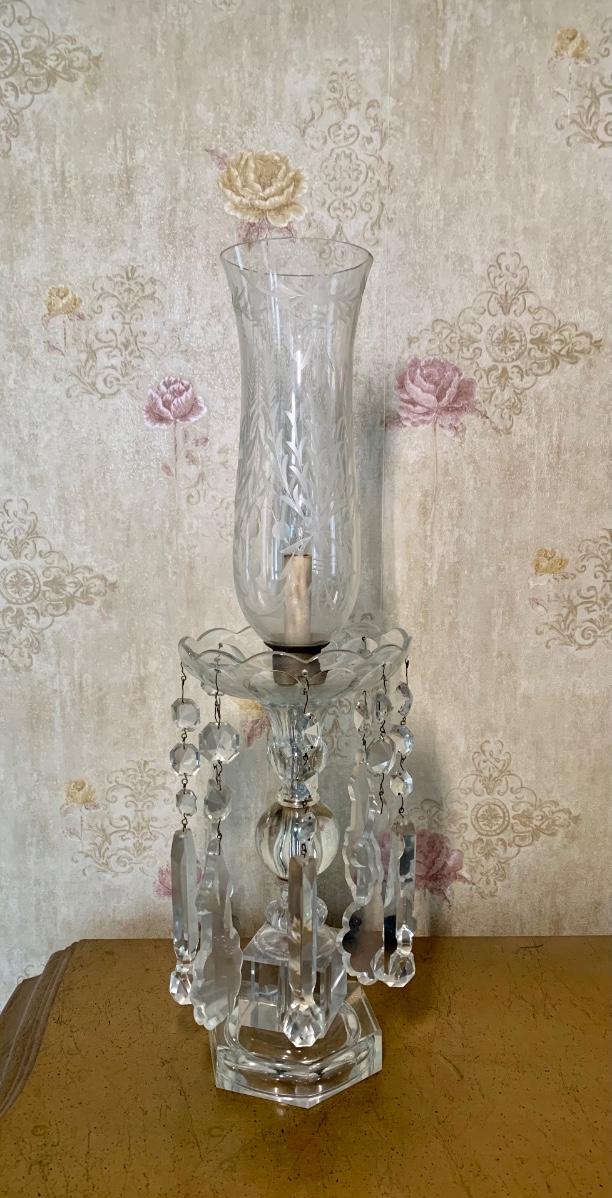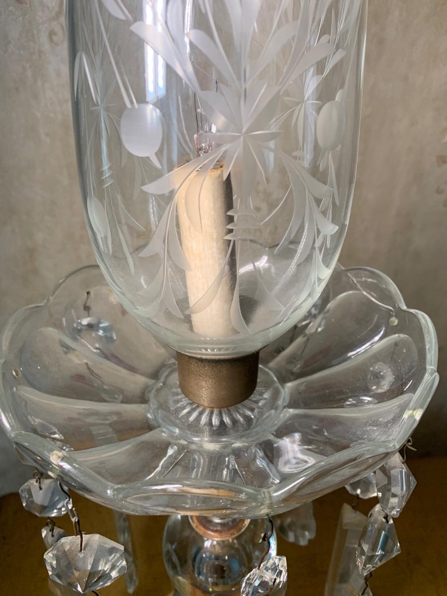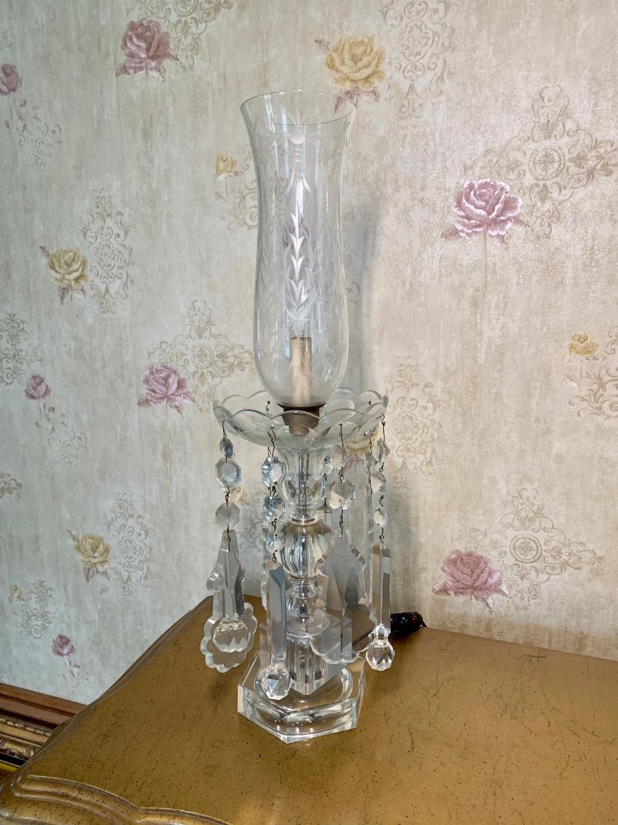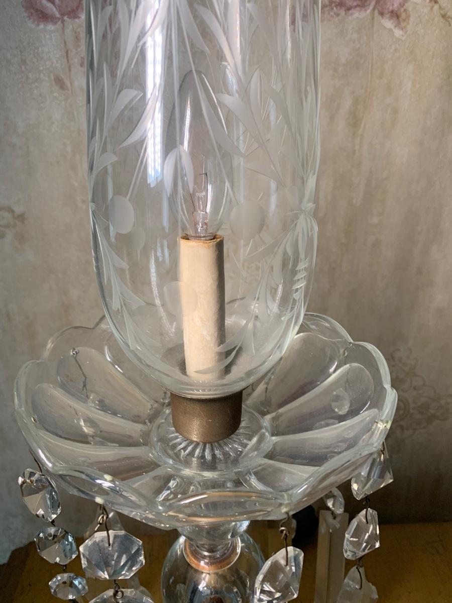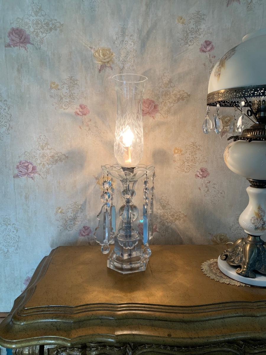 Stunning working crystal hurricane lamp. It is gorgeous and has all of the hanging prisms.