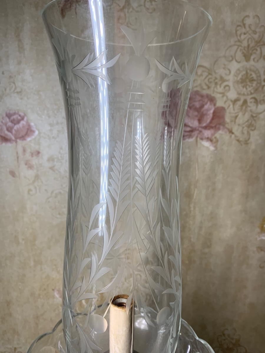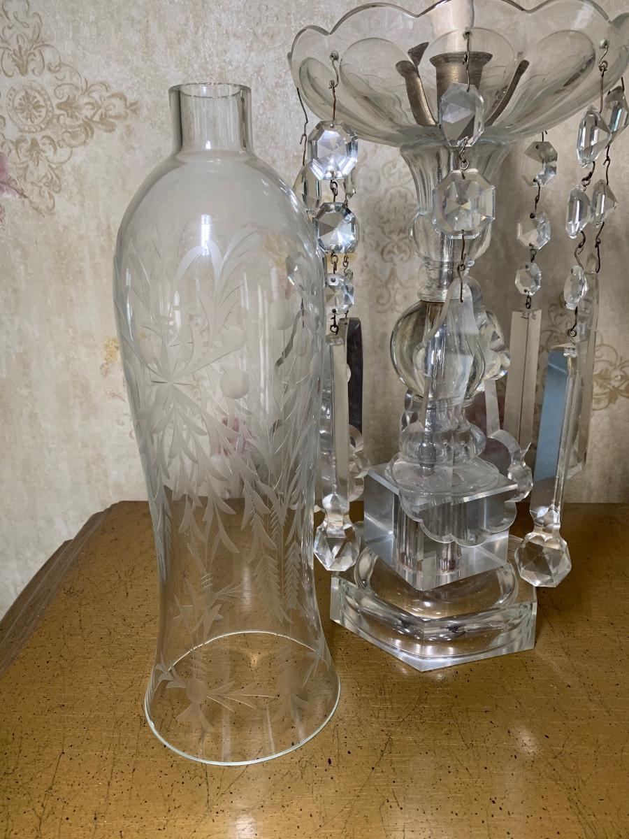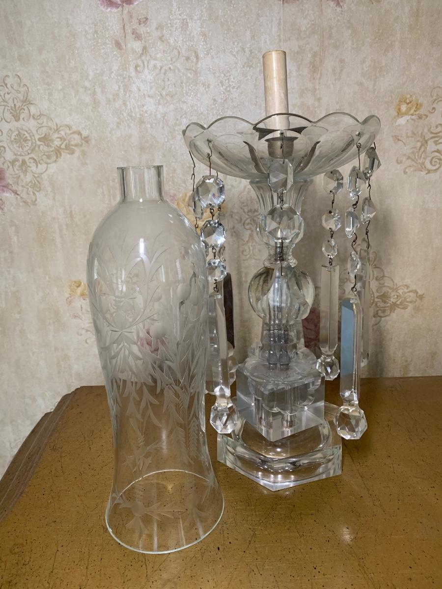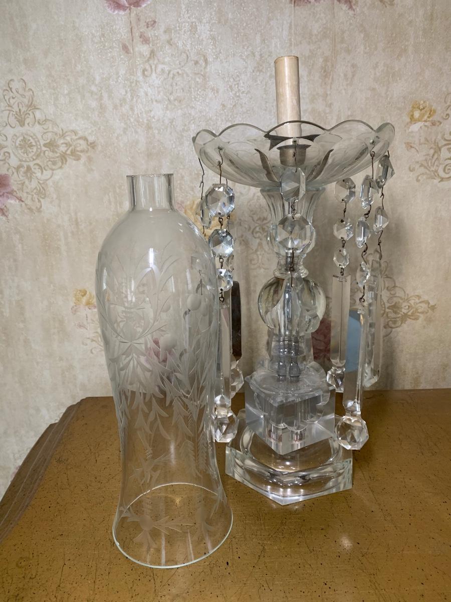 LOT 109R:  Vintage Cut Crystal  Hurricane Lamp w/Prisms & Glass Shade