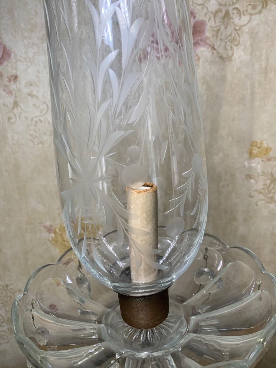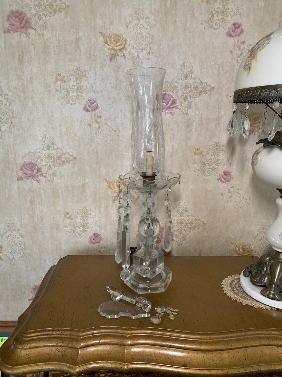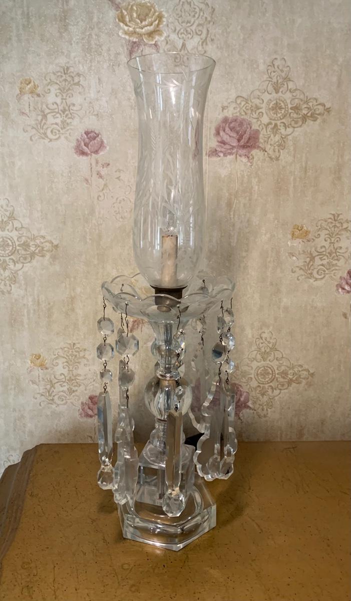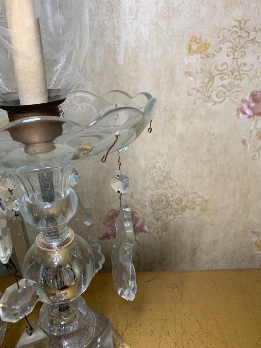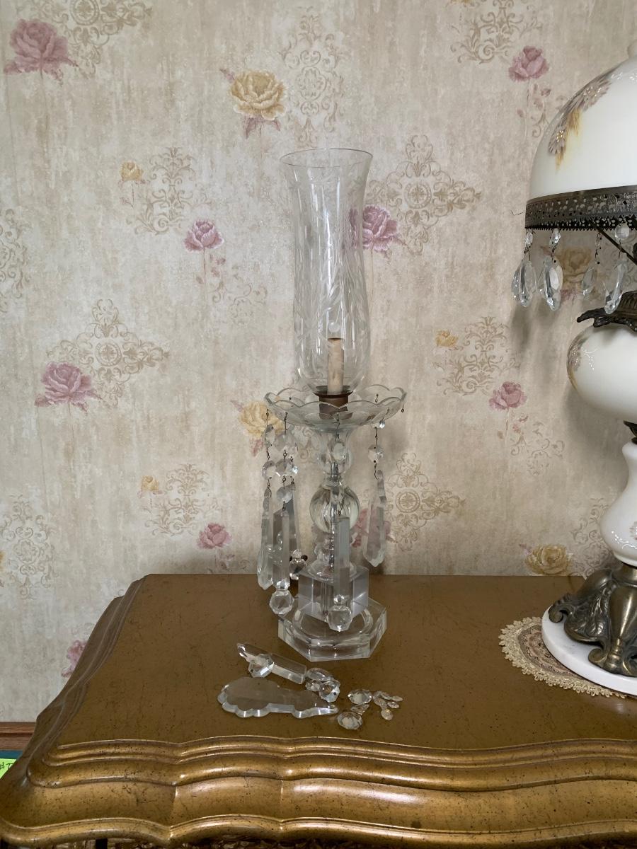 LOT 110R: Vintage Crystal  Hurricane Lamp w/Prisms & Glass Shade