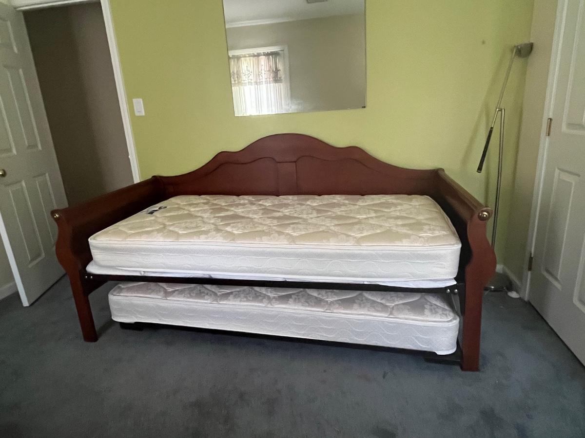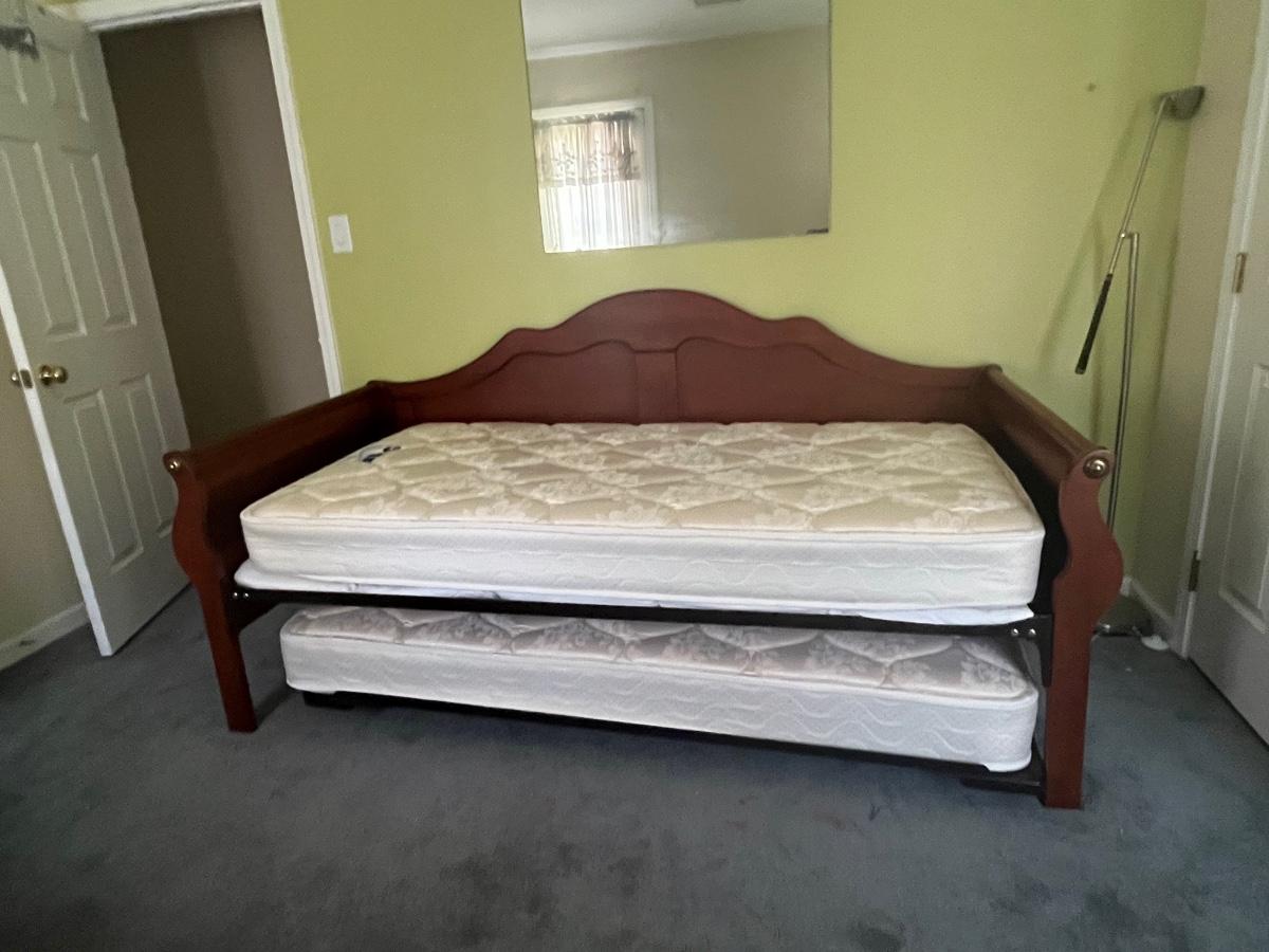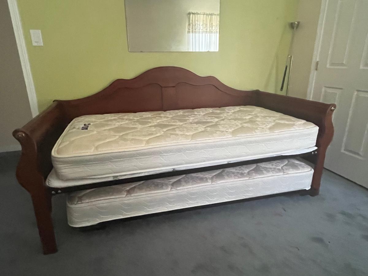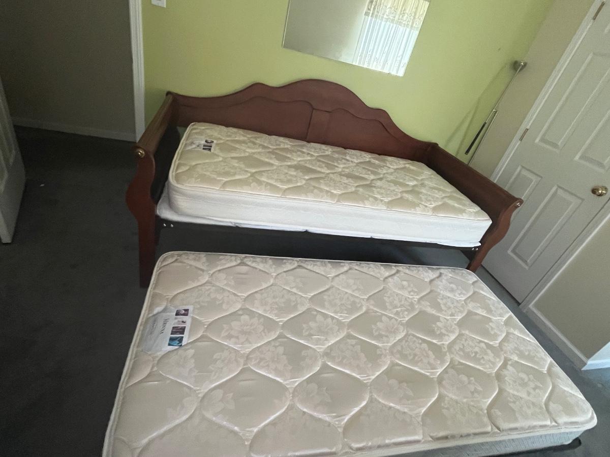 Nice piece of furniture for a spare room or a child's room with a bed for a sleep over and no place to hide "goodies" under it. 83"x41"x42". Mattresses included. Please see all pictures as they are the best representation of the items. The pictures show condition, measurements if taken, and what is included in the lot. Due to the large amount that we photograph and the time frame, we are not always able to take measurements. All items unless noted, are pre-owned and have been used. If you purchased furniture, you must bring help. We do not allow one person to carry large furniture out on their own. Bring help, tools and a truck for the safety of our client’s homes, and your personal safety. Any damages that result to the property including walls, and floors due to moving of the furniture will be charged to the buyer. Company policy. Thank you.