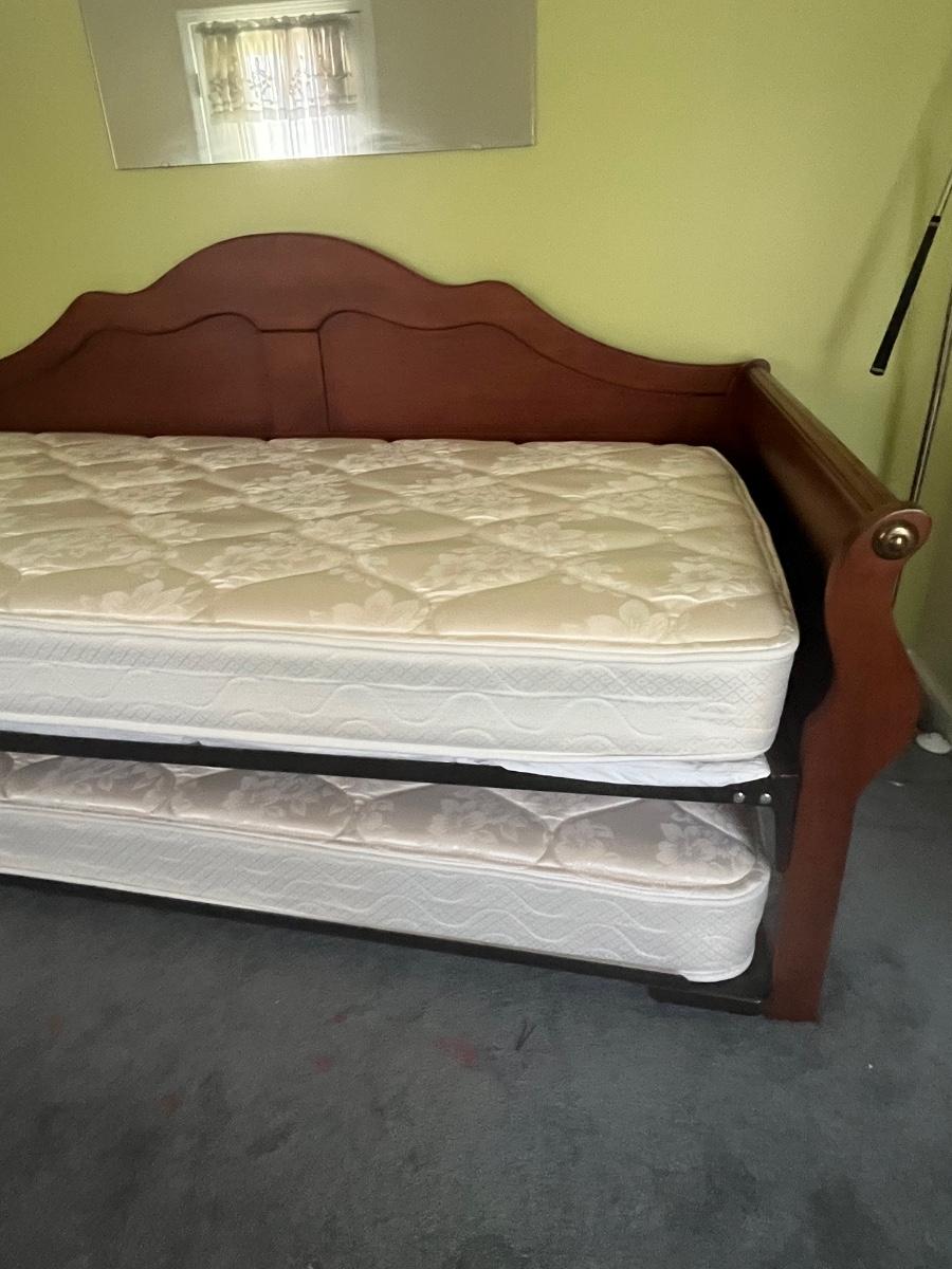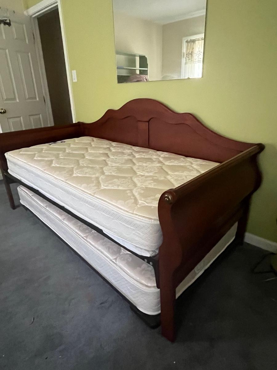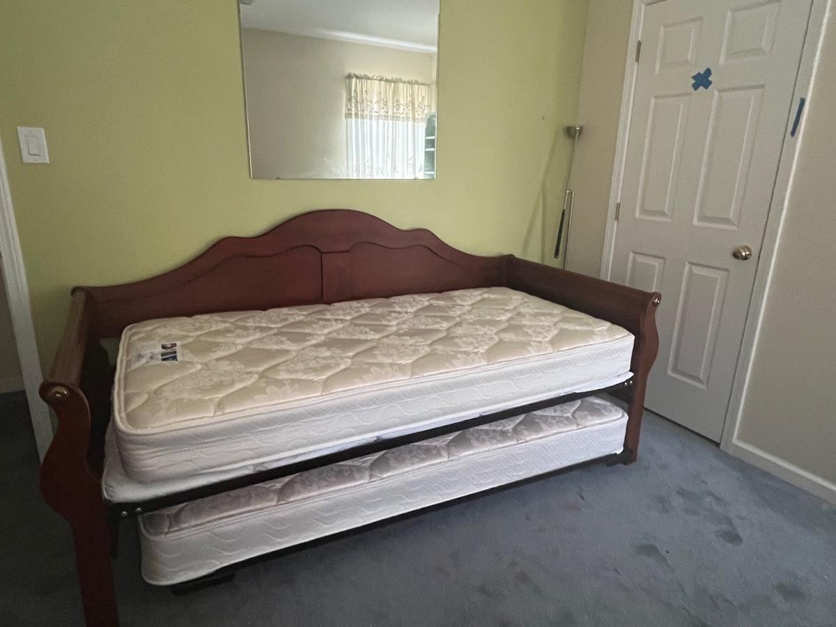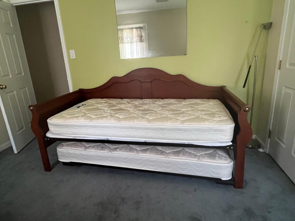 Nice piece of furniture for a spare room or a child's room with a bed for a sleep over and no place to hide "goodies" under it. 83"x41"x42". Mattresses included. Please see all pictures as they are the best representation of the items. The pictures show condition, measurements if taken, and what is included in the lot. Due to the large amount that we photograph and the time frame, we are not always able to take measurements. All items unless noted, are pre-owned and have been used. If you purchased furniture, you must bring help. We do not allow one person to carry large furniture out on their own. Bring help, tools and a truck for the safety of our client’s homes, and your personal safety. Any damages that result to the property including walls, and floors due to moving of the furniture will be charged to the buyer. Company policy. Thank you.