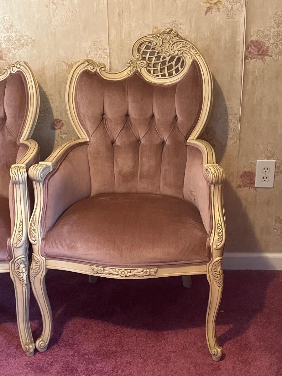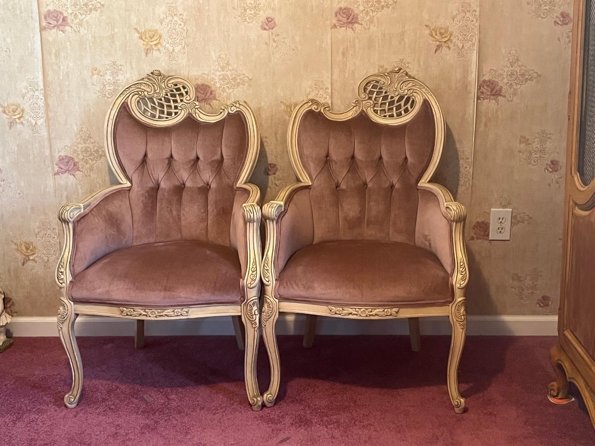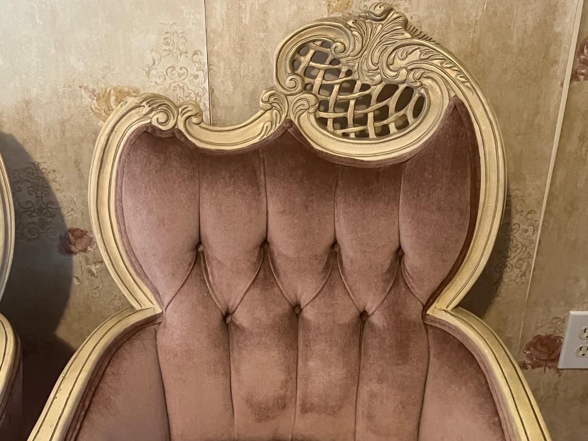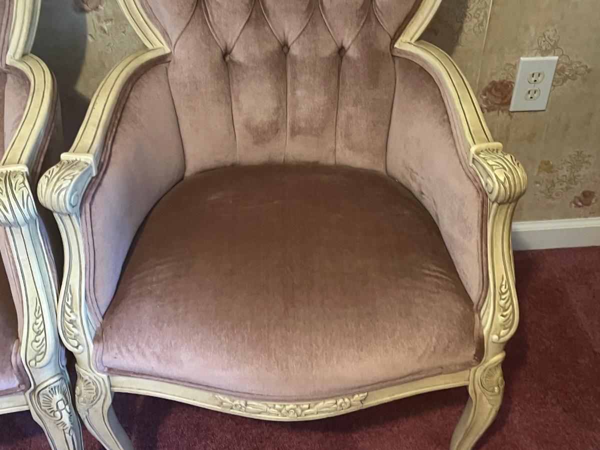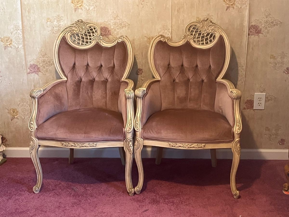 LOT 125C: Vintage Ornate Carved, Mauve Velvet, French Provincial Tufted Chairs