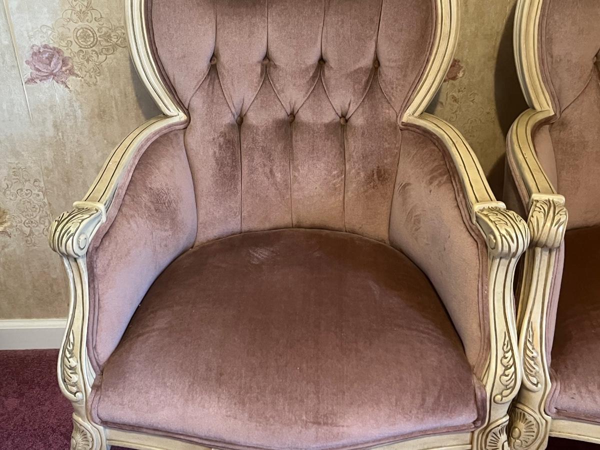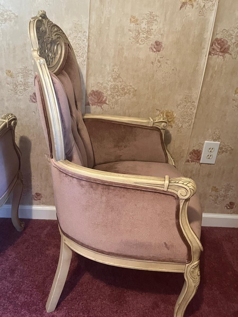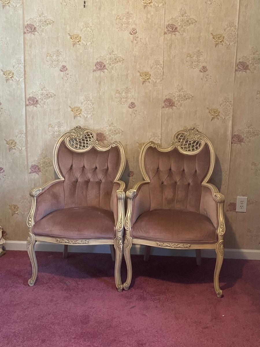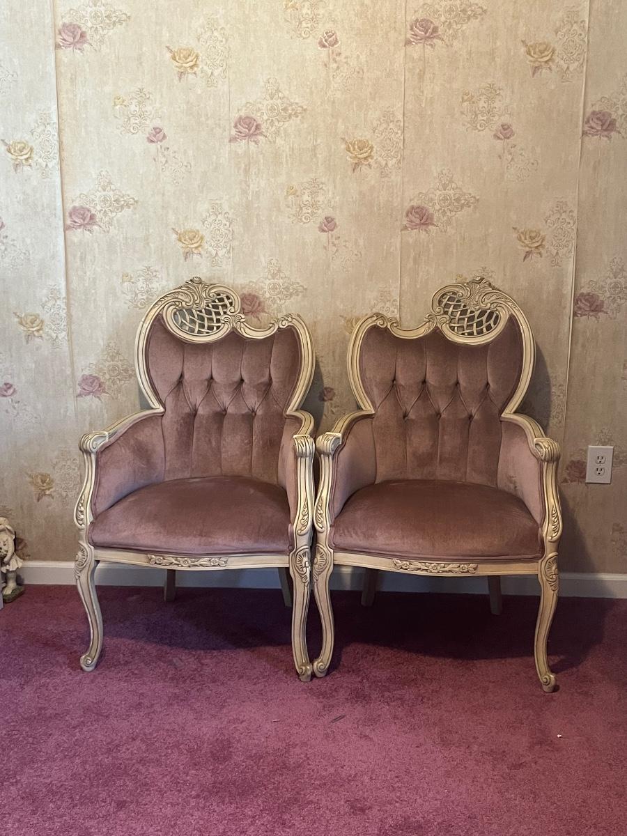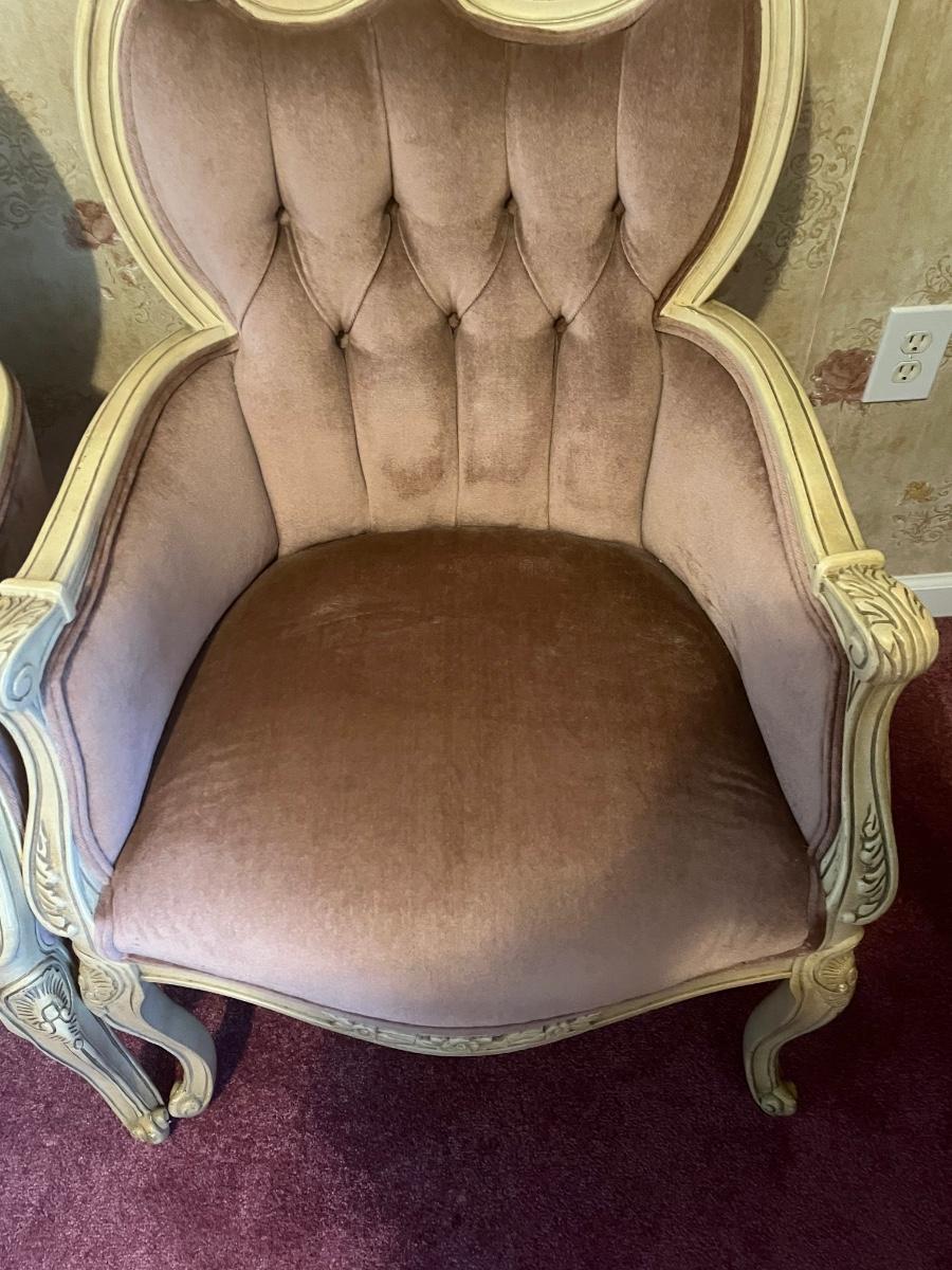 LOT 125C: Vintage Ornate Carved, Mauve Velvet, French Provincial Tufted Chairs