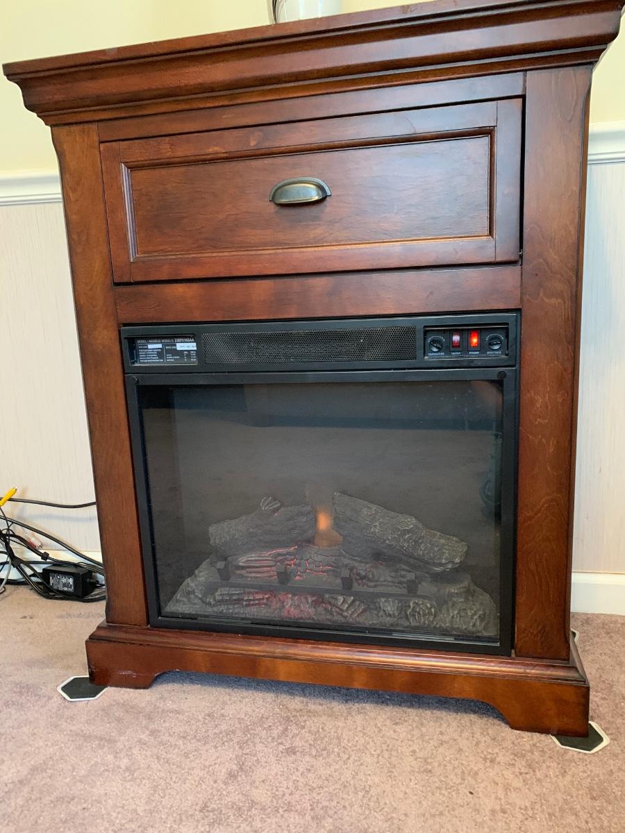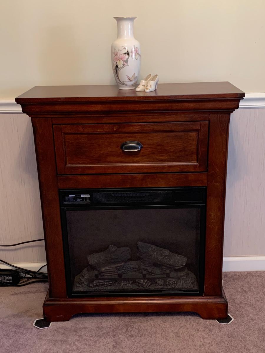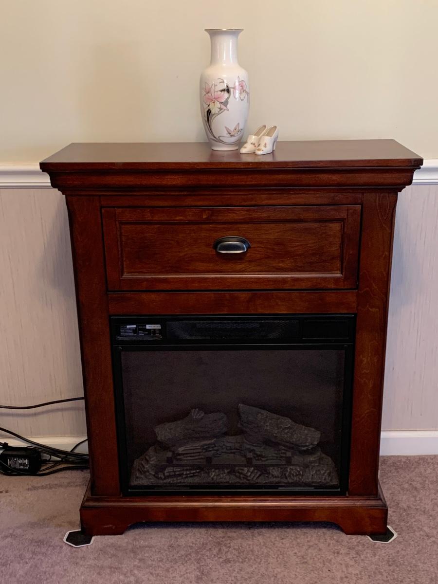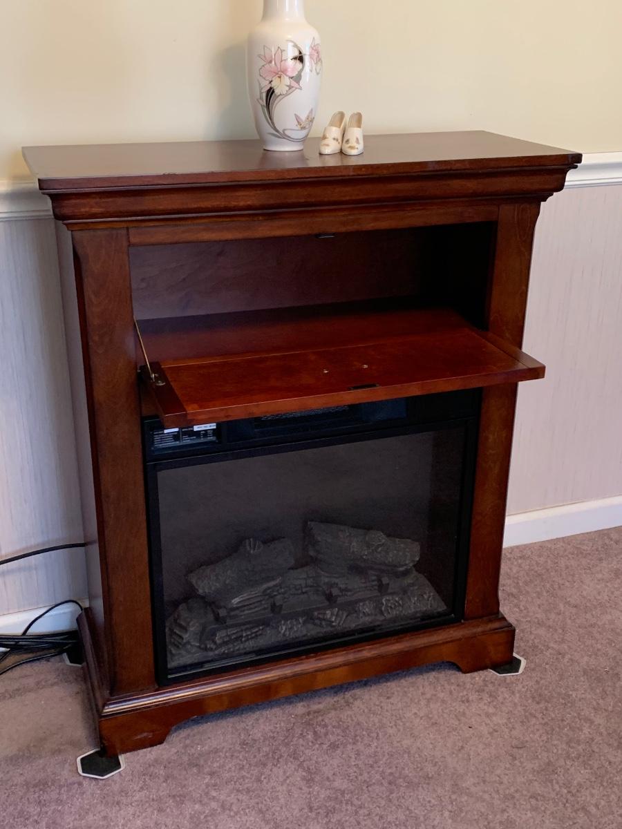 Working electric fireplace with drop down storage (32 x 12.5 x 38) Vase and shoes are included.