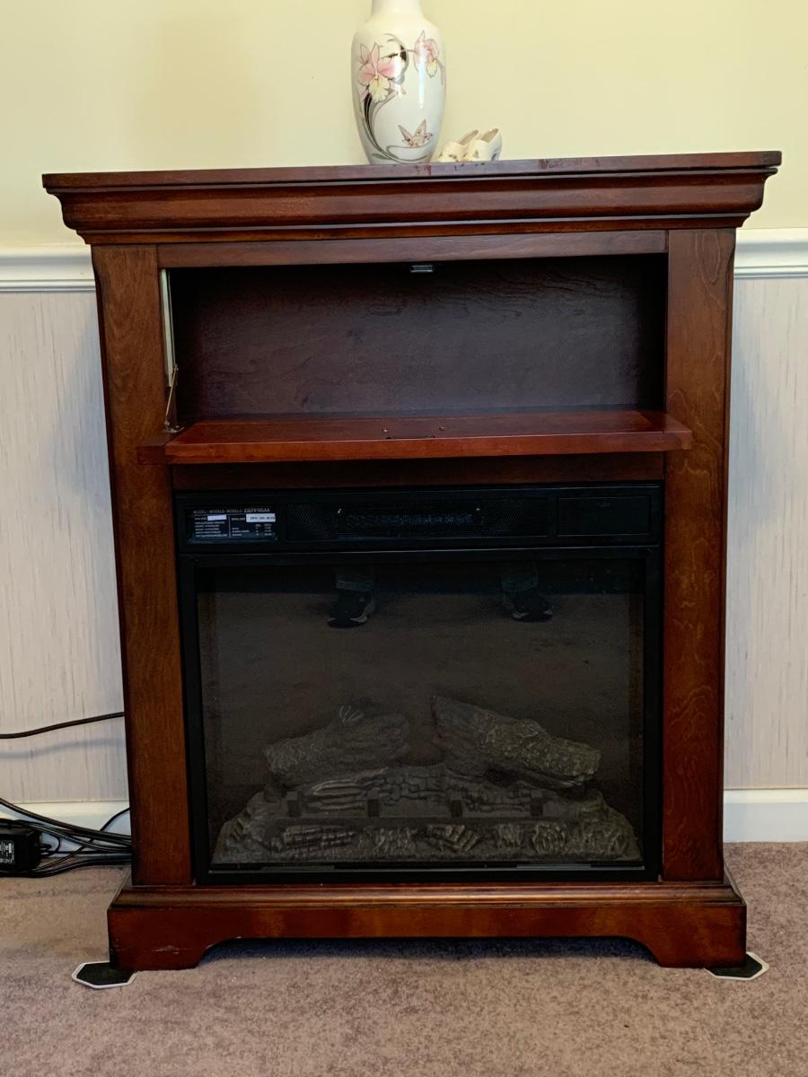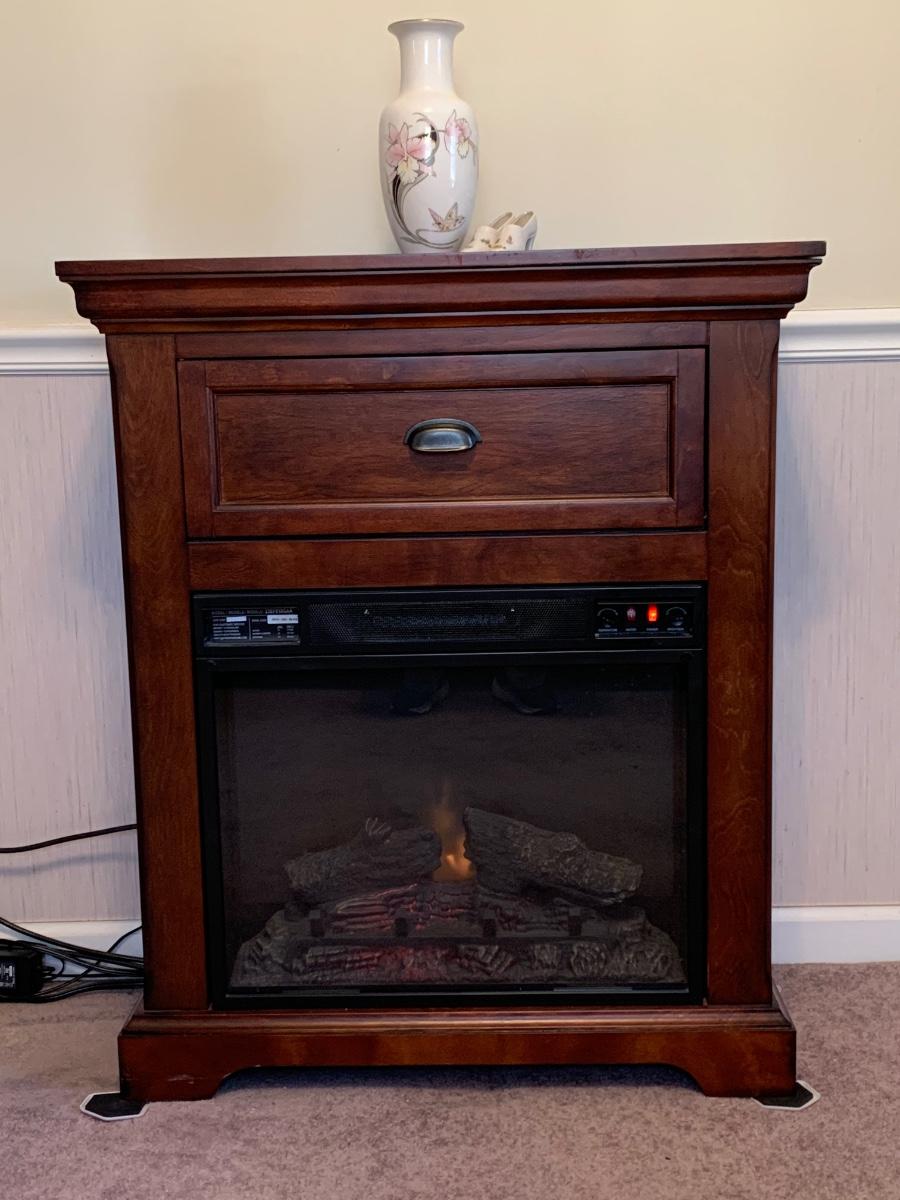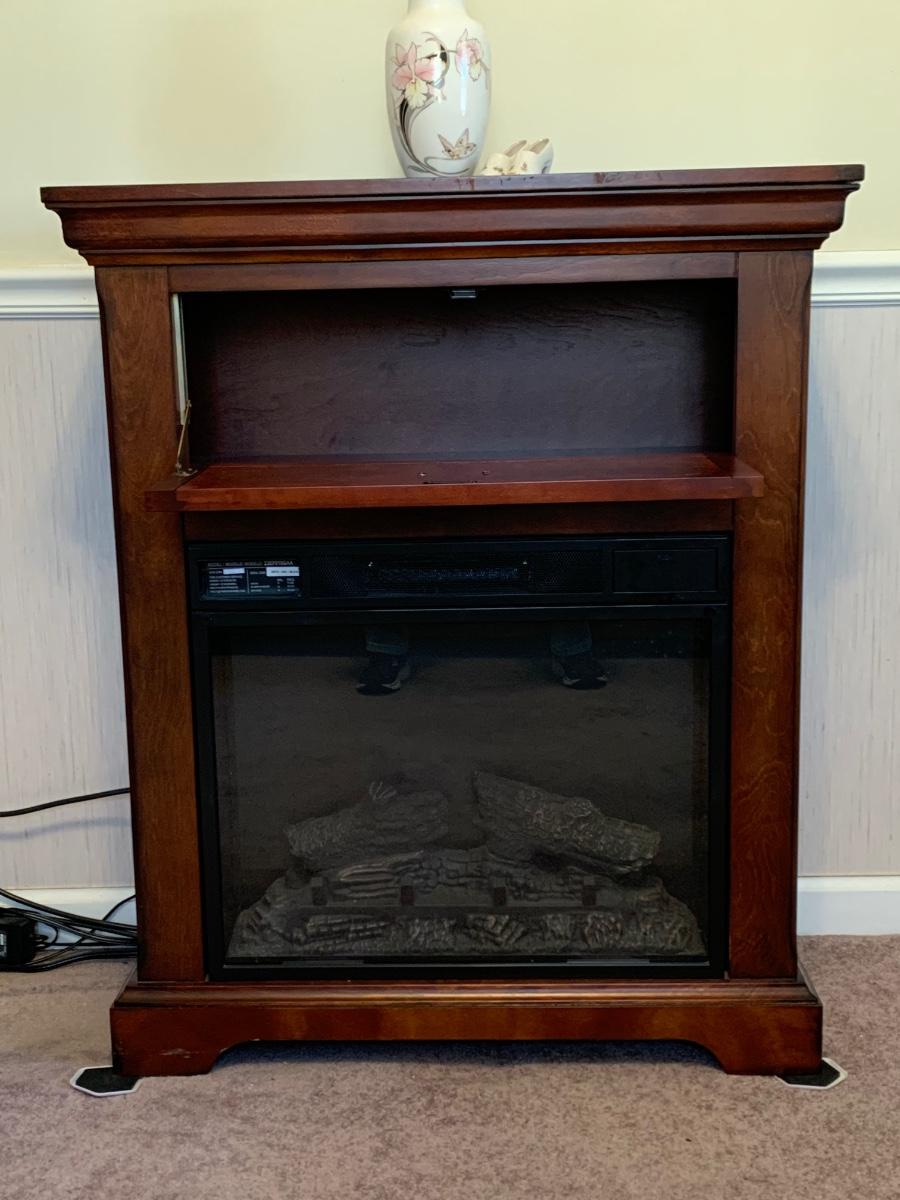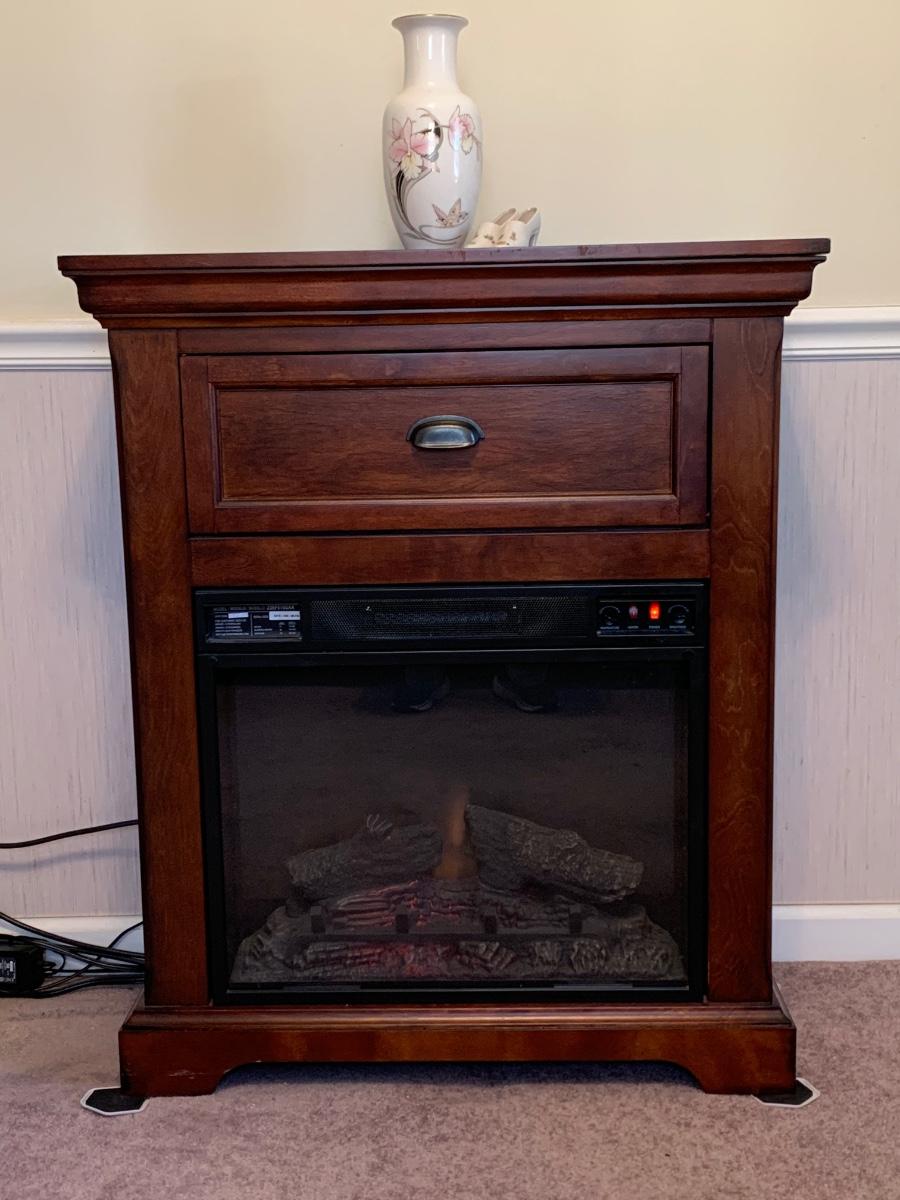Working electric fireplace with drop down storage (32 x 12.5 x 38) Vase and shoes are included.