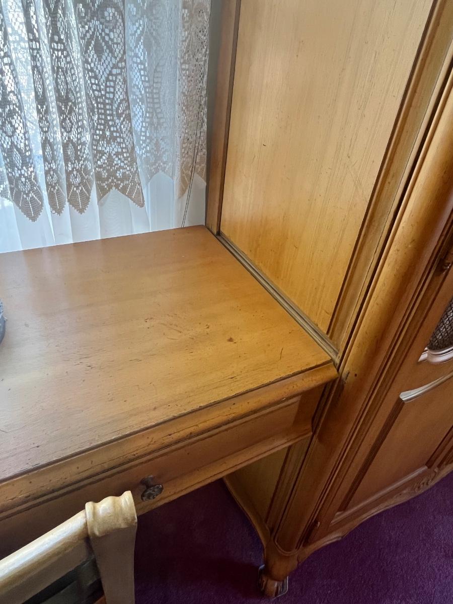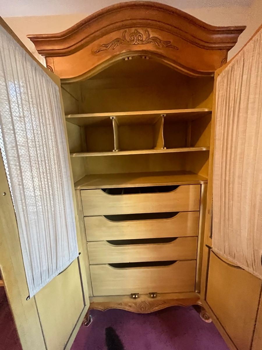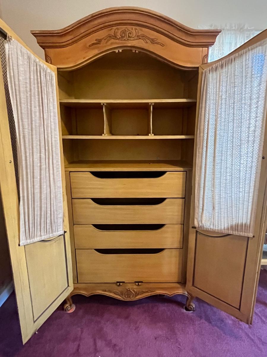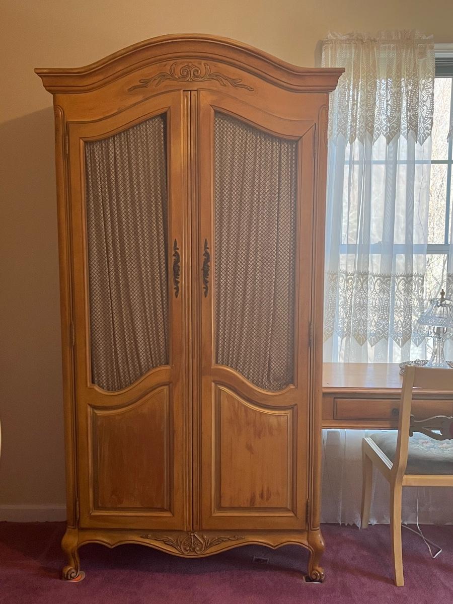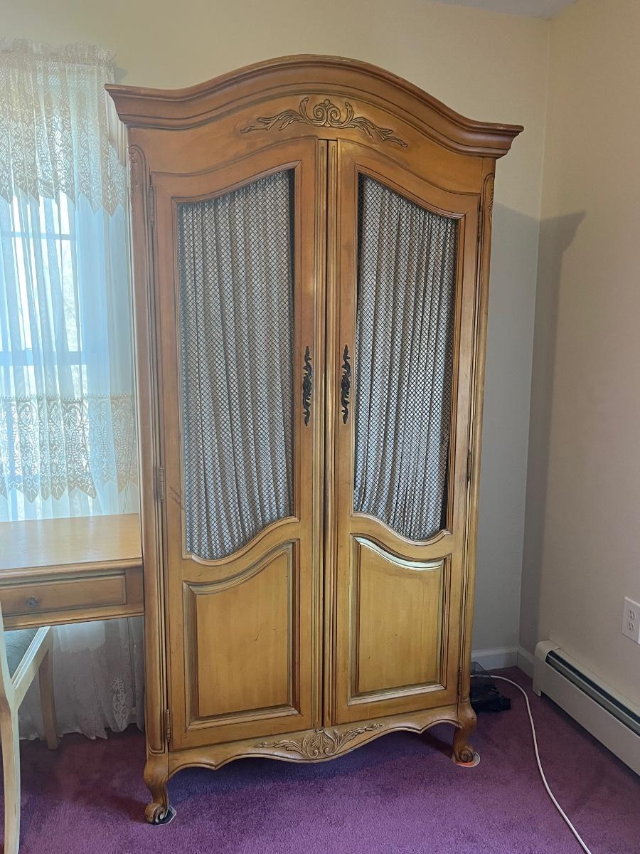 Armoir-42"x20"x78". Desk-21"x34". Please see all pictures as they are the best representation of the items. The pictures show condition, measurements if taken, and what is included in the lot. Due to the large amount that we photograph and the time frame, we are not always able to take measurements. All items unless noted, are pre-owned and have been used. If you purchased furniture, you must bring help. We do not allow one person to carry large furniture out on their own. Bring help, tools and a truck for the safety of our client’s homes, and your personal safety. Any damages that result to the property including walls, and floors due to moving of the furniture will be charged to the buyer. Company policy. Thank you.