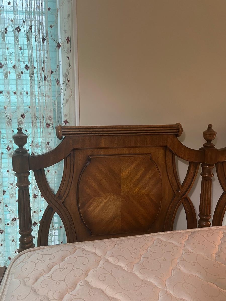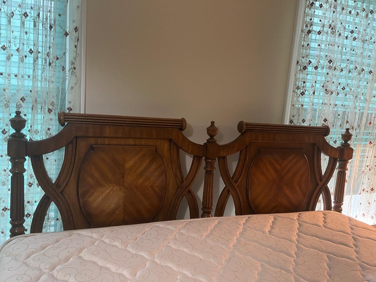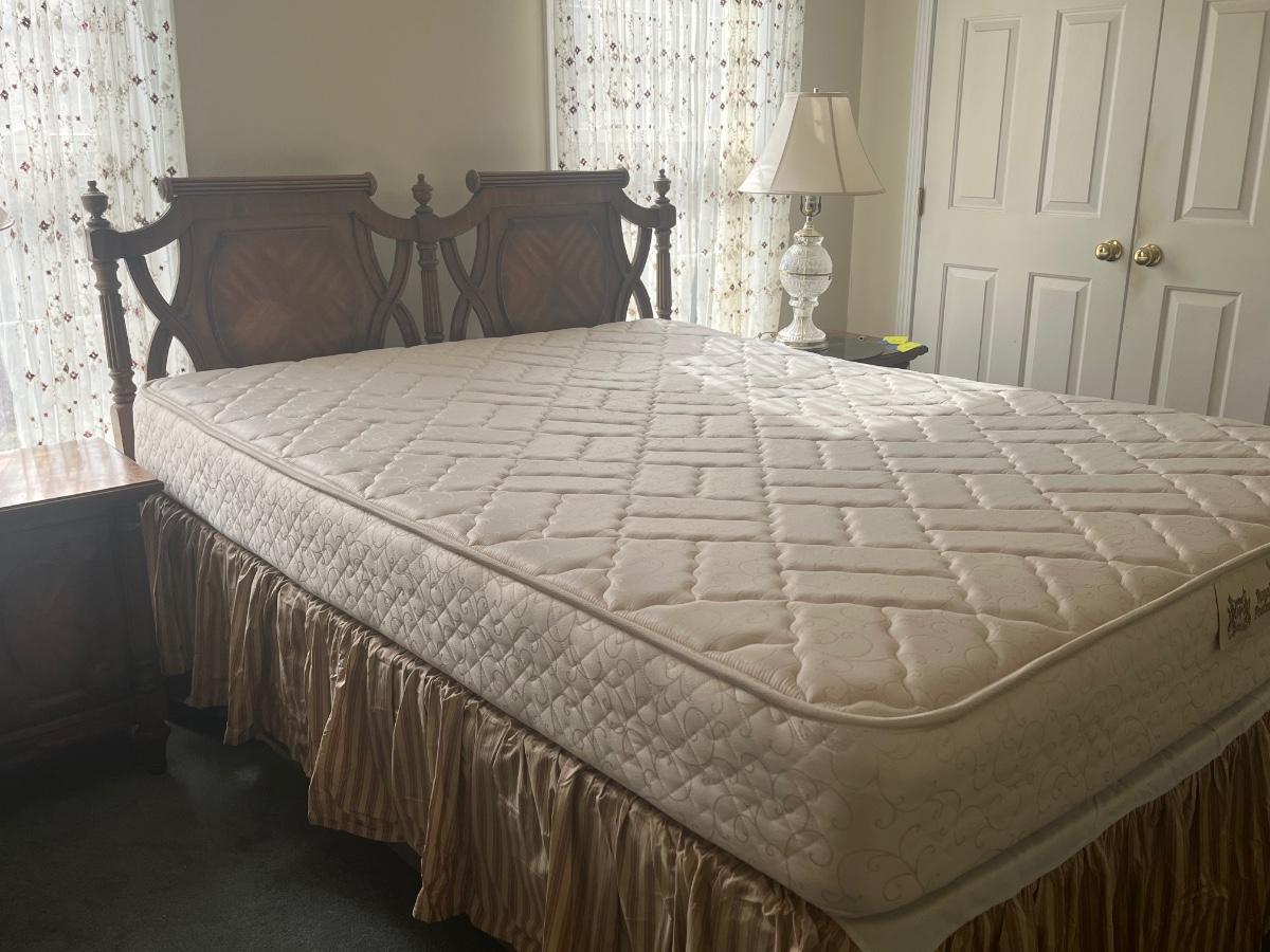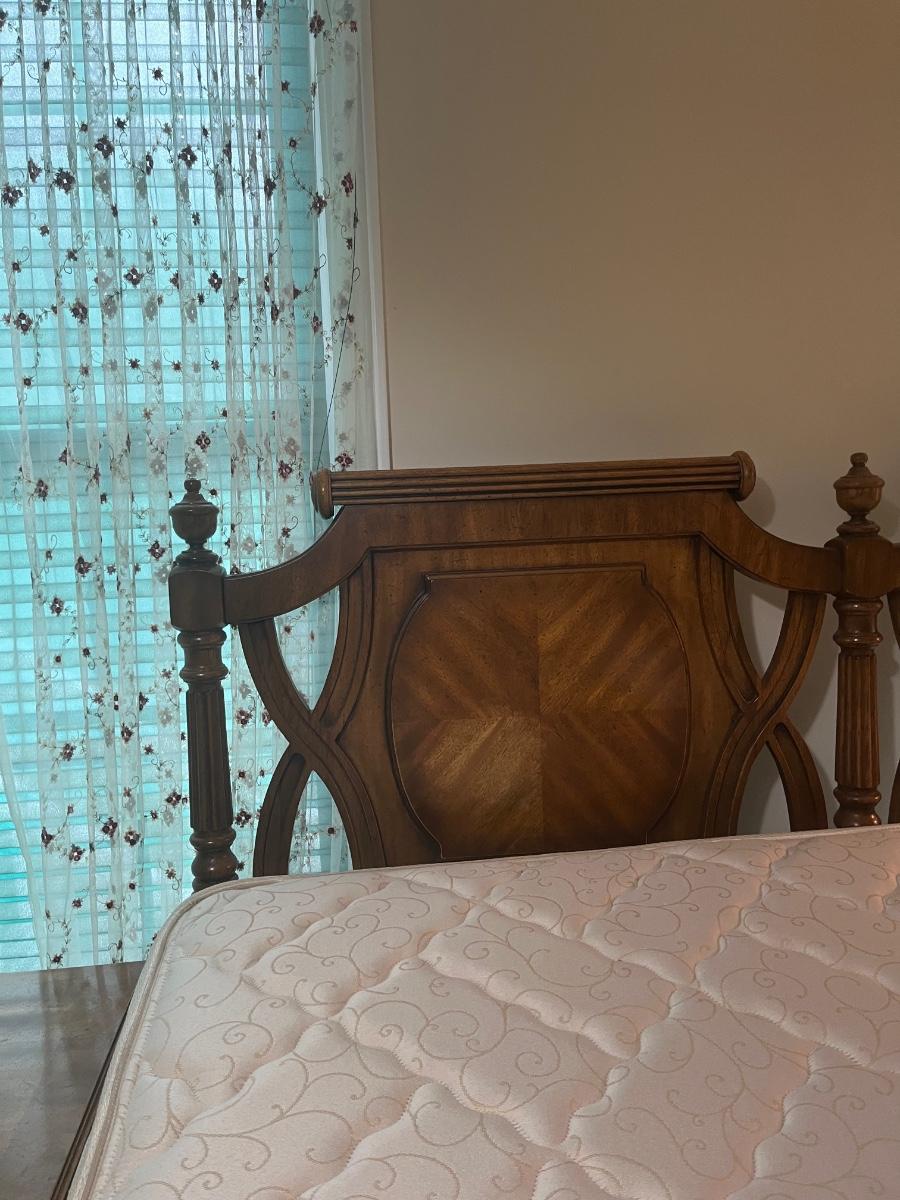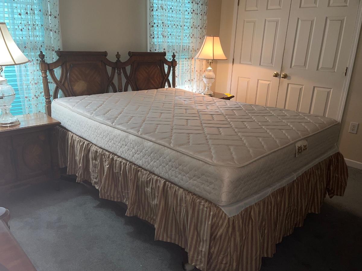 Vintage Headboard and mattress. Please see all pictures as they are the best representation of the items. The pictures show condition, measurements if taken, and what is included in the lot. Due to the large amount that we photograph and the time frame, we are not always able to take measurements. All items unless noted, are pre-owned and have been used. If you purchased furniture, you must bring help. We do not allow one person to carry large furniture out on their own. Bring help, tools and a truck for the safety of our client’s homes, and your personal safety. Any damages that result to the property including walls, and floors due to moving of the furniture will be charged to the buyer. Company policy. Thank you.