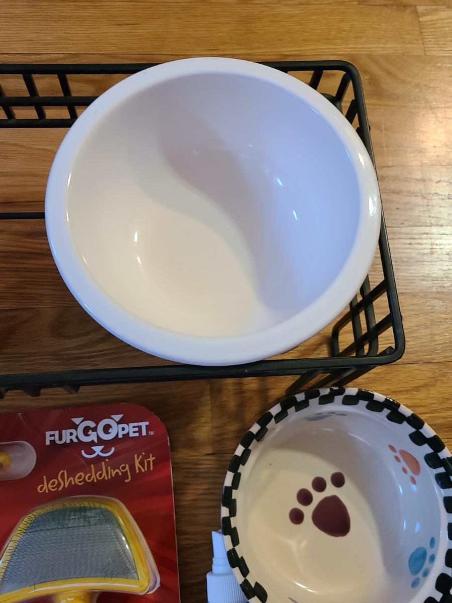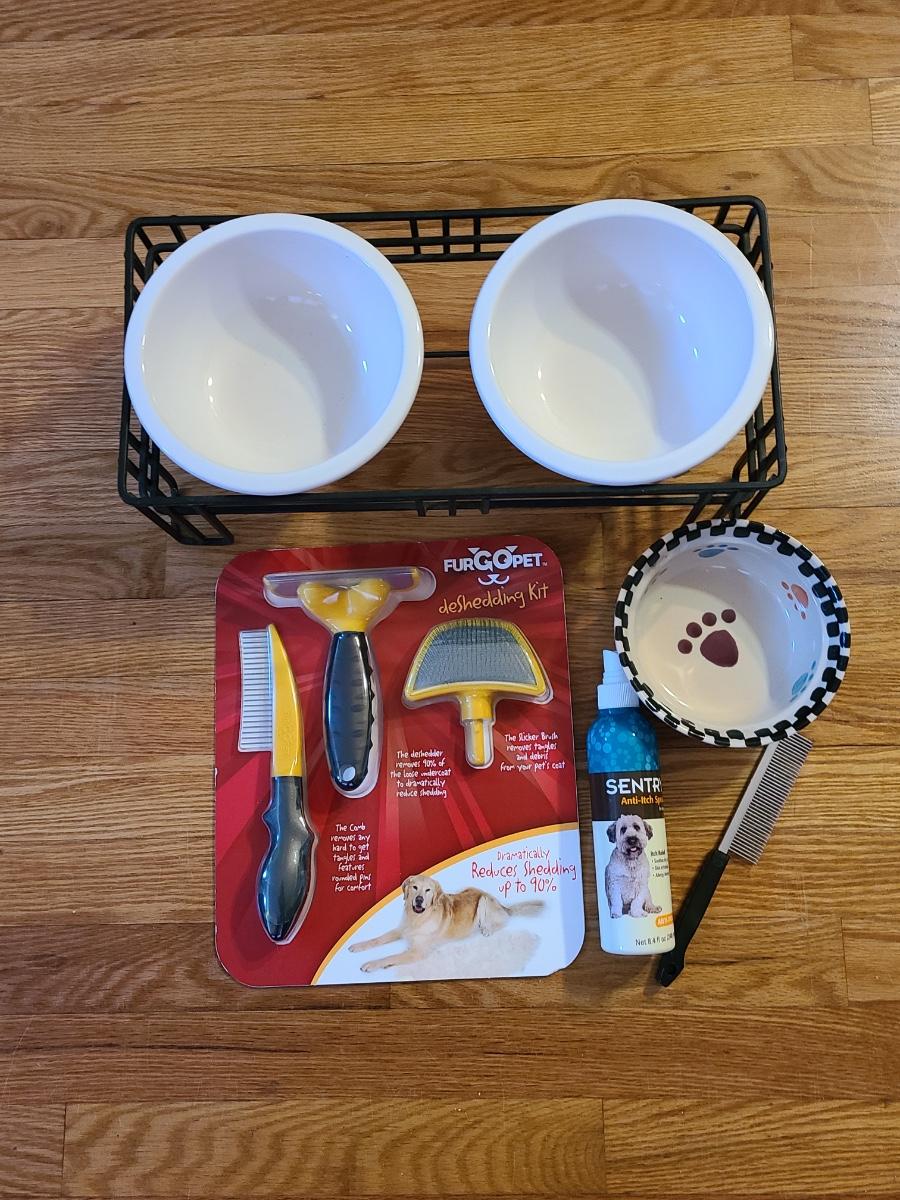 Lot 133: Dog Bowls On Stand, Brush/Detangling Kit, and More