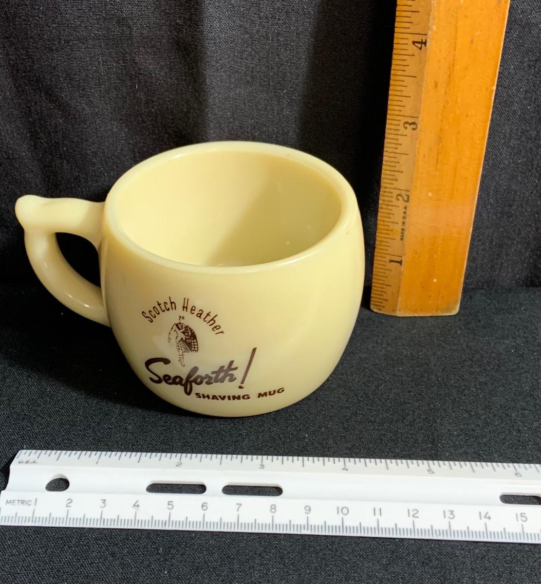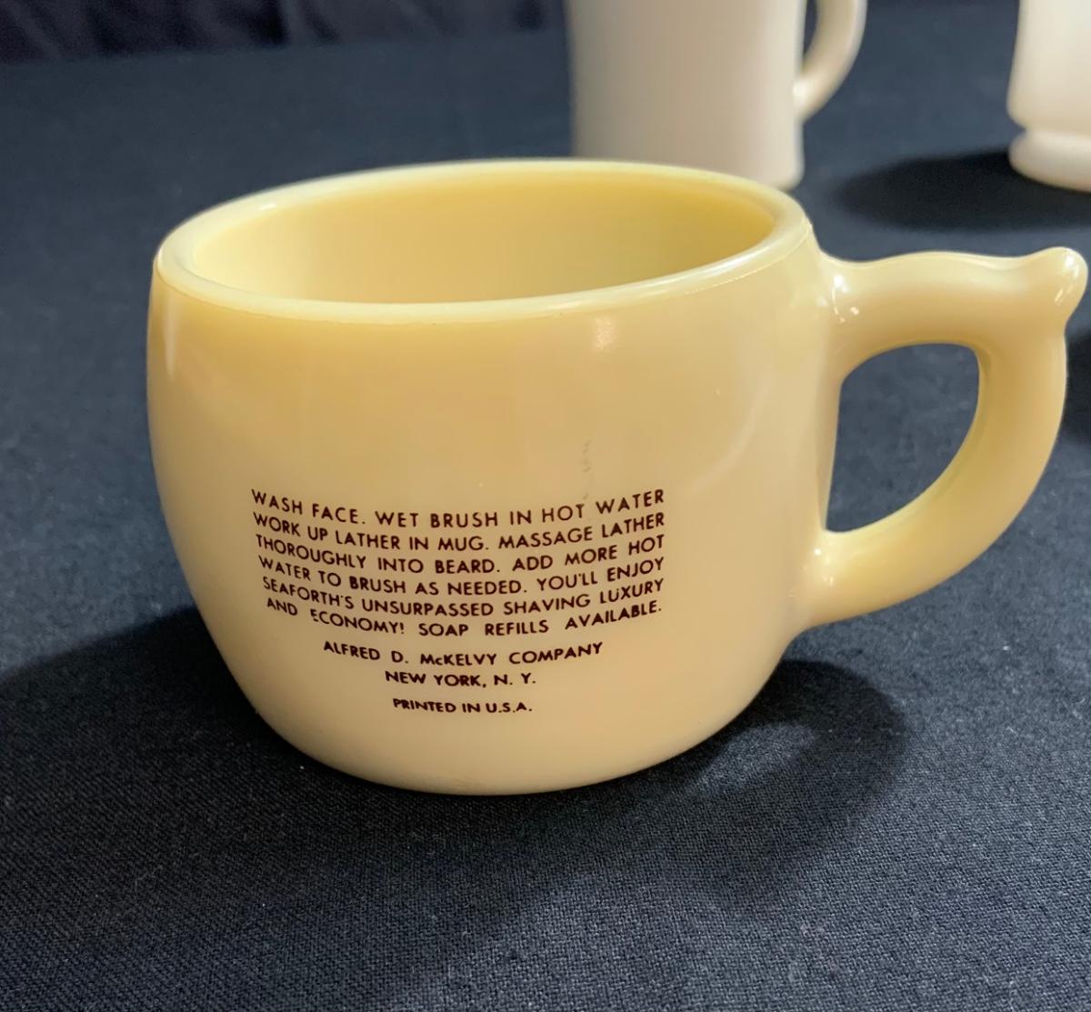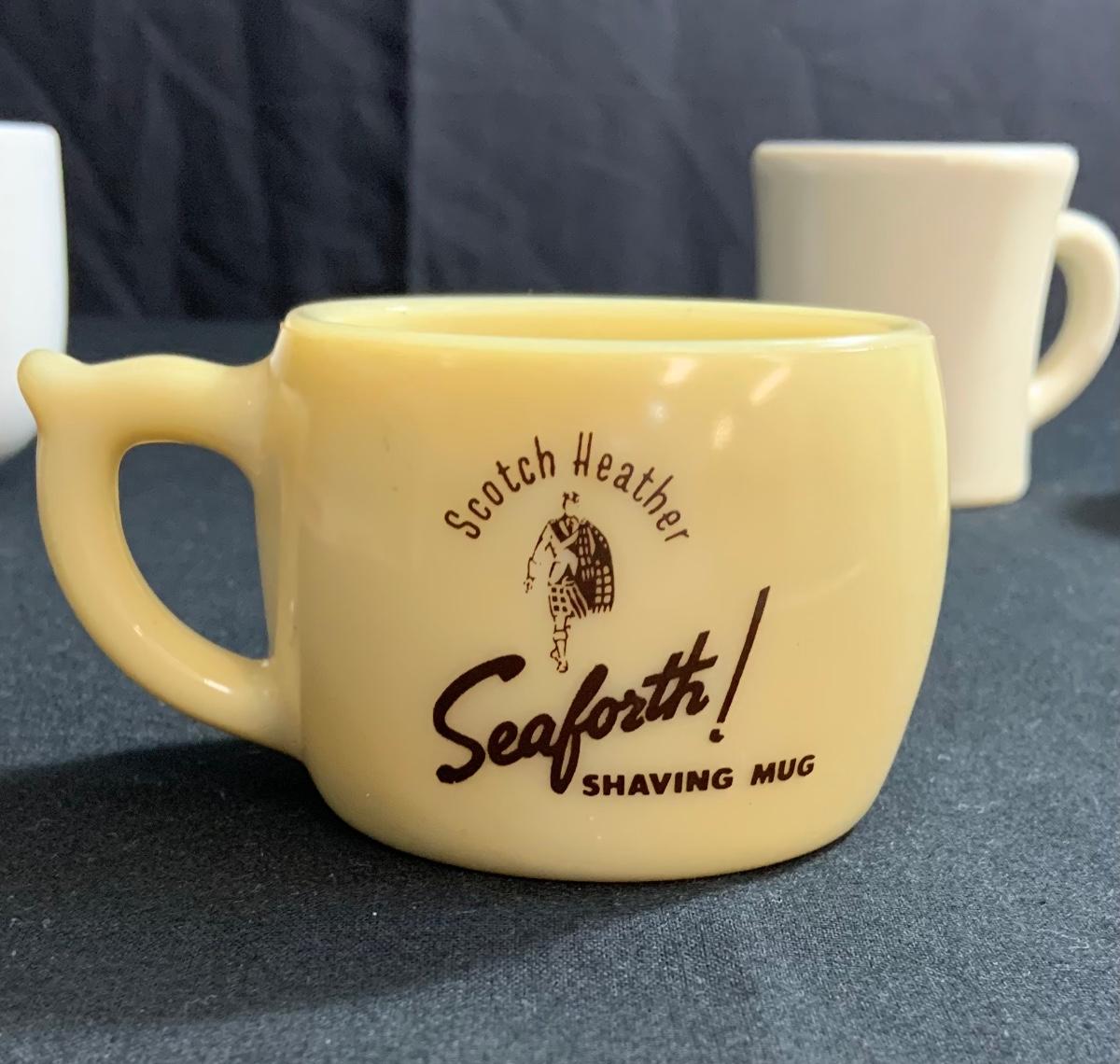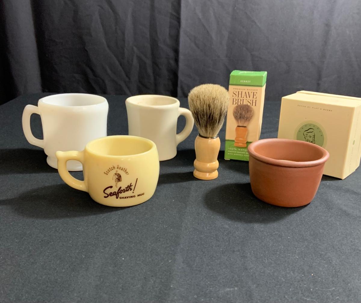 Shaving Lot- 3 Shaving Mugs, “Scotch Heather,” Milk Glass and Ceramic with shaving Soap;