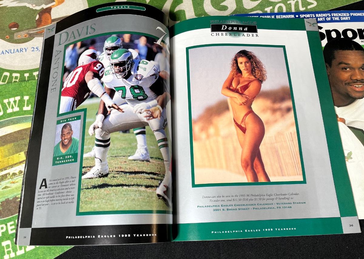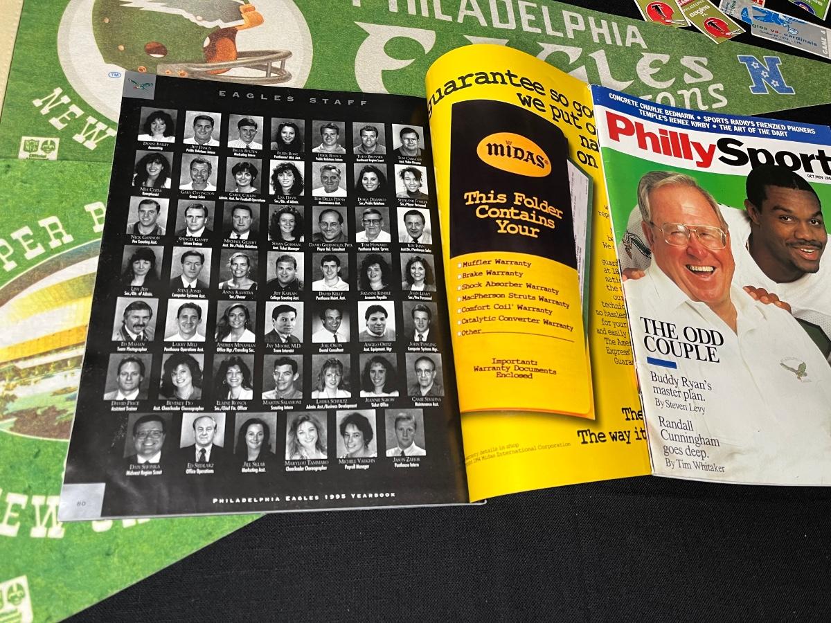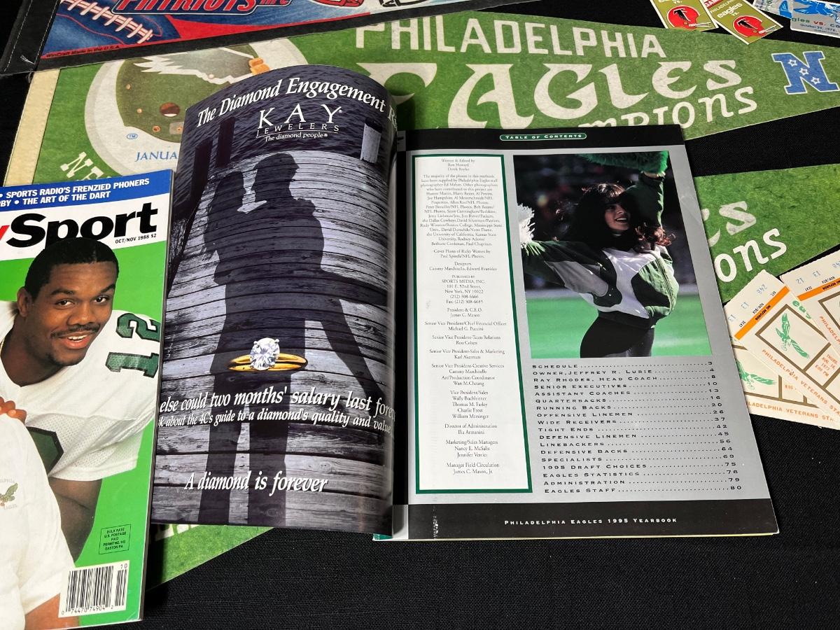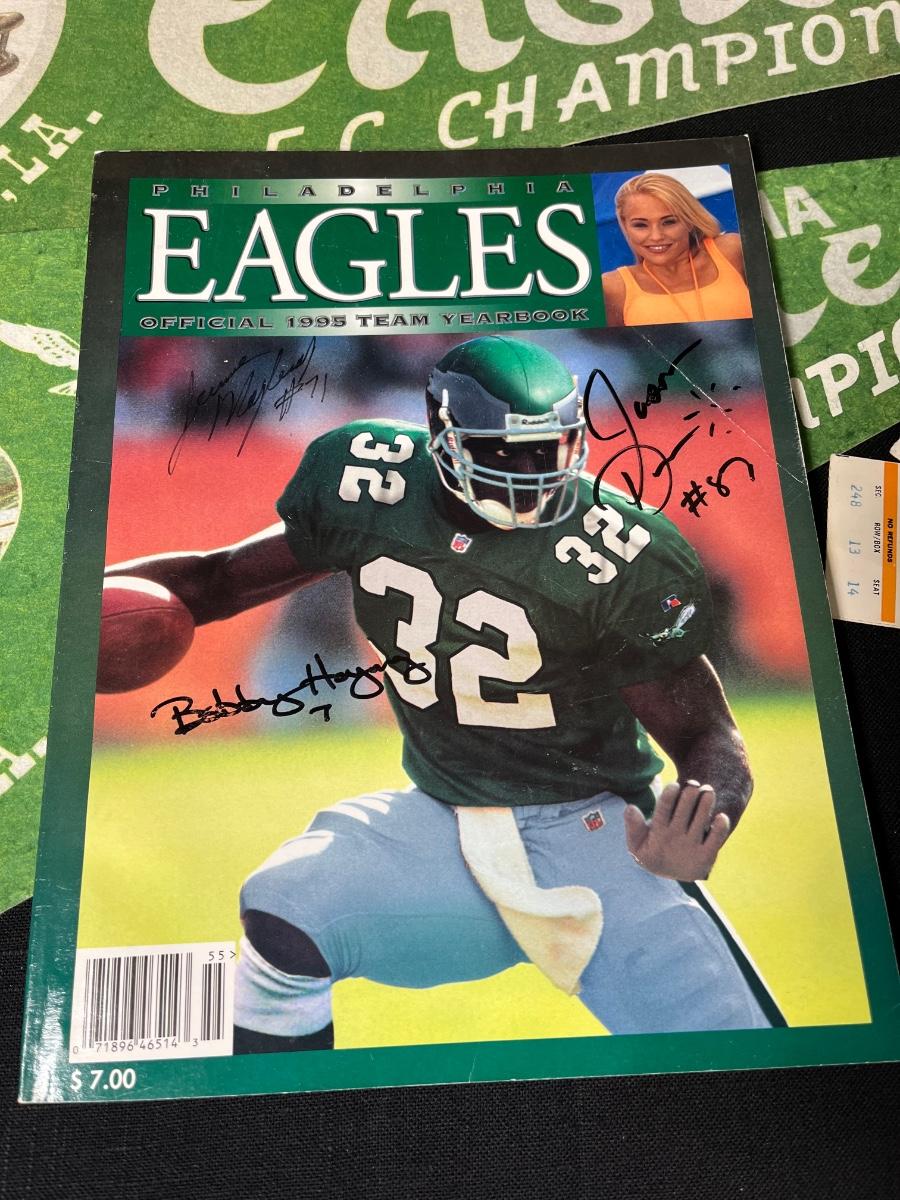 Philadelphia Eagles Memorabilia - Autographs & More. Includes 1995 Team Yearbook signed by Bobby Hoying, Jermaine Mayberry and Jason Dunn. Please see all pictures as they are the best representation of the items. The pictures show condition, measurements if taken, and what is included in the lot. Due to the large amount that we photograph and the time frame, we are not always able to take measurements. All items unless noted, are pre-owned and have been used. If you purchased furniture, you must bring help. We do not allow one person to carry large furniture out on their own. Bring help, tools and a truck for the safety of our client’s homes, and your personal safety. Any damages that result to the property including walls, and floors due to moving of the furniture will be charged to the buyer. Company policy. Thank you.