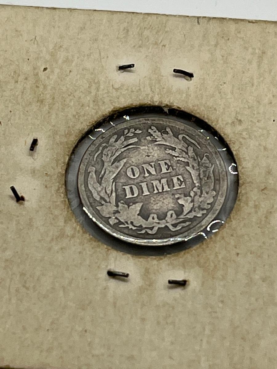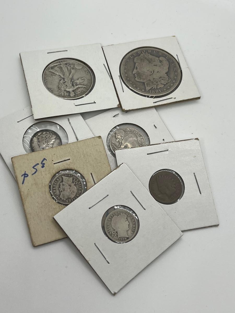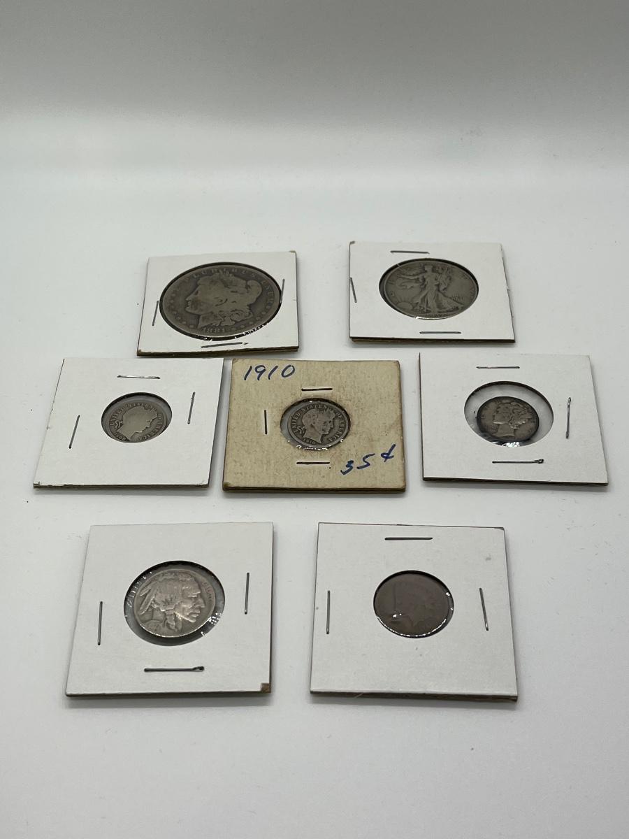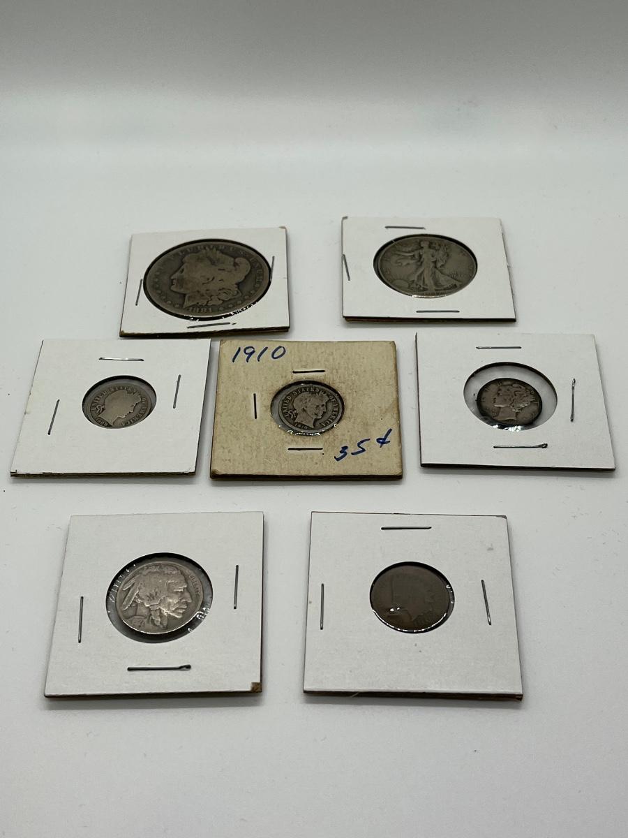 LOT 48: Lot of 7 1880s-1930s Coins - Morgan Dollar, Walking Liberty Half, Barber Dimes & More.