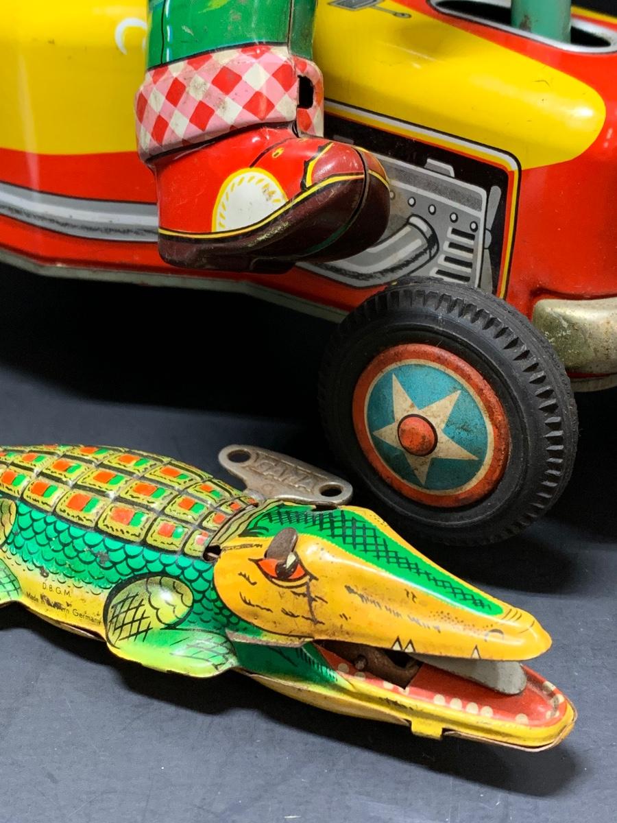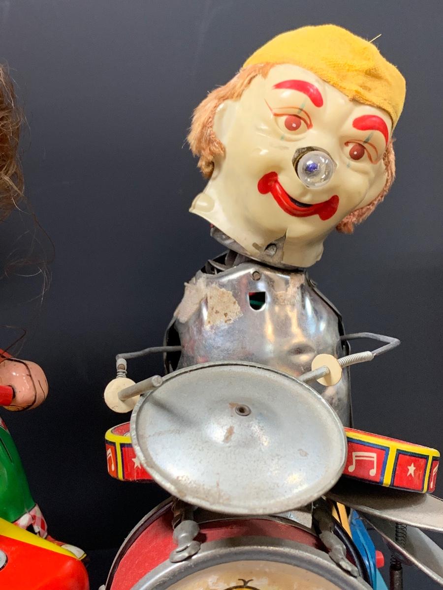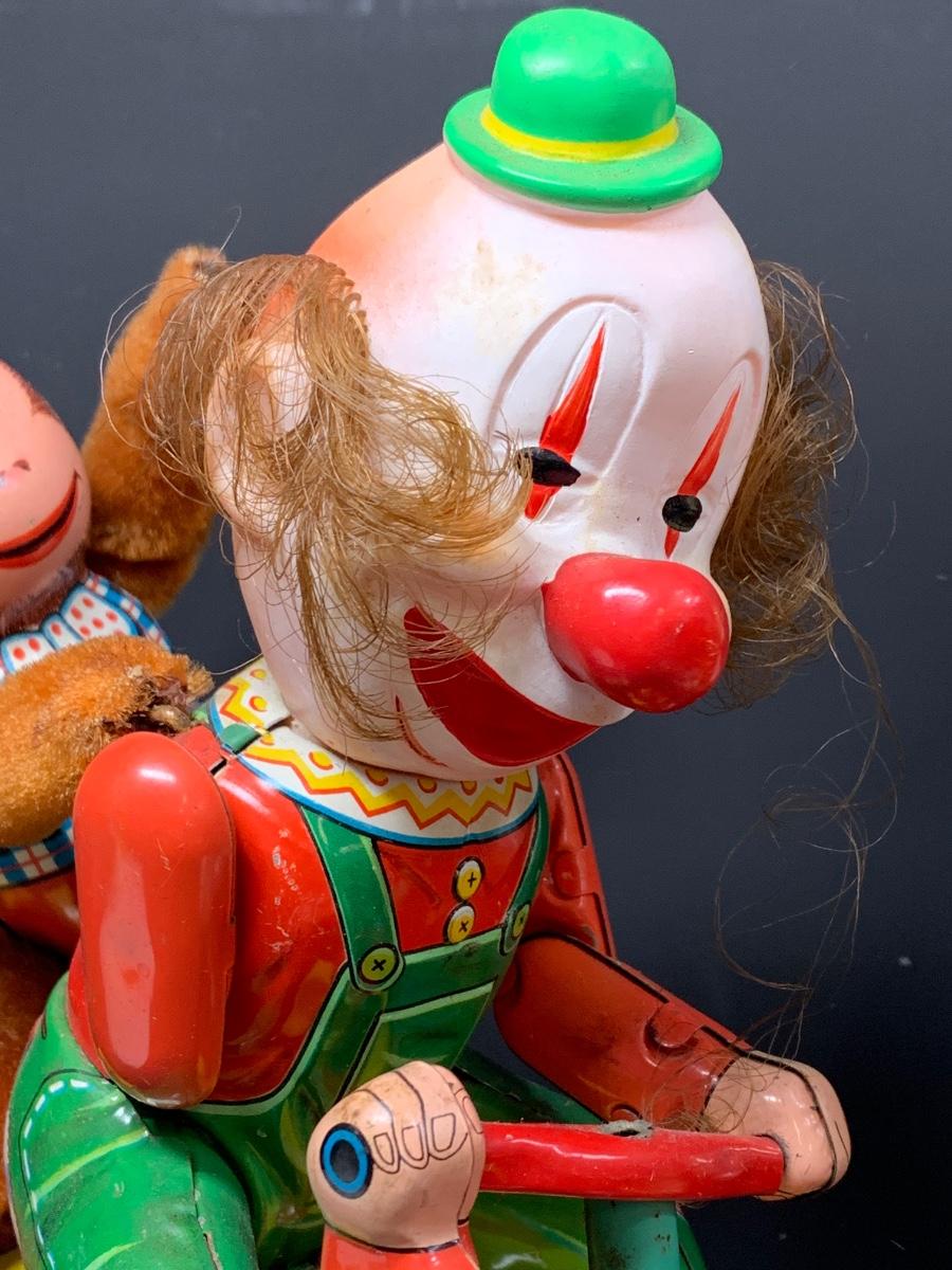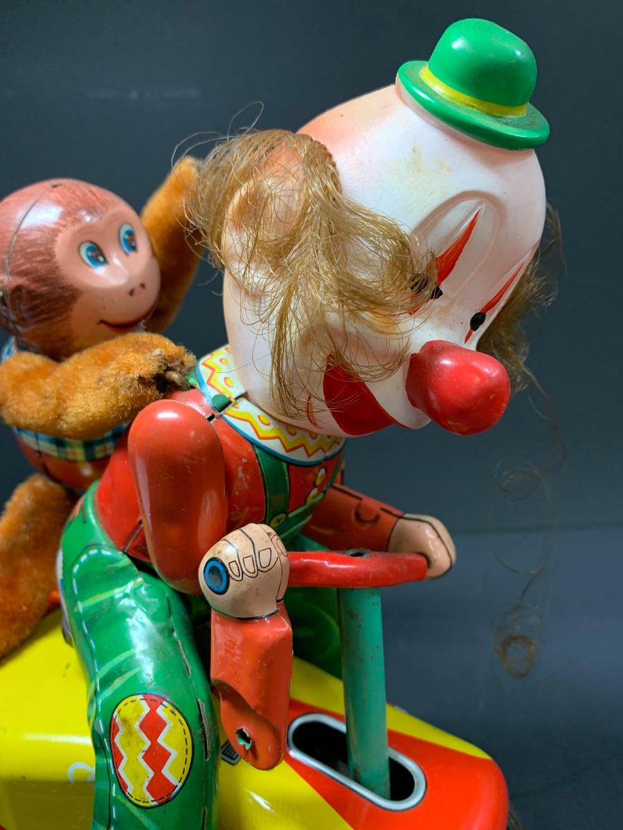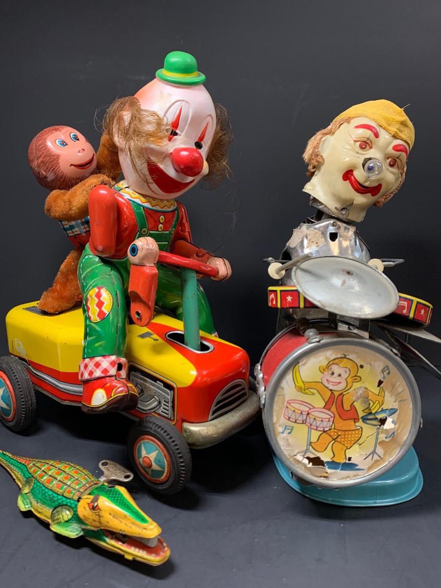 Collection of untested clown tin battery operated toys and a non working wind up alligator.