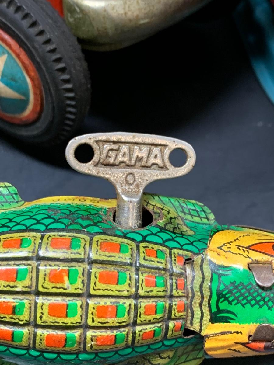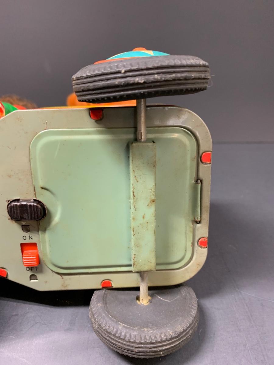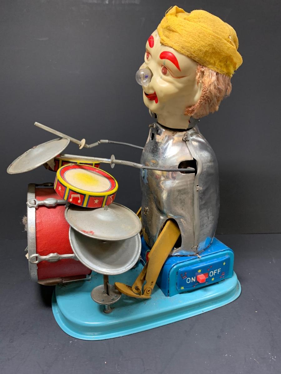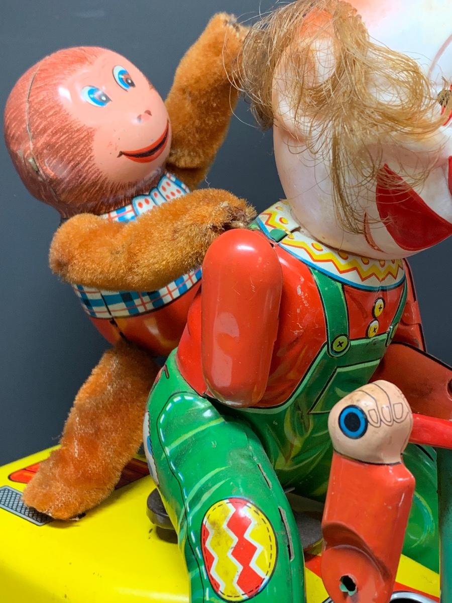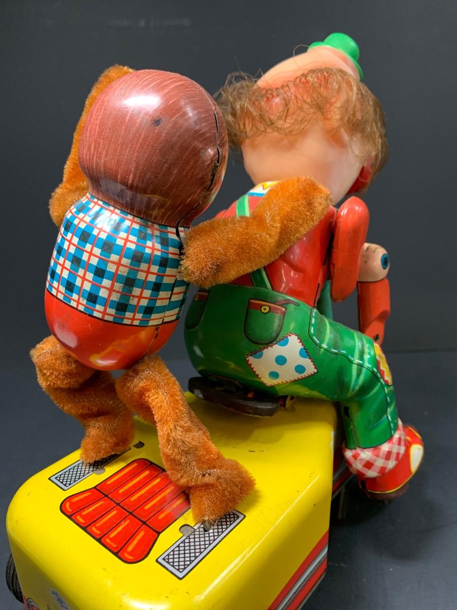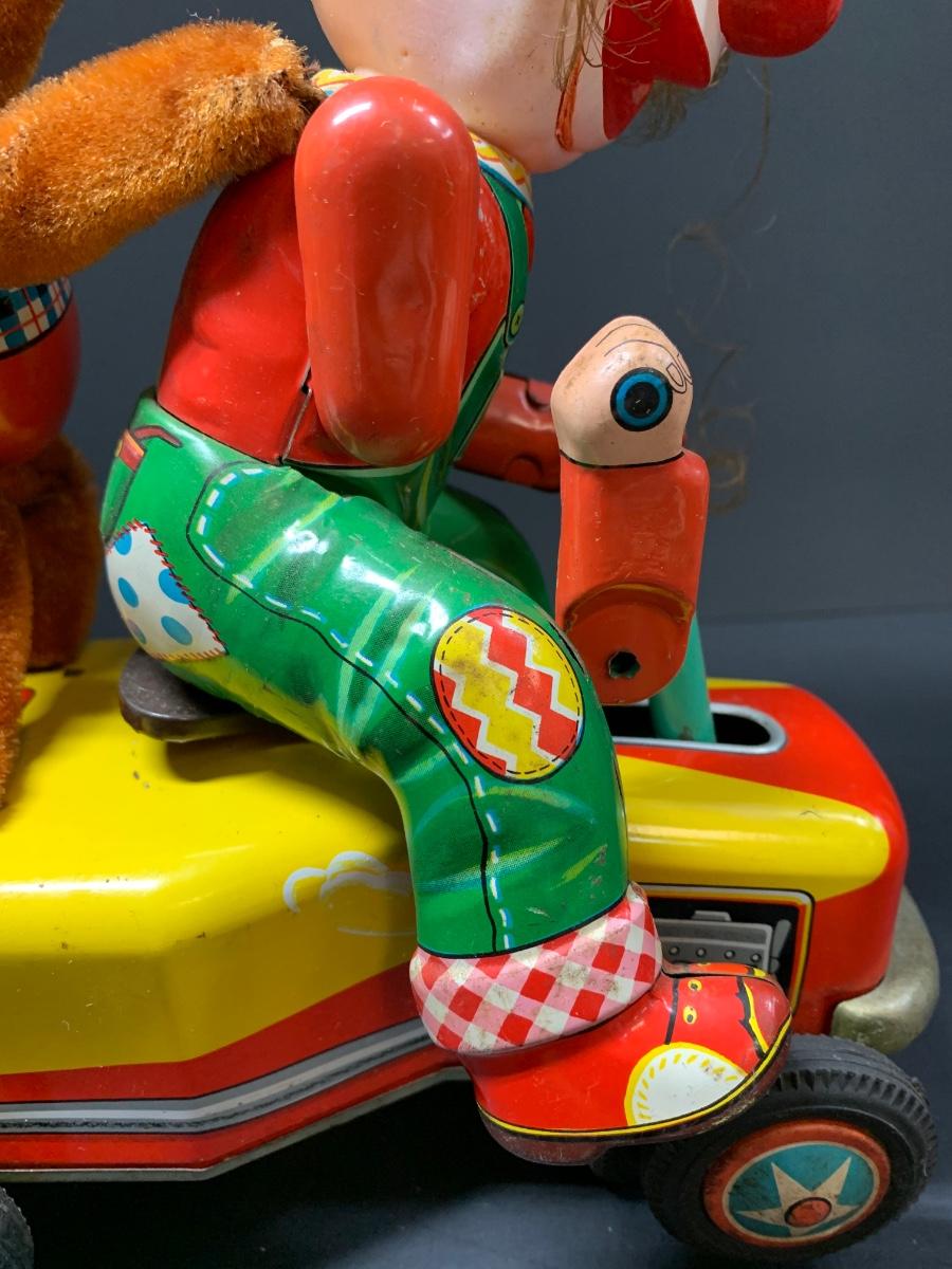 Collection of untested clown tin battery operated toys and a non working wind up alligator.