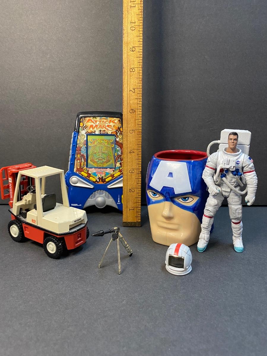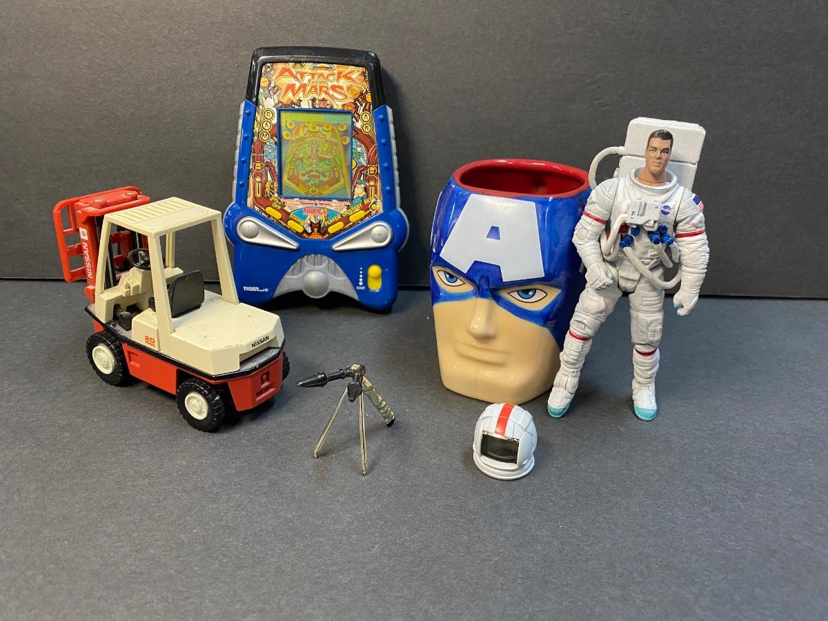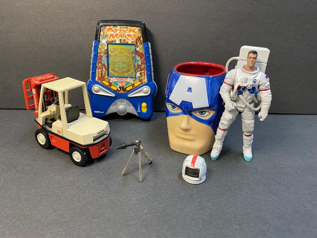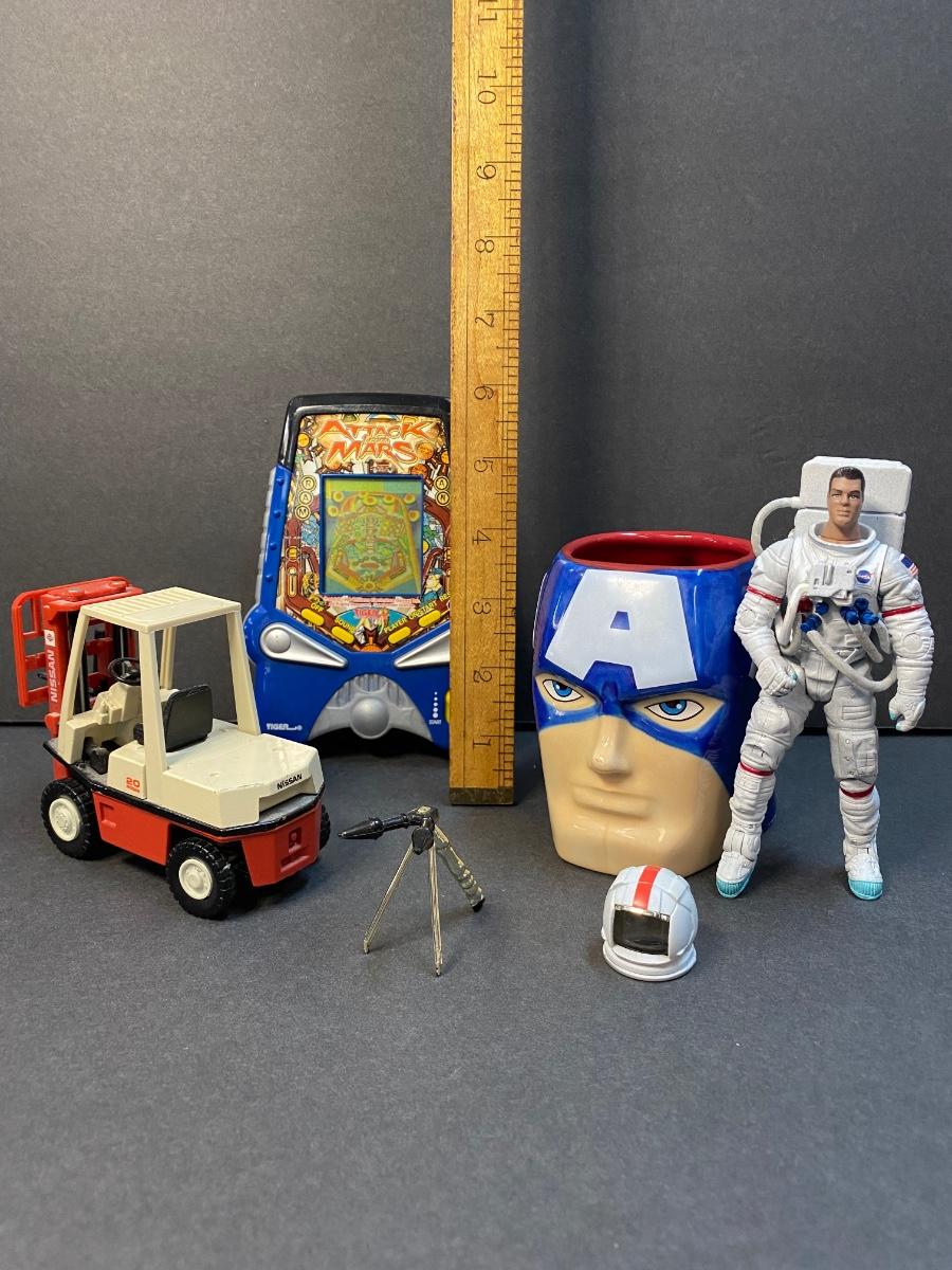 NASA and Nissan toys, Mara attacks Video game and Captain America mug. Please see all pictures as they are the best representation of the items. The pictures show condition, measurements if taken, and what is included in the lot. Due to the large amount that we photograph and the time frame, we are not always able to take measurements. All items unless noted, are pre-owned and have been used. If you purchased furniture, you must bring help. We do not allow one person to carry large furniture out on their own. Bring help, tools and a truck for the safety of our client’s homes, and your personal safety. Any damages that result to the property including walls, and floors due to moving of the furniture will be charged to the buyer. Company policy. Thank you.