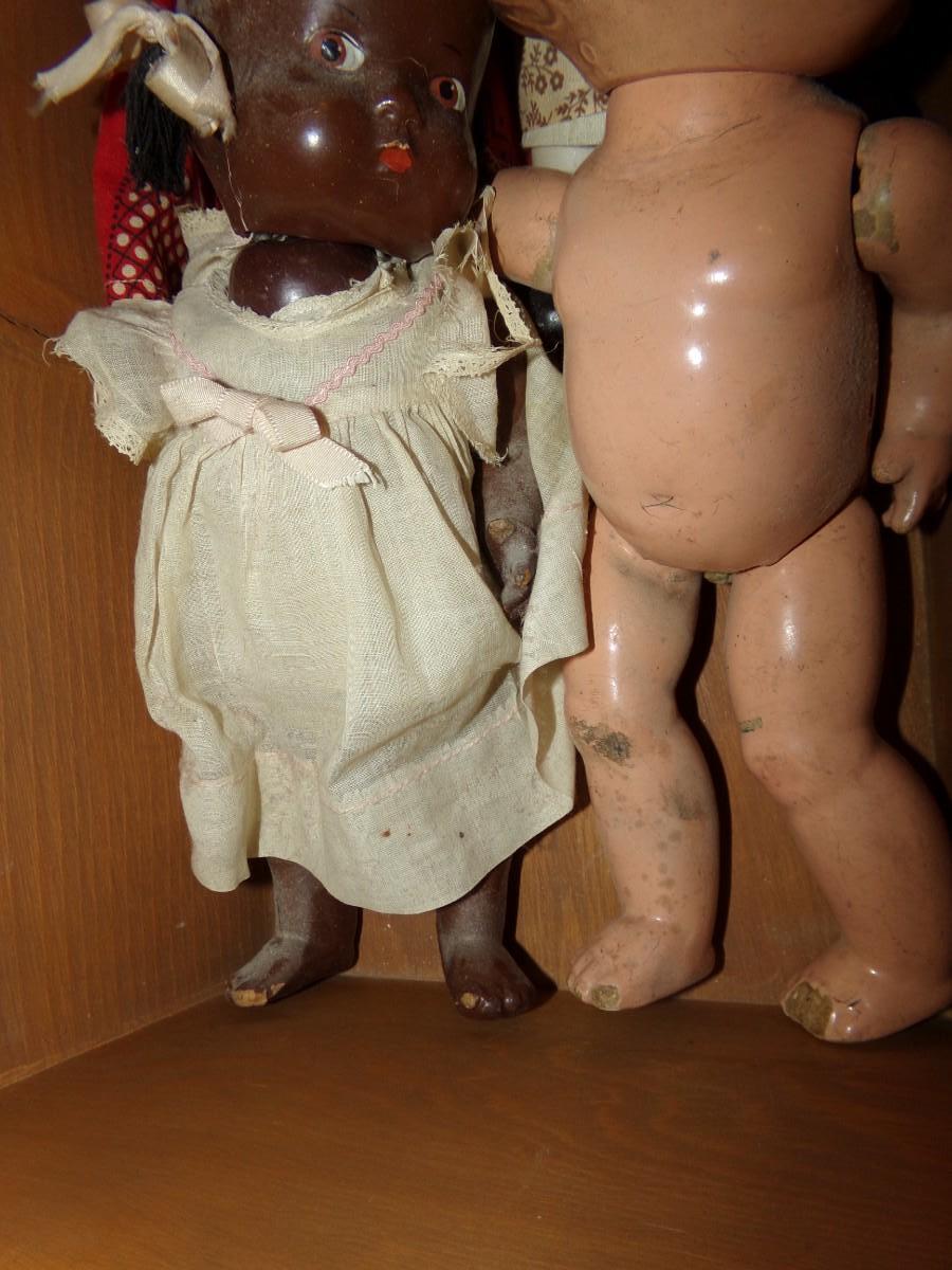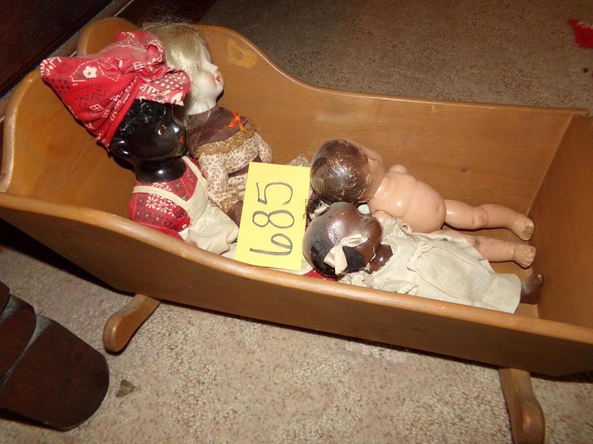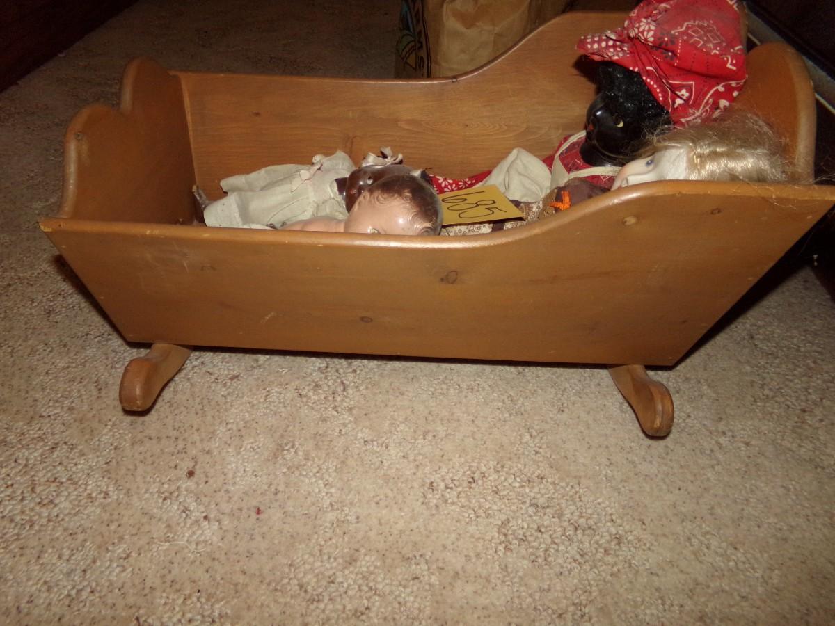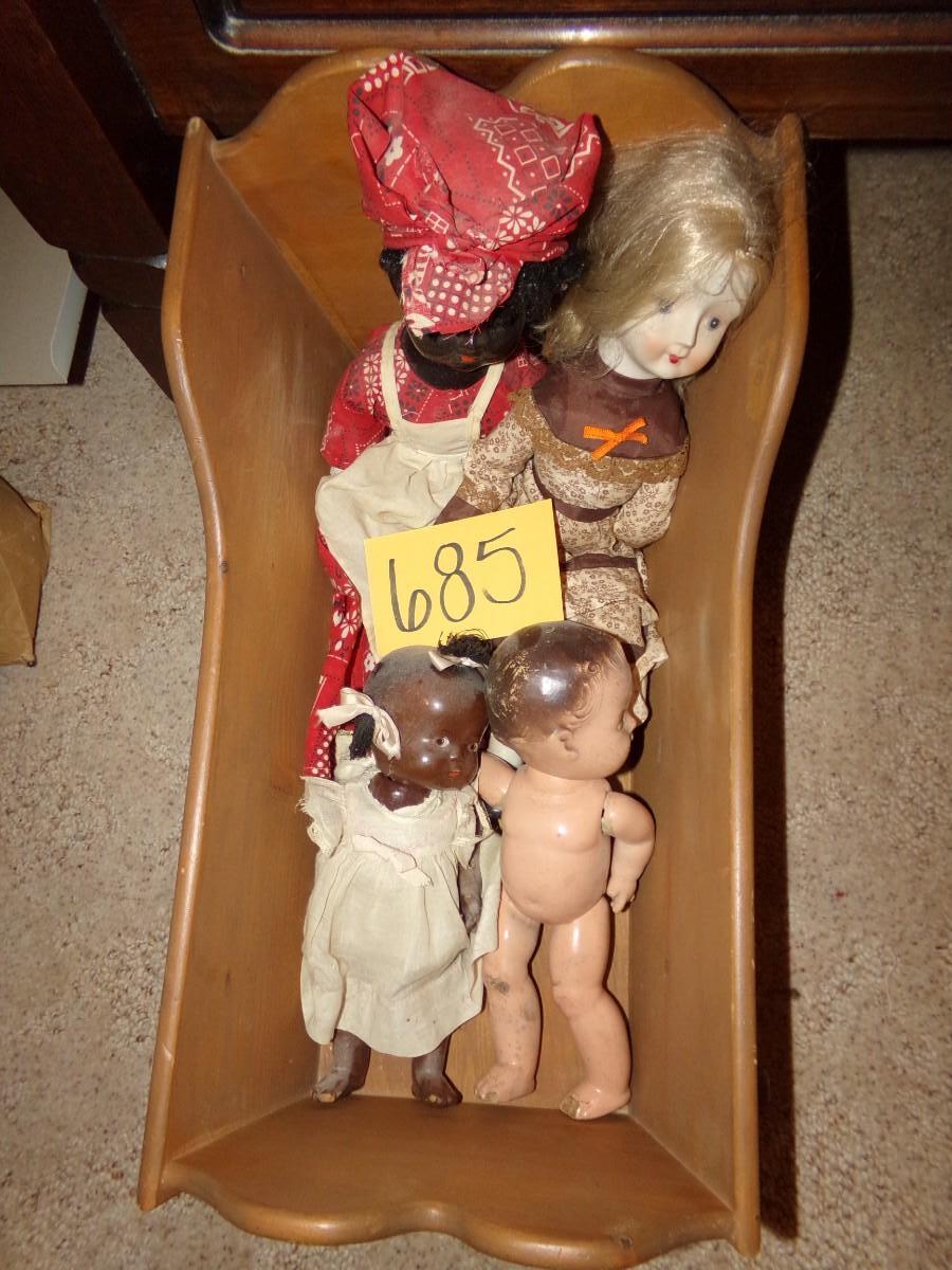 LOT 685 VINTAGE DOLLS & WOODEN CRADLE