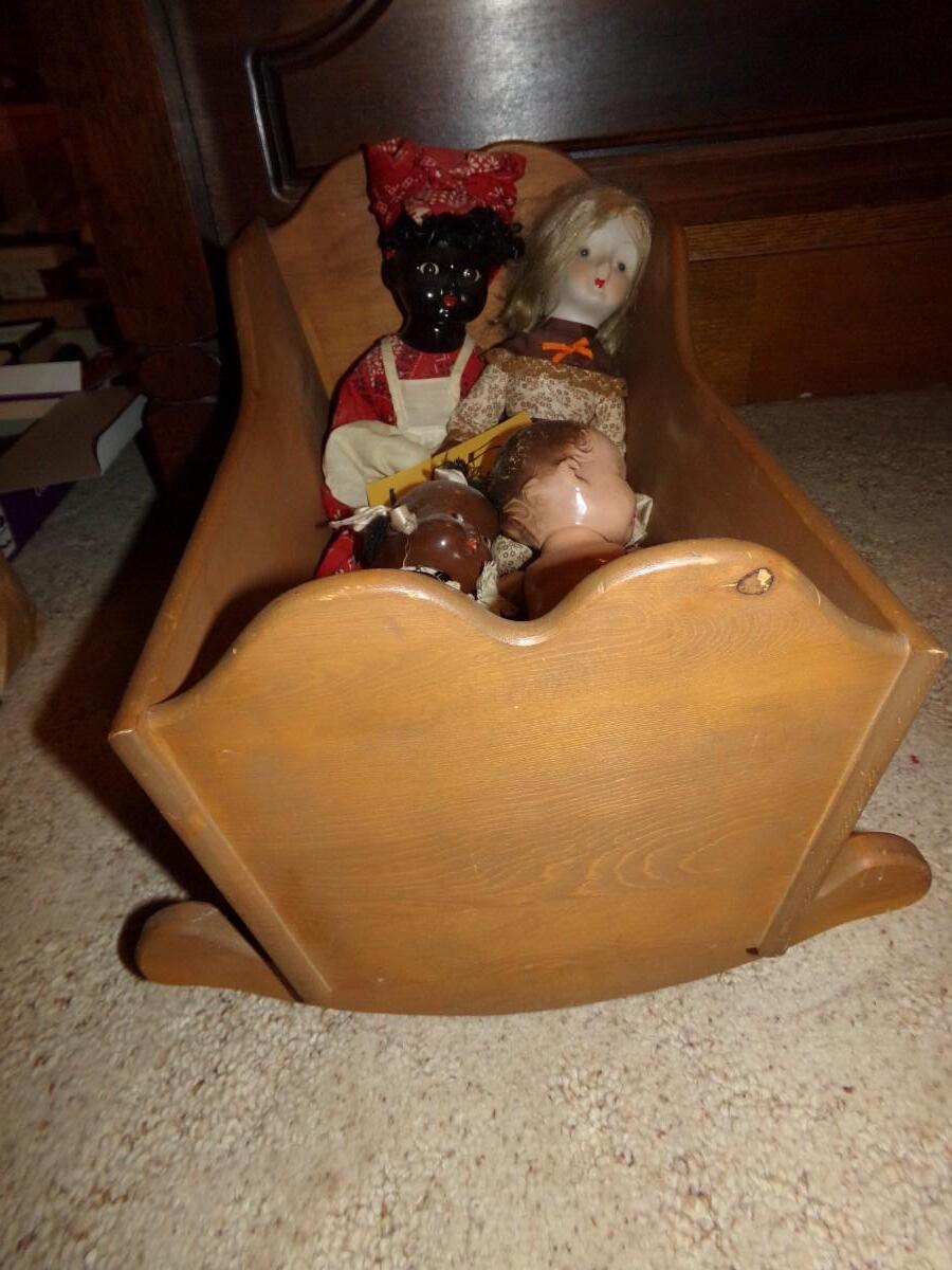 VINTAGE WOODEN DOLL CRADLE WITH VINTAGE DOLLS. PERFECT FOR THE DOLL COLLECTOR.
