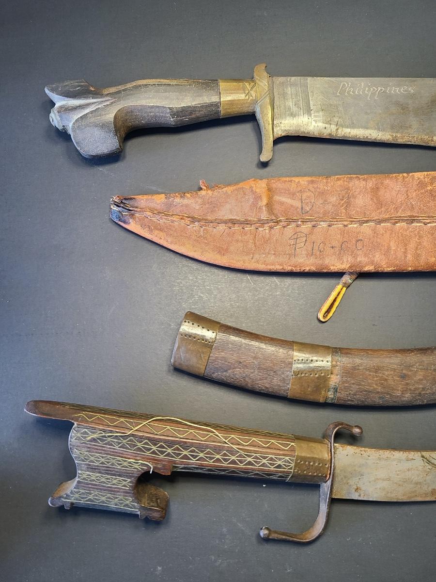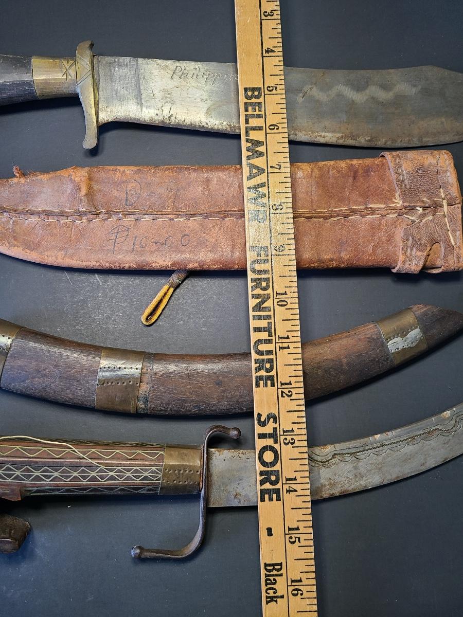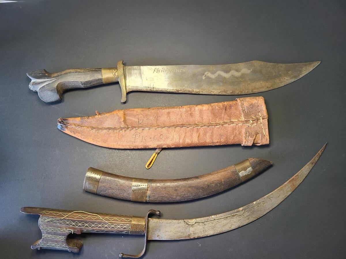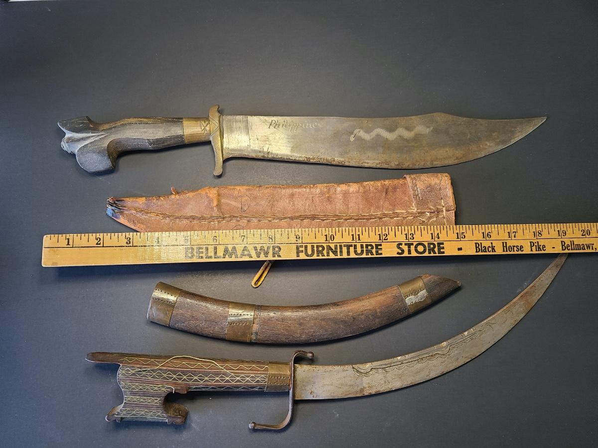 This lot is for two vintage knives as is. Both blades have some rusting. The first blade is marked Philippines and has a wood handle with brass piece as well. The other is a thinner curved blade with wood carved handle, and wood sheath with brass/bronze metal pieces. The knife has cut through the end of the wood sheath as seen in pictures. Please see all pictures as they are the best representation of the items. The pictures show condition, measurements if taken, and what is included in the lot. Due to the large amount that we photograph and the time frame, we are not always able to take measurements. All items unless noted, are pre-owned and have been used. If you purchased furniture, you must bring help. We do not allow one person to carry large furniture out on their own. Bring help, tools and a truck for the safety of our client’s homes, and your personal safety. Any damages that result to the property including walls, and floors due to moving of the furniture will be charged to the buyer. Company policy. Thank you.