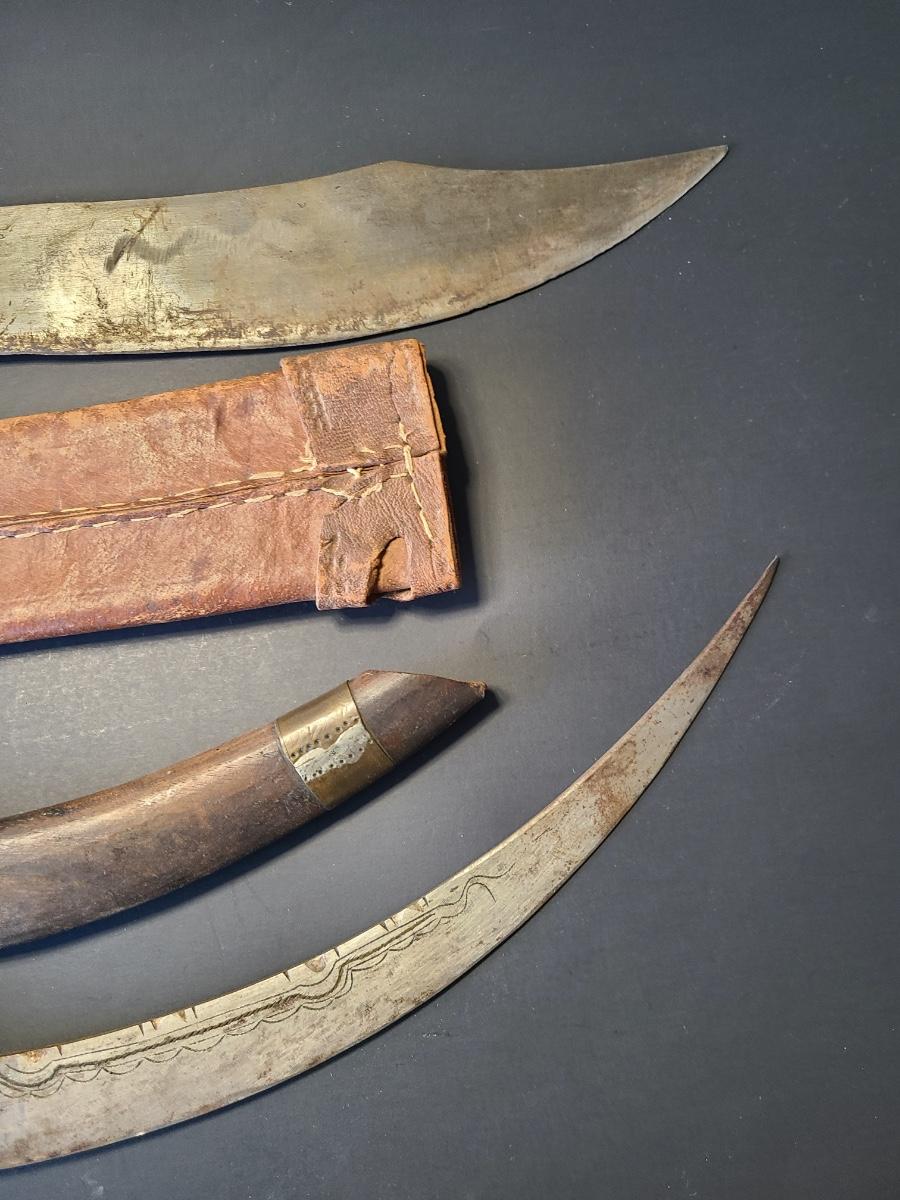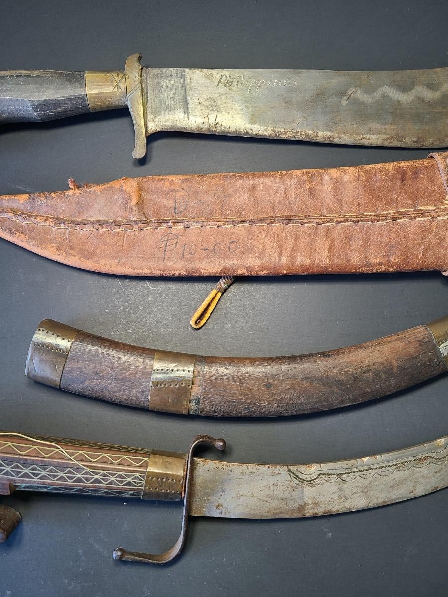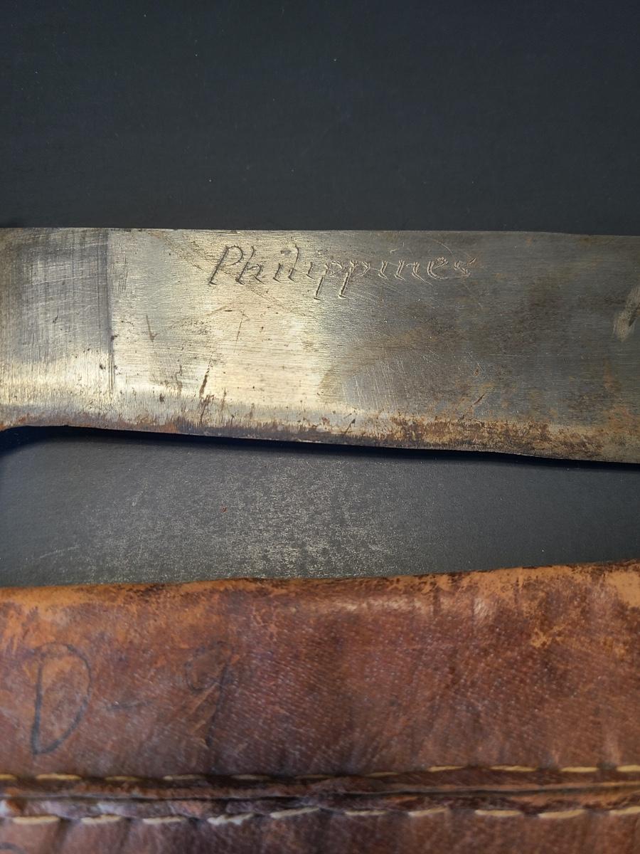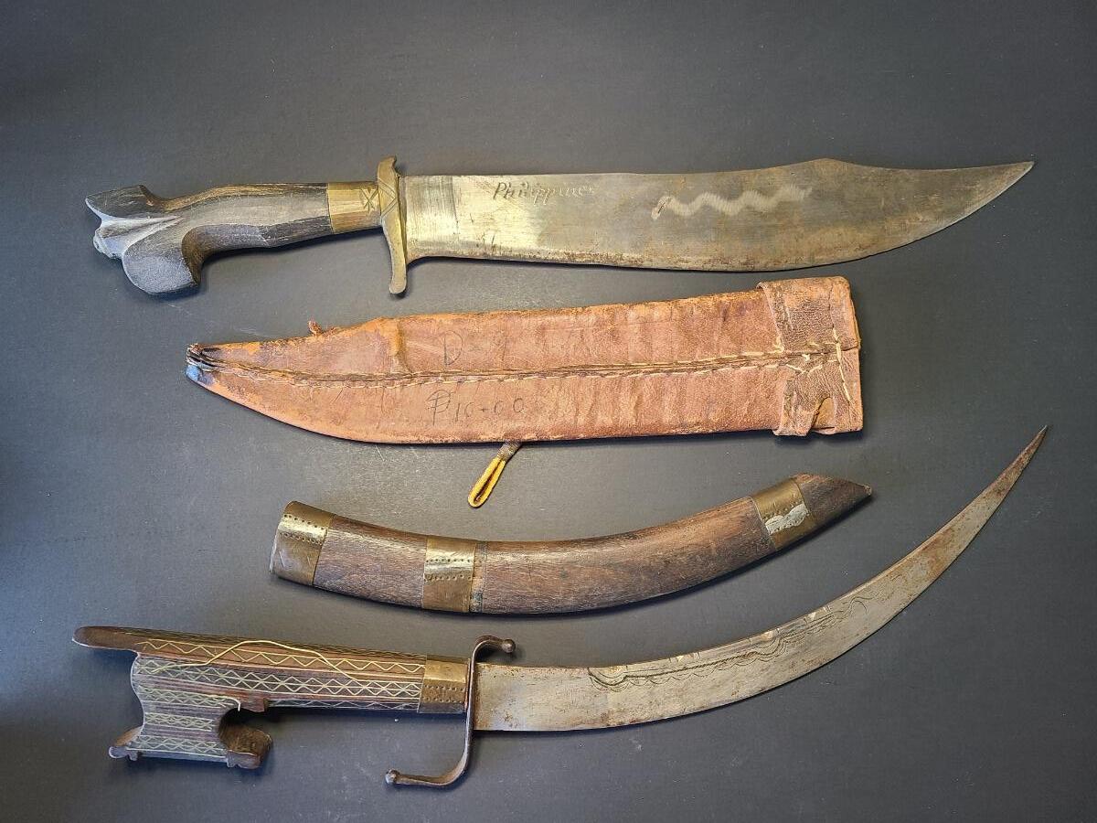 This lot is for two vintage knives as is. Both blades have some rusting. The first blade is marked Philippines and has a wood handle with brass piece as well. The other is a thinner curved blade with wood carved handle, and wood sheath with brass/bronze metal pieces. The knife has cut through the end of the wood sheath as seen in pictures. Please see all pictures as they are the best representation of the items. The pictures show condition, measurements if taken, and what is included in the lot. Due to the large amount that we photograph and the time frame, we are not always able to take measurements. All items unless noted, are pre-owned and have been used. If you purchased furniture, you must bring help. We do not allow one person to carry large furniture out on their own. Bring help, tools and a truck for the safety of our client’s homes, and your personal safety. Any damages that result to the property including walls, and floors due to moving of the furniture will be charged to the buyer. Company policy. Thank you.
