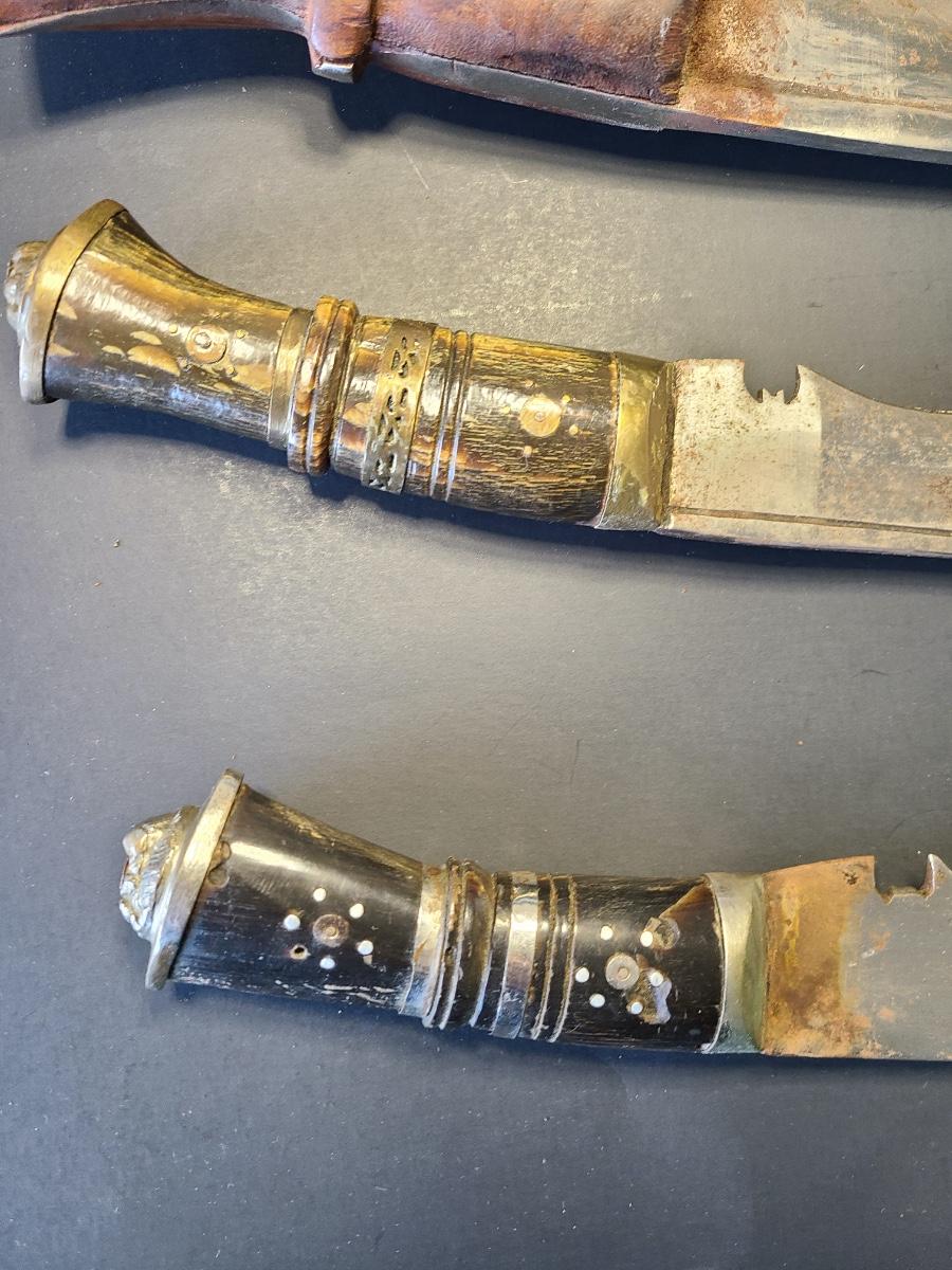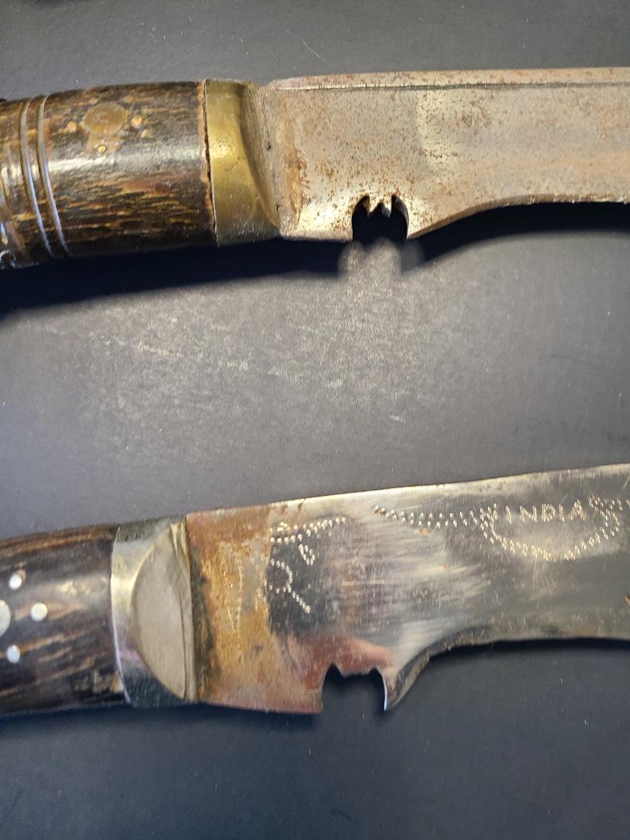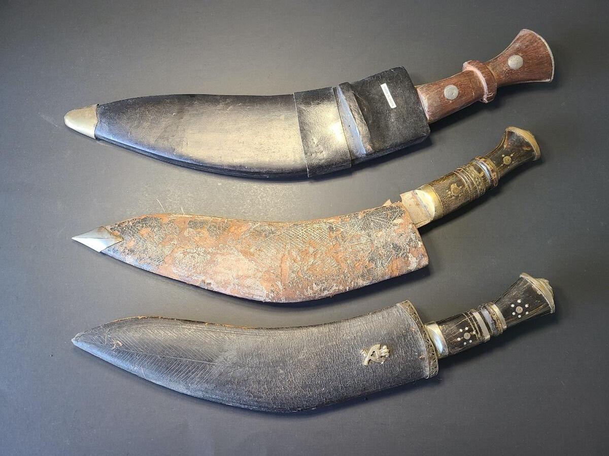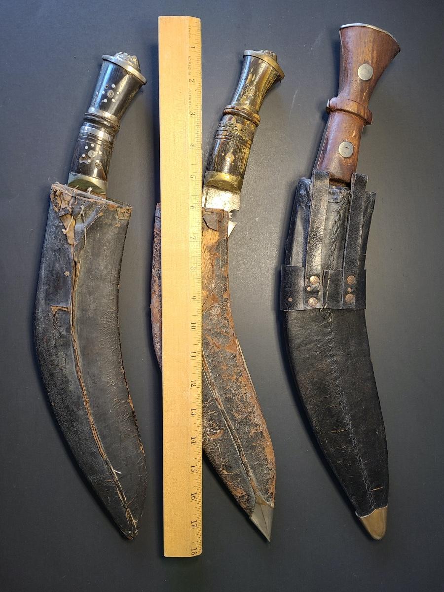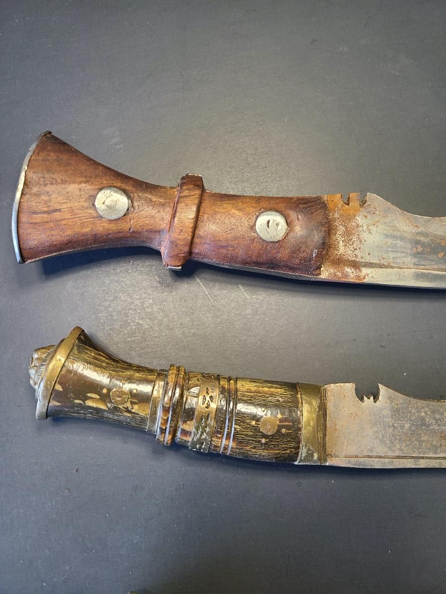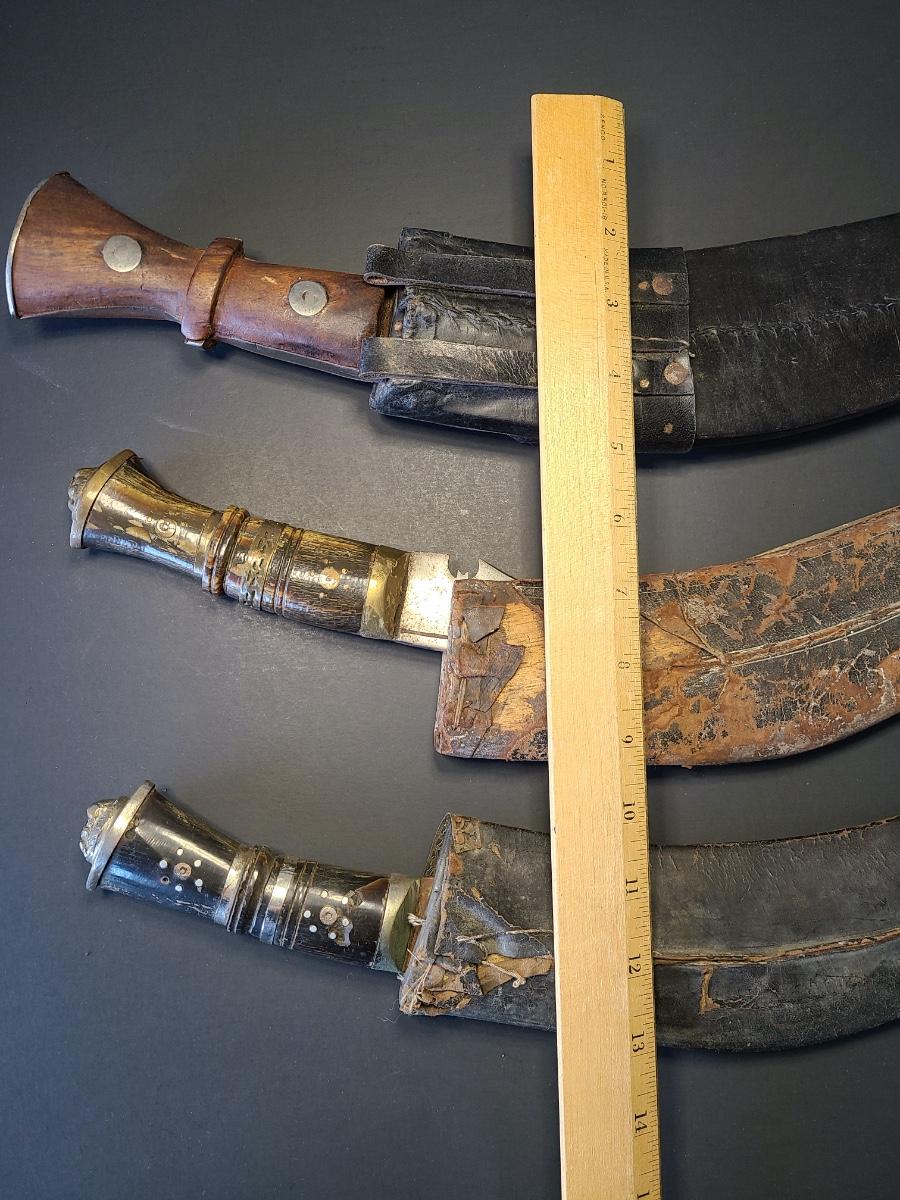 Vintage Kukri knives from the Indian subcontinent, traditionally uses as a machete multipurpose tool as a weapon or as a cutting tool in South Asia. One is marked India. Please see all pictures as they are the best representation of the items. The pictures show condition, measurements if taken, and what is included in the lot. Due to the large amount that we photograph and the time frame, we are not always able to take measurements. All items unless noted, are pre-owned and have been used. If you purchased furniture, you must bring help. We do not allow one person to carry large furniture out on their own. Bring help, tools and a truck for the safety of our client’s homes, and your personal safety. Any damages that result to the property including walls, and floors due to moving of the furniture will be charged to the buyer. Company policy. Thank you.