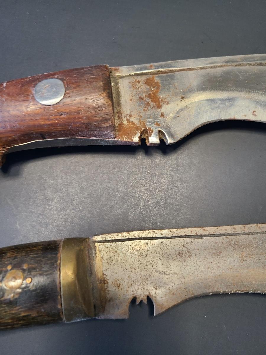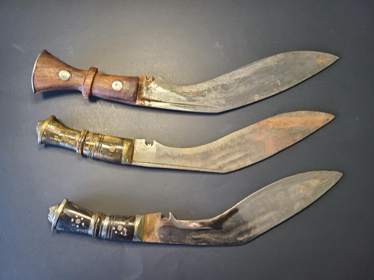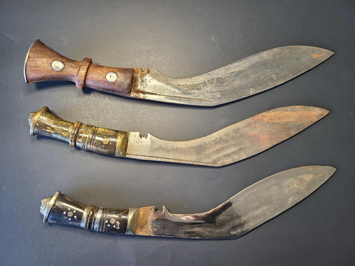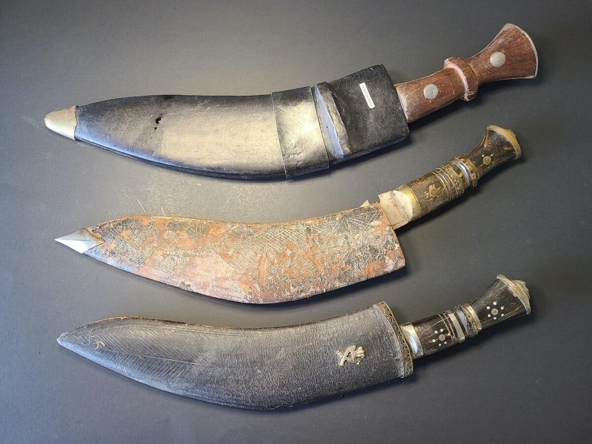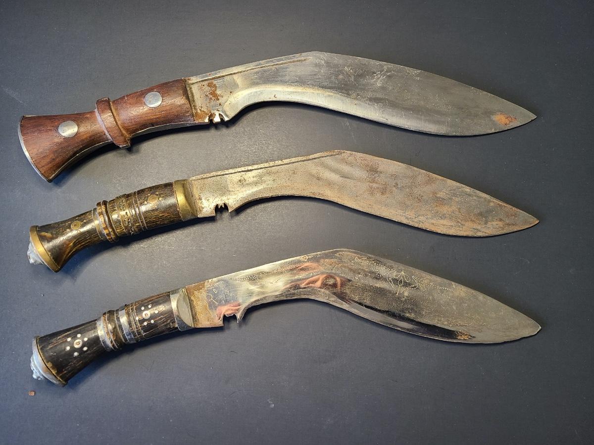 Vintage Kukri knives from the Indian subcontinent, traditionally uses as a machete multipurpose tool as a weapon or as a cutting tool in South Asia. One is marked India. Please see all pictures as they are the best representation of the items. The pictures show condition, measurements if taken, and what is included in the lot. Due to the large amount that we photograph and the time frame, we are not always able to take measurements. All items unless noted, are pre-owned and have been used. If you purchased furniture, you must bring help. We do not allow one person to carry large furniture out on their own. Bring help, tools and a truck for the safety of our client’s homes, and your personal safety. Any damages that result to the property including walls, and floors due to moving of the furniture will be charged to the buyer. Company policy. Thank you.