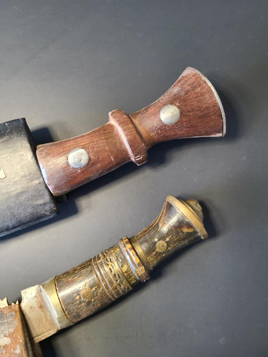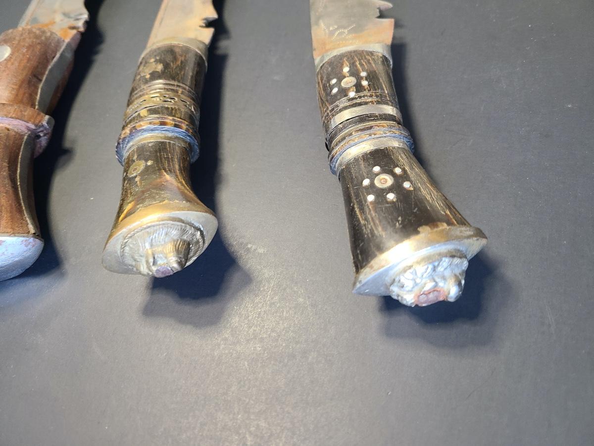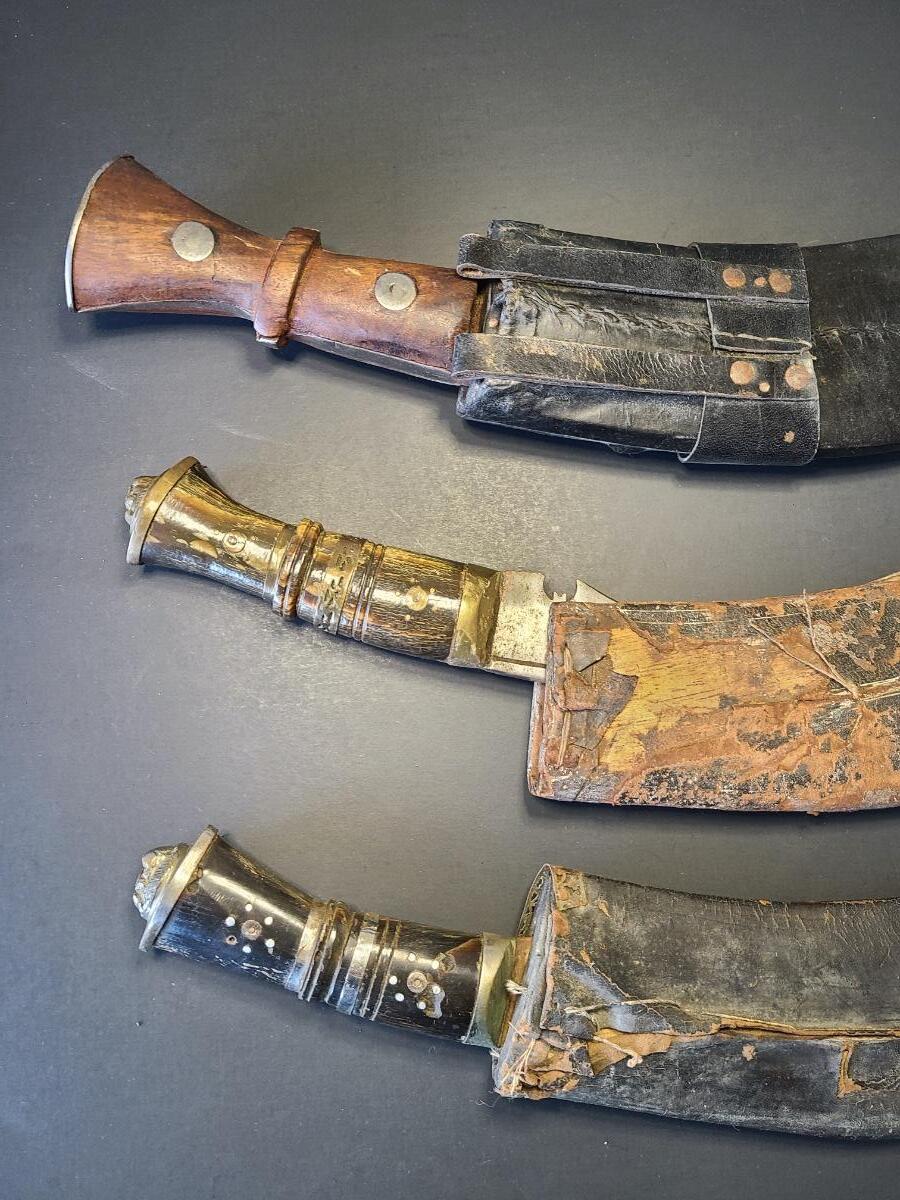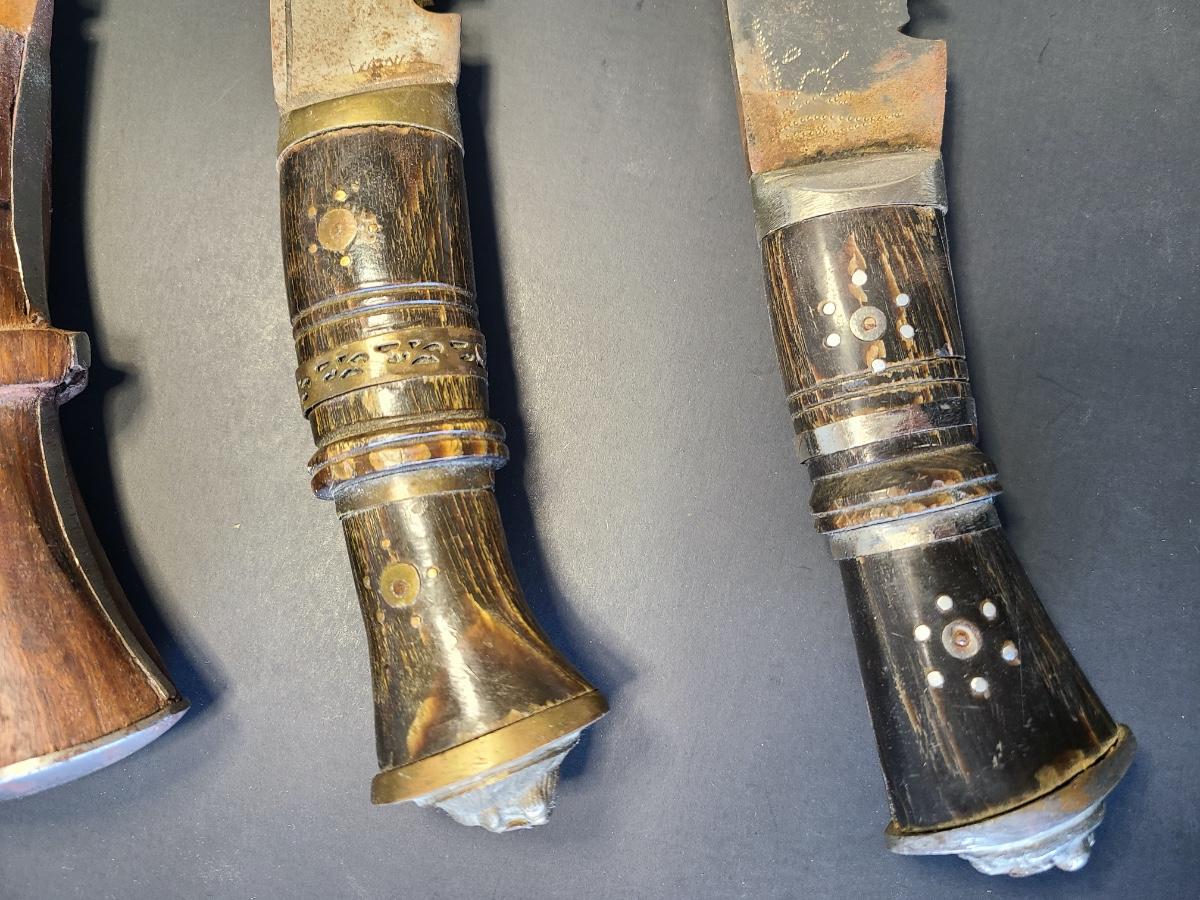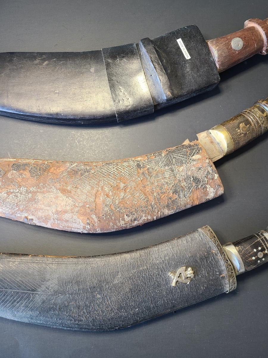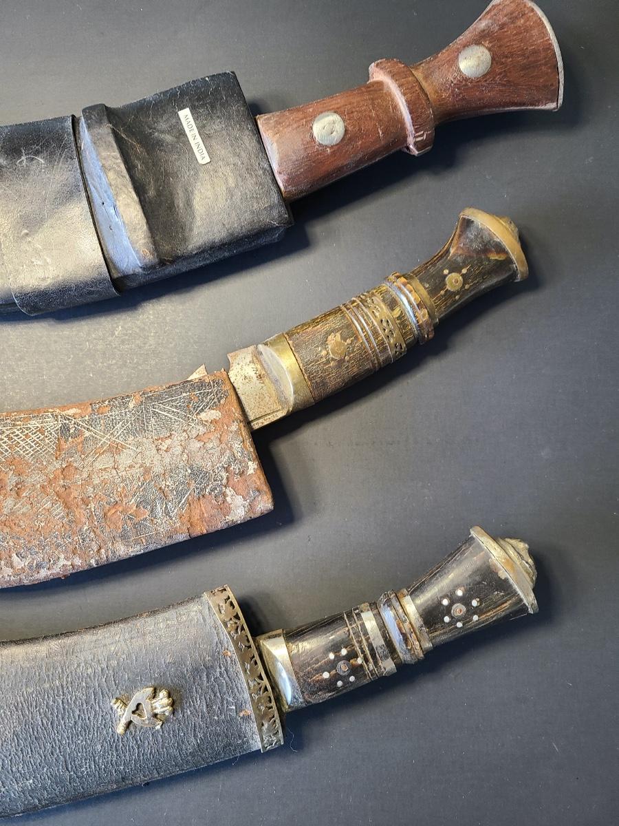 Vintage Kukri knives from the Indian subcontinent, traditionally uses as a machete multipurpose tool as a weapon or as a cutting tool in South Asia. One is marked India. Please see all pictures as they are the best representation of the items. The pictures show condition, measurements if taken, and what is included in the lot. Due to the large amount that we photograph and the time frame, we are not always able to take measurements. All items unless noted, are pre-owned and have been used. If you purchased furniture, you must bring help. We do not allow one person to carry large furniture out on their own. Bring help, tools and a truck for the safety of our client’s homes, and your personal safety. Any damages that result to the property including walls, and floors due to moving of the furniture will be charged to the buyer. Company policy. Thank you.
