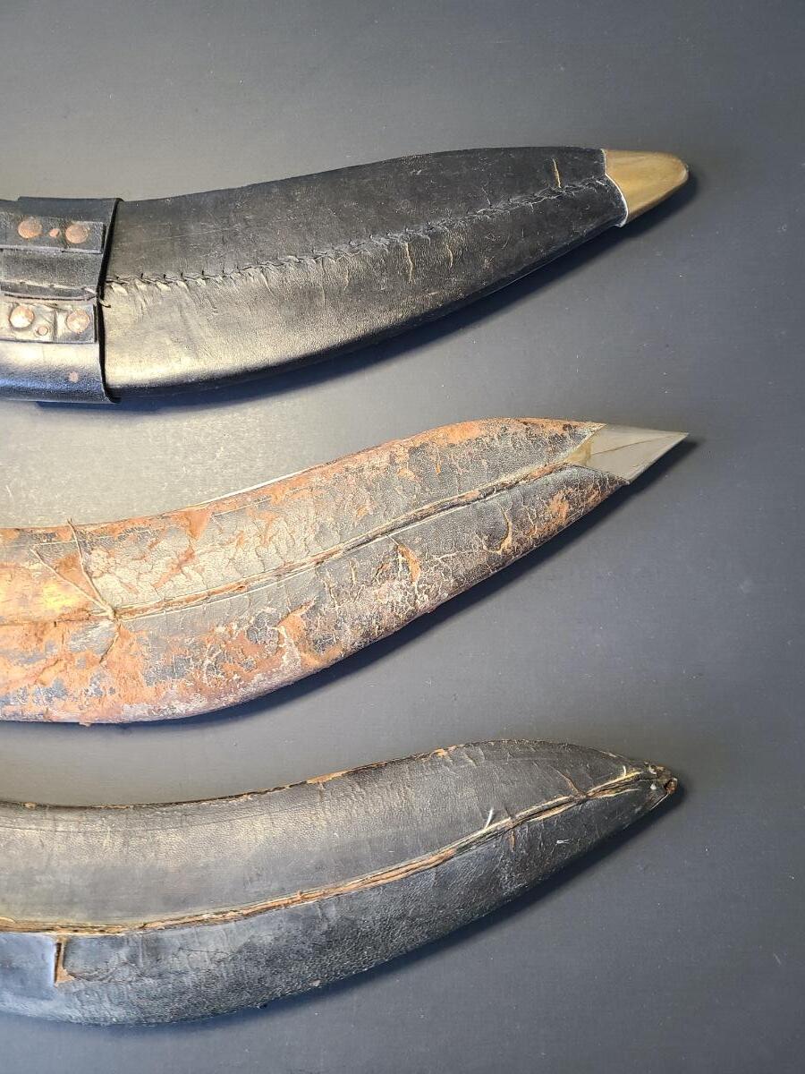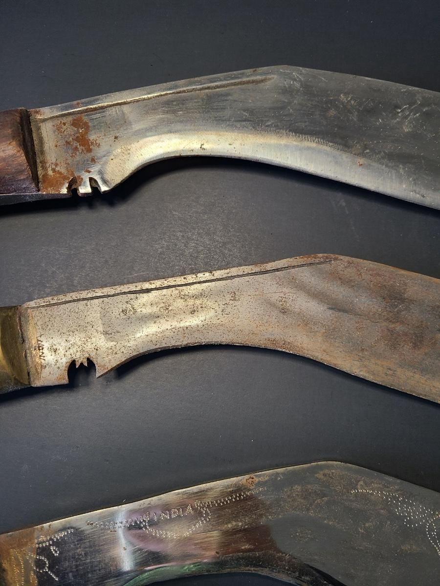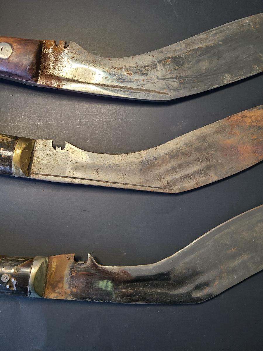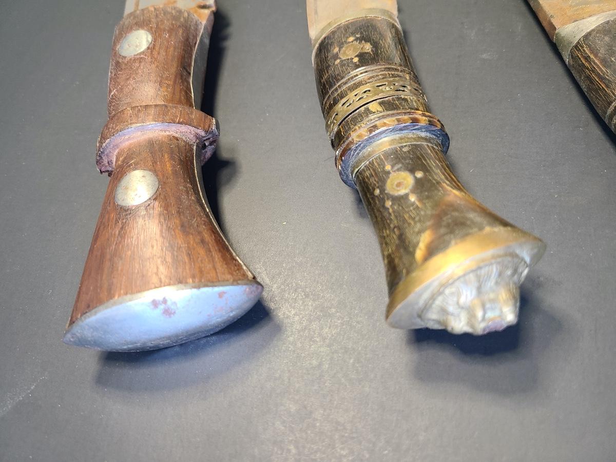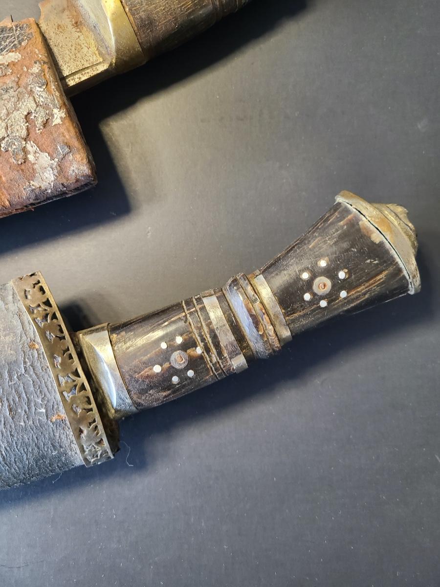 Vintage Kukri knives from the Indian subcontinent, traditionally uses as a machete multipurpose tool as a weapon or as a cutting tool in South Asia. One is marked India. Please see all pictures as they are the best representation of the items. The pictures show condition, measurements if taken, and what is included in the lot. Due to the large amount that we photograph and the time frame, we are not always able to take measurements. All items unless noted, are pre-owned and have been used. If you purchased furniture, you must bring help. We do not allow one person to carry large furniture out on their own. Bring help, tools and a truck for the safety of our client’s homes, and your personal safety. Any damages that result to the property including walls, and floors due to moving of the furniture will be charged to the buyer. Company policy. Thank you.